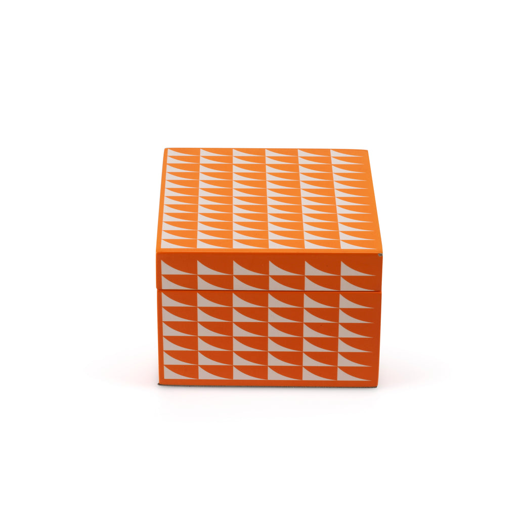 Details: Orange / white box with pattern on sides / top. Grey felt interior. Available in 2 other sizes - rented separately (see last pic)....