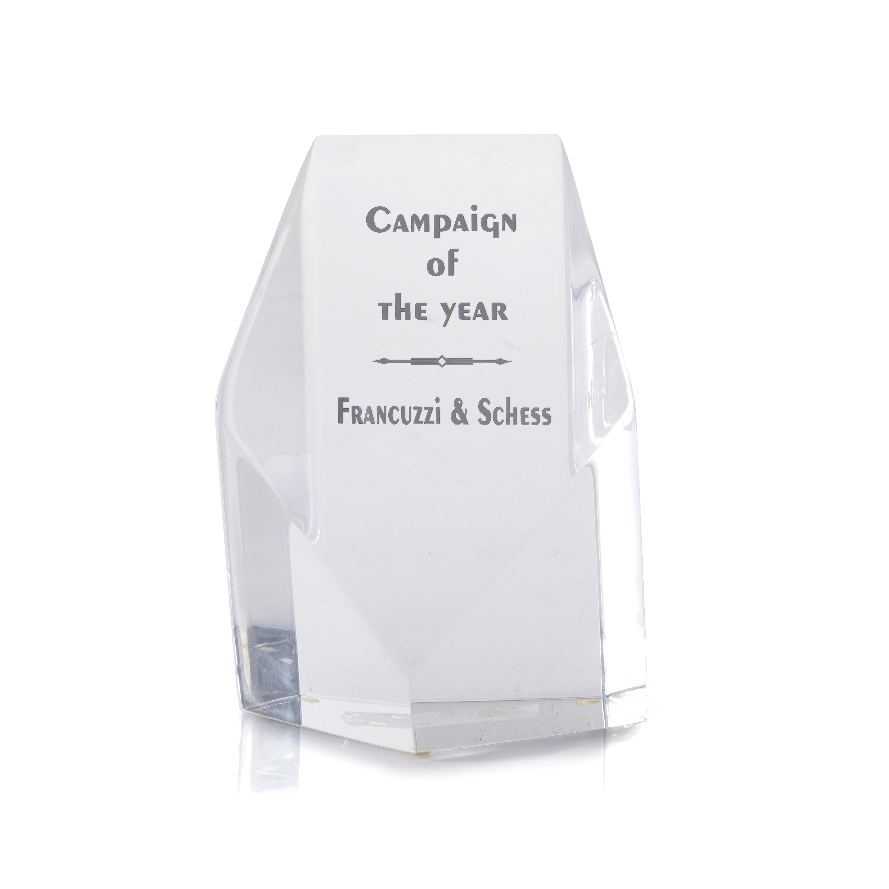 Details: Clear Glass Campaign of the Year Trophy Award Dimensions: 7" H x 5" W x 3" D Quantity: 1