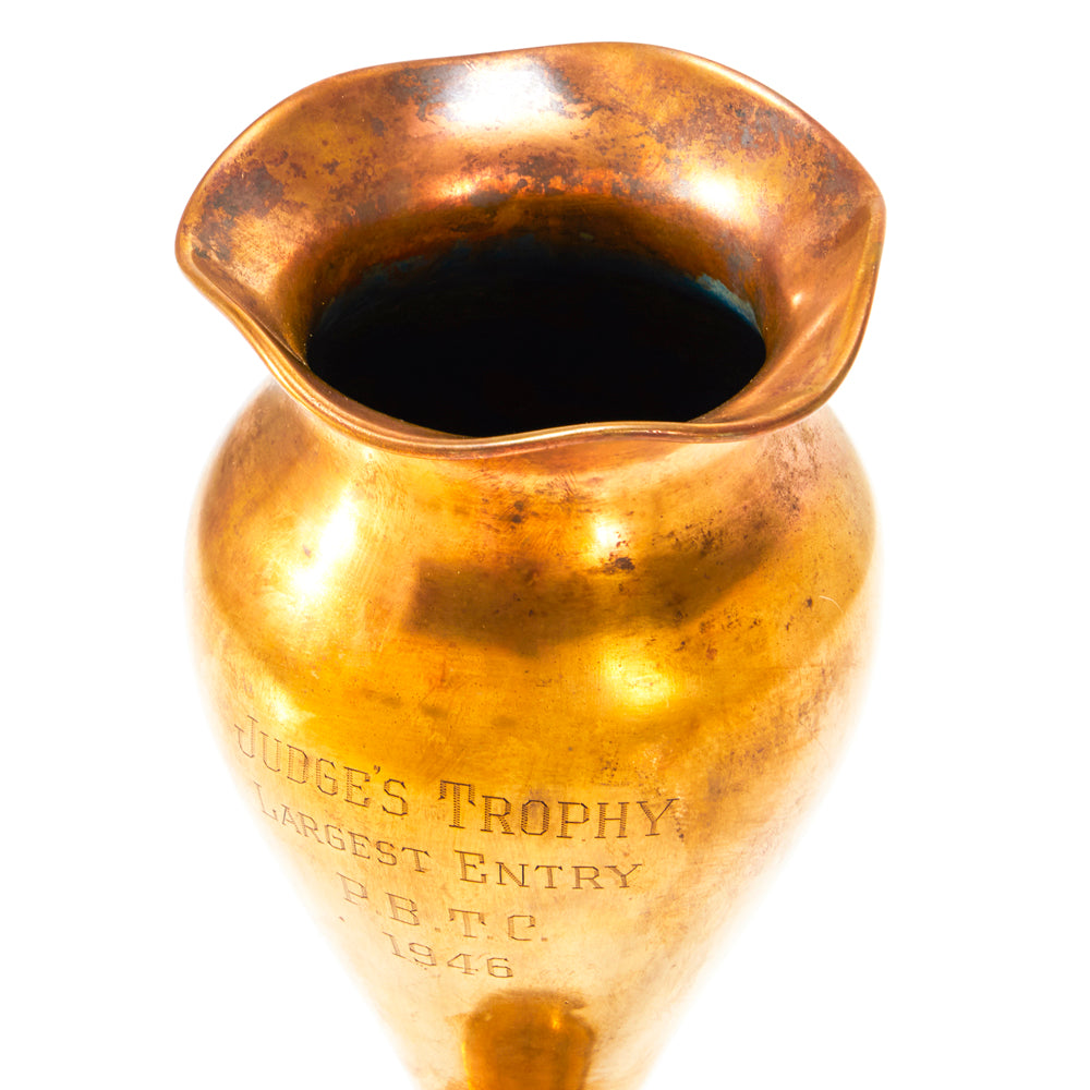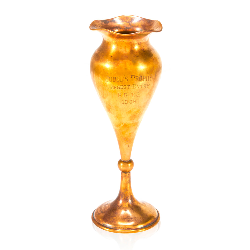 Details: Gold trophy reading "Judge's Trophy Largest Entry P.B.T.C 1946" Dimensions: 11" H x 4.5" W x 4.5" D Quantity: 1