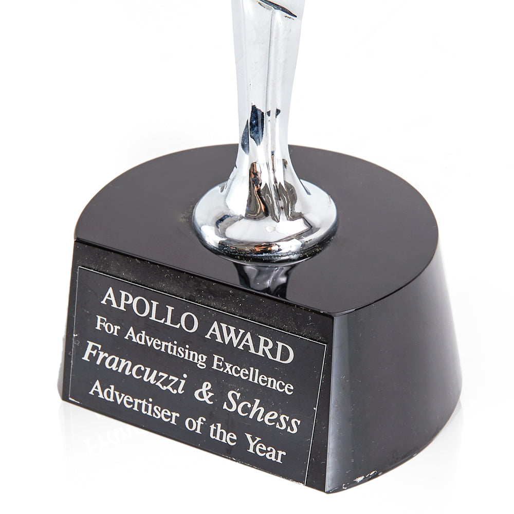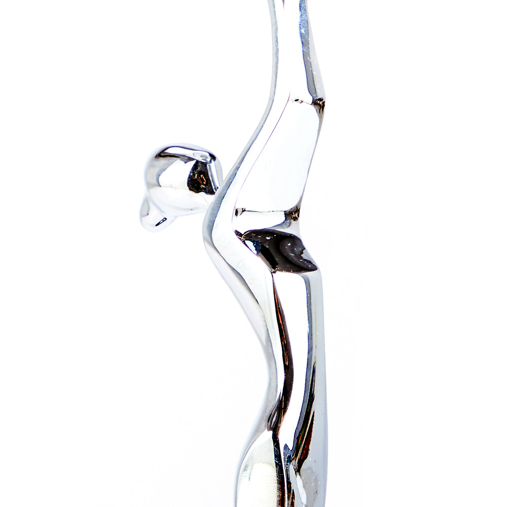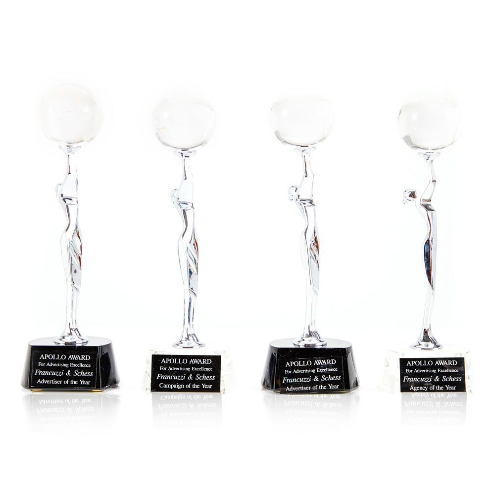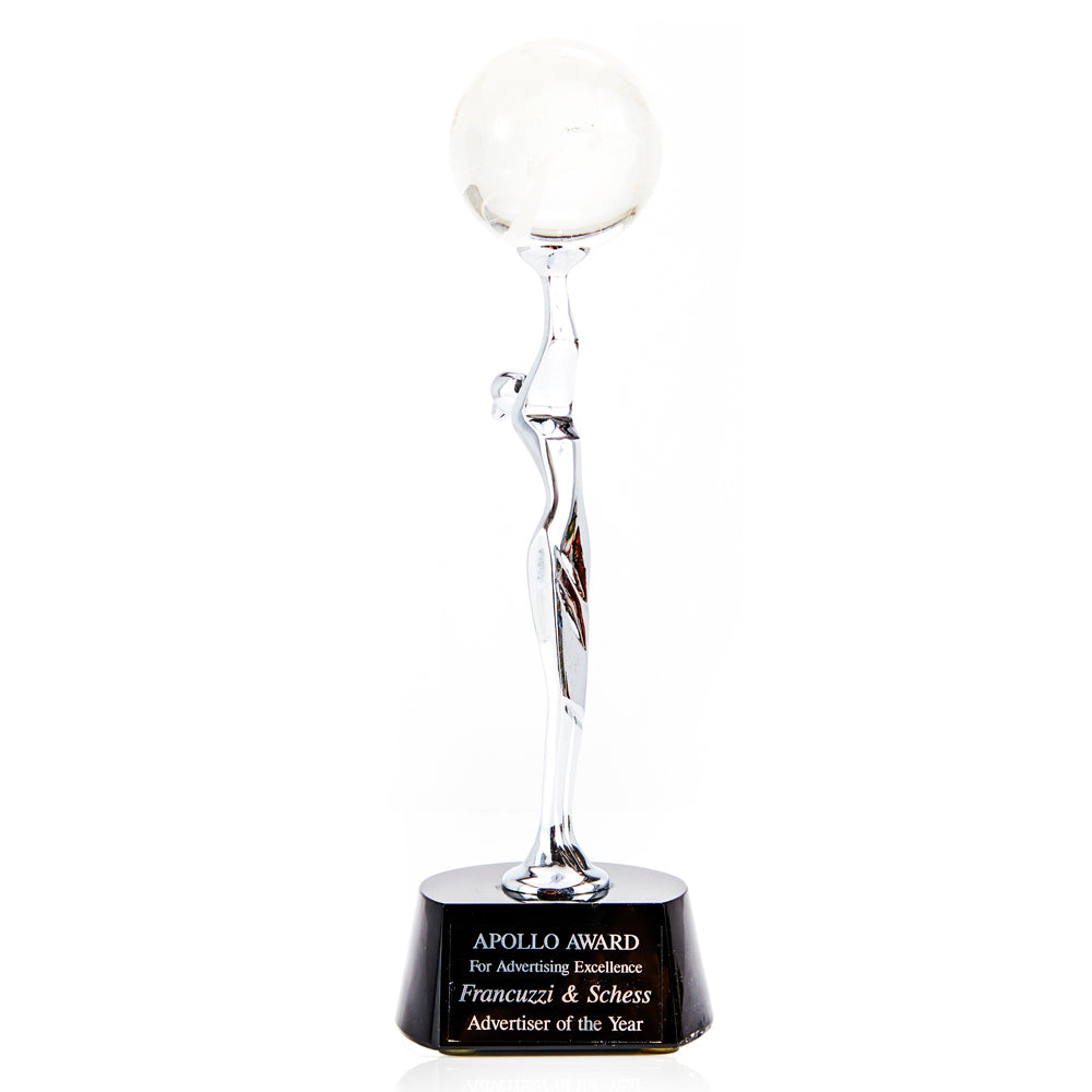 Details: Silver Deco Figure holding large glass globe sculpture / award / trophy Dimensions: 15" H x 5" W x 4" D Quantity: 4