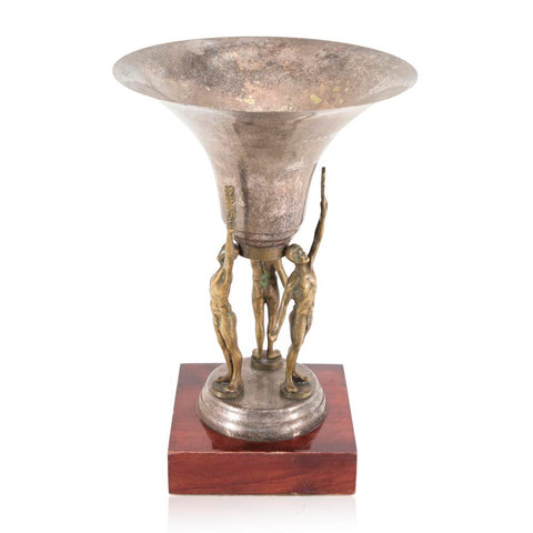 Details: Silver trophy of a feminine figure reaching upward with one arm, inscription contains information about award