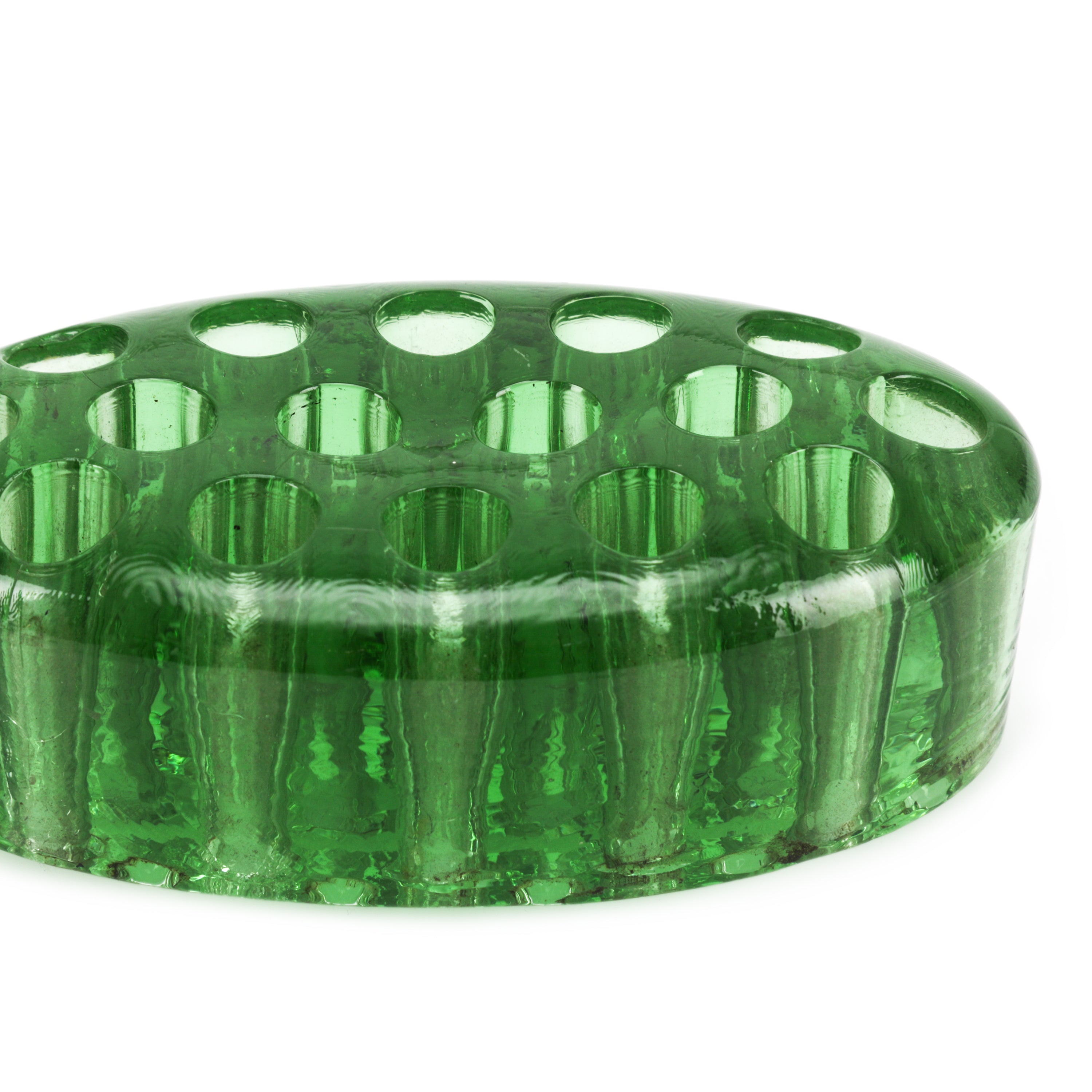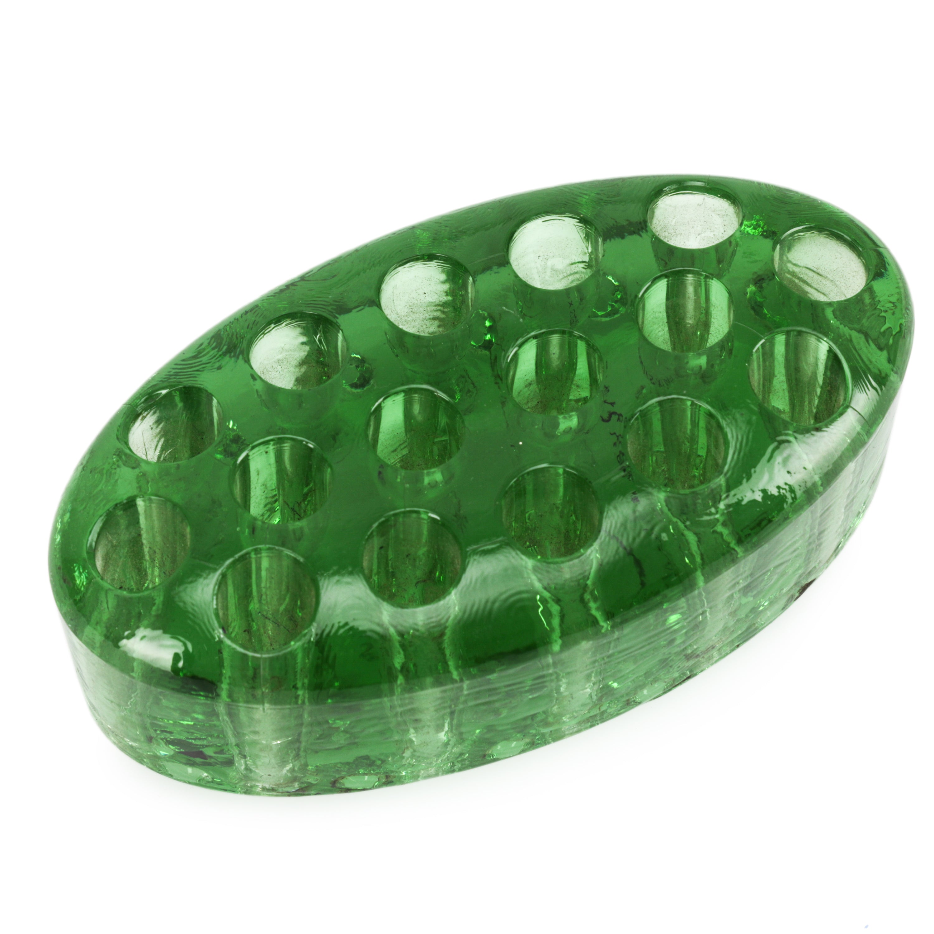 Details: Vintage oval-shaped glass pen holder. Dimensions: 2" H x 5" W x 3" D