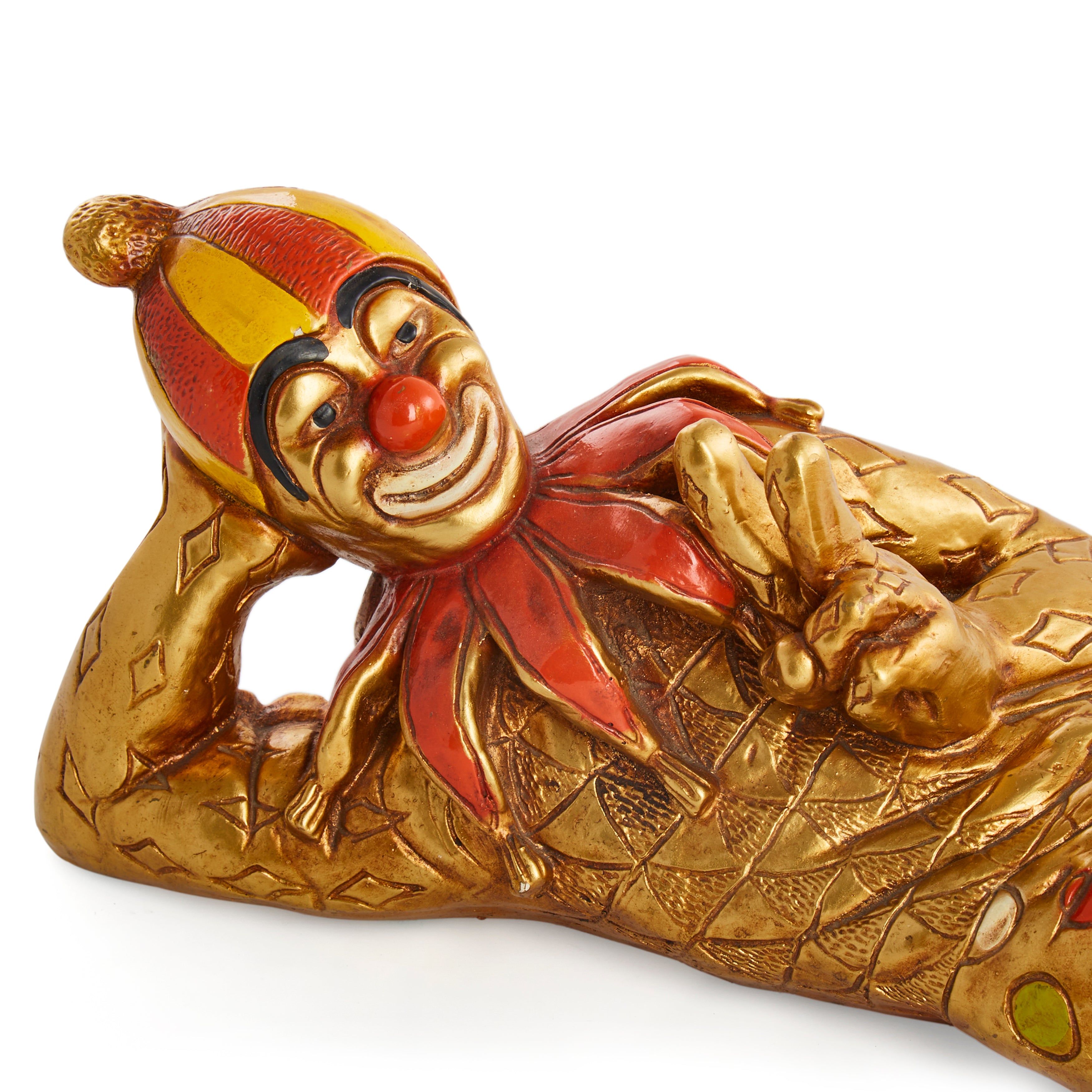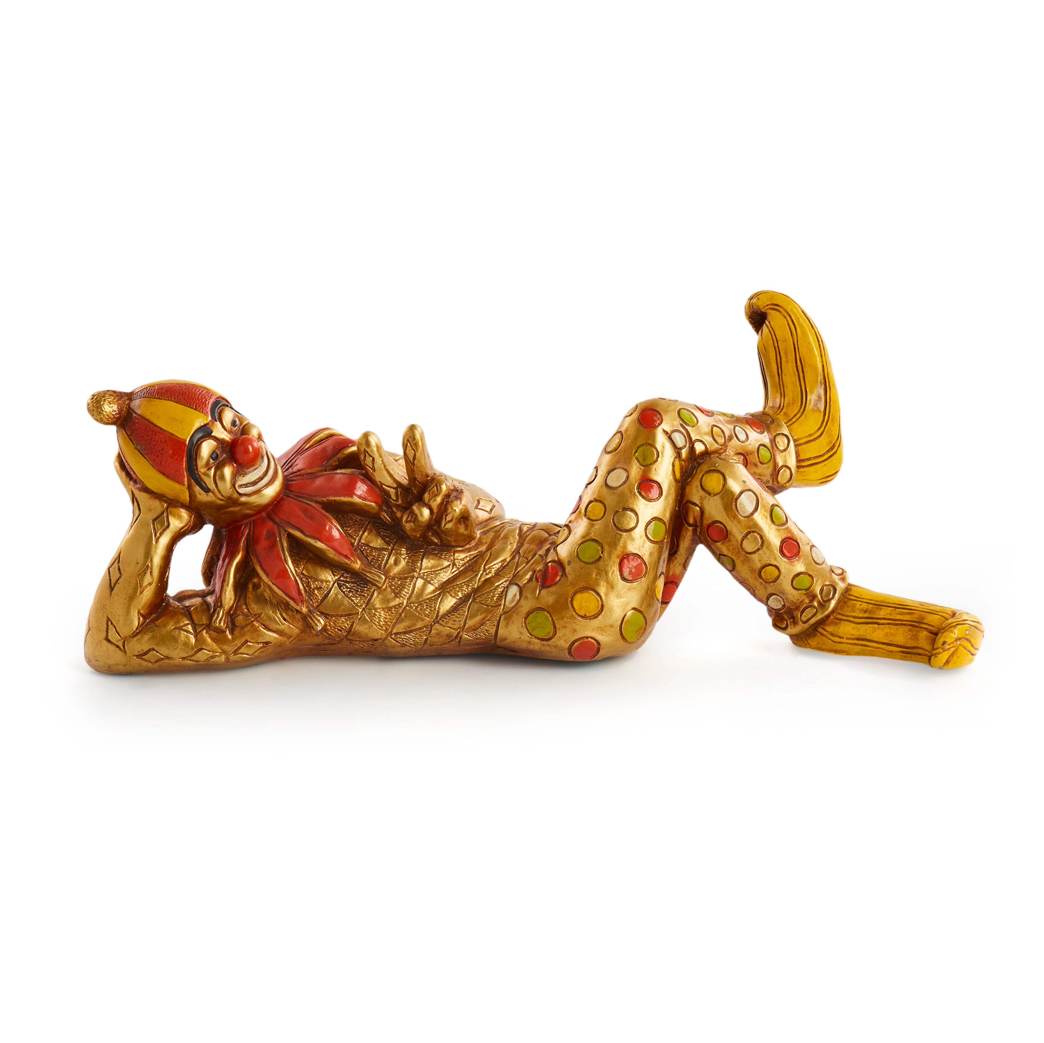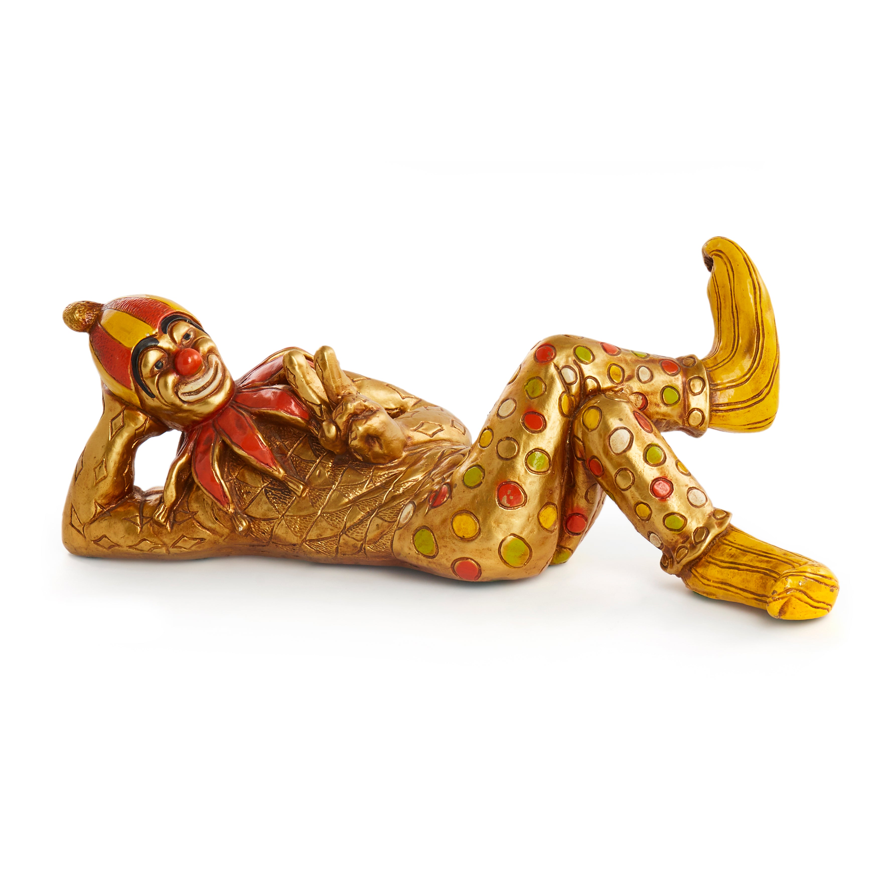 Details: Gold painted lounging clown showing peace sign Dimensions: 7" H x 23" W x 11" D
