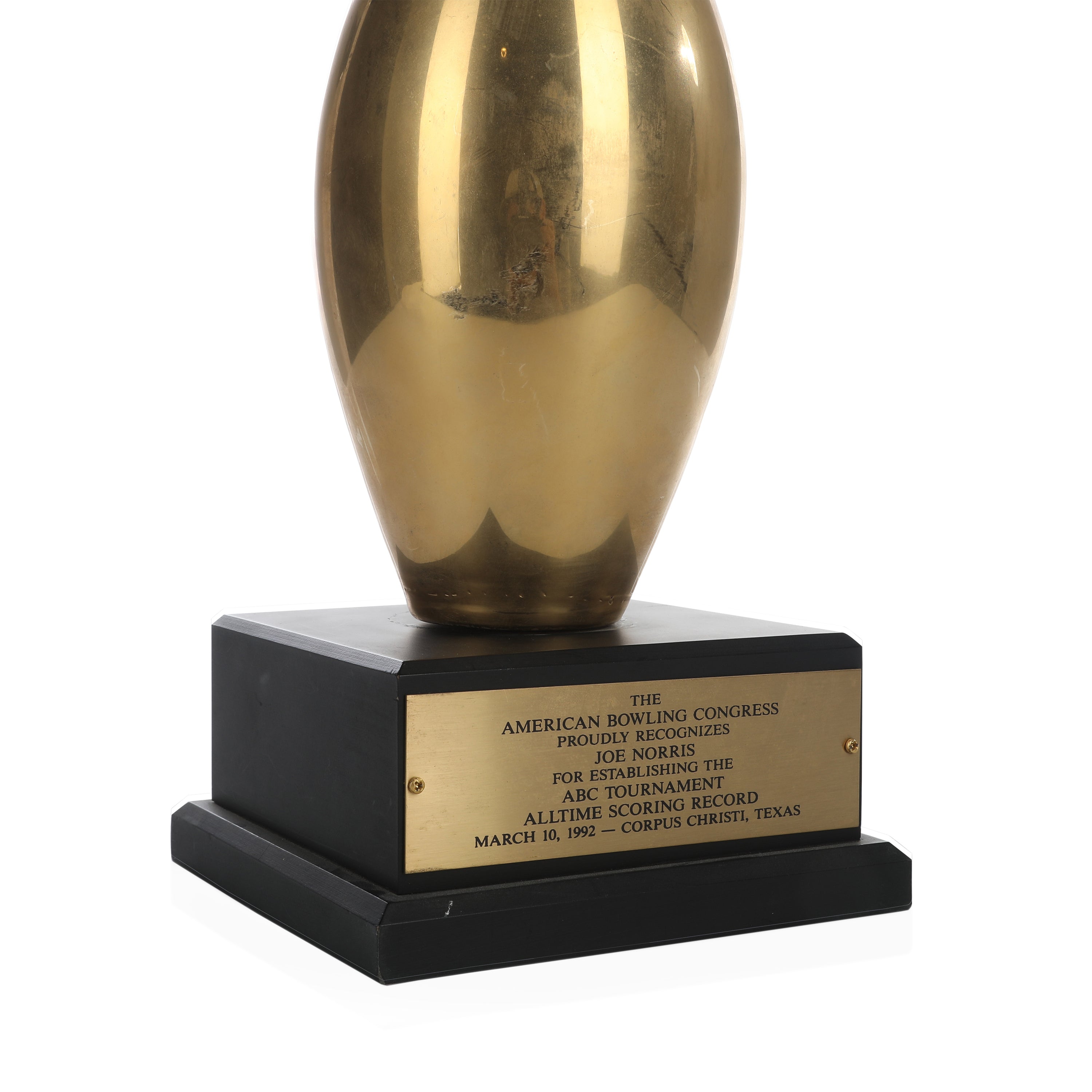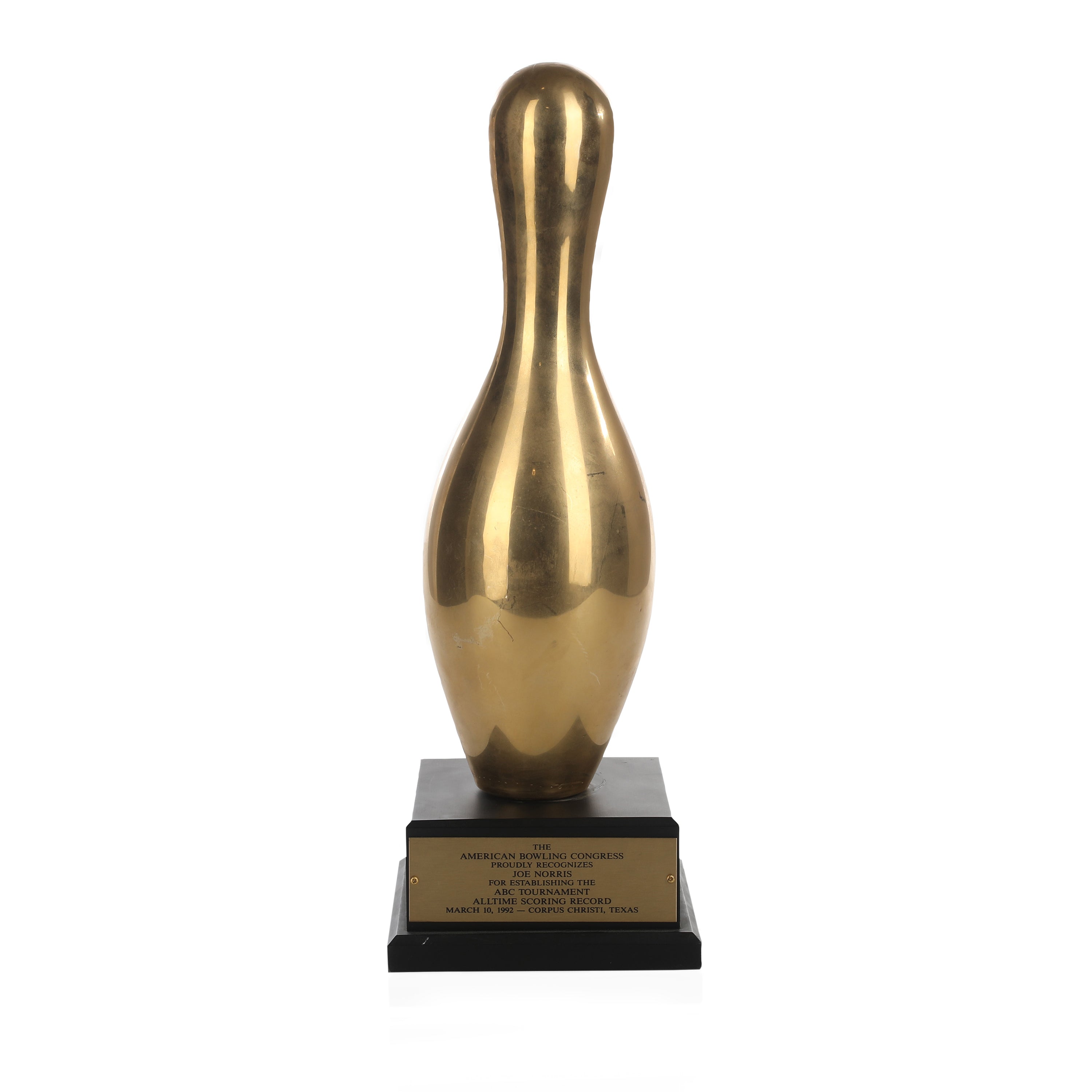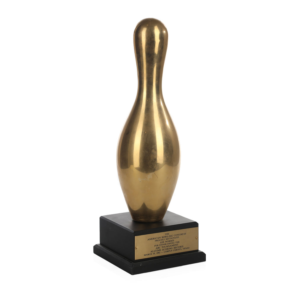 Details: Gold bowling pin trophy on black base