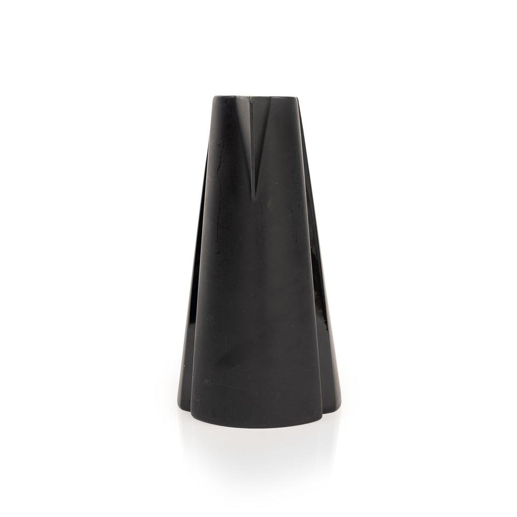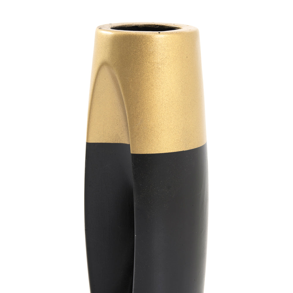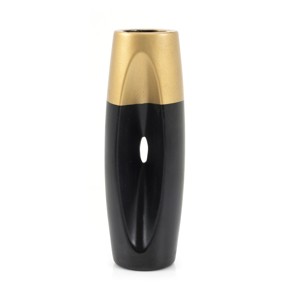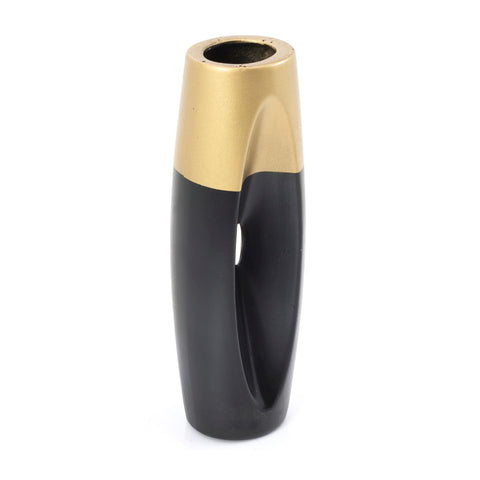 Details: Black and gold metal vase with concave indent/cutout Dimensions: 12.5" H x 4" W x 5" D Quantity: 1