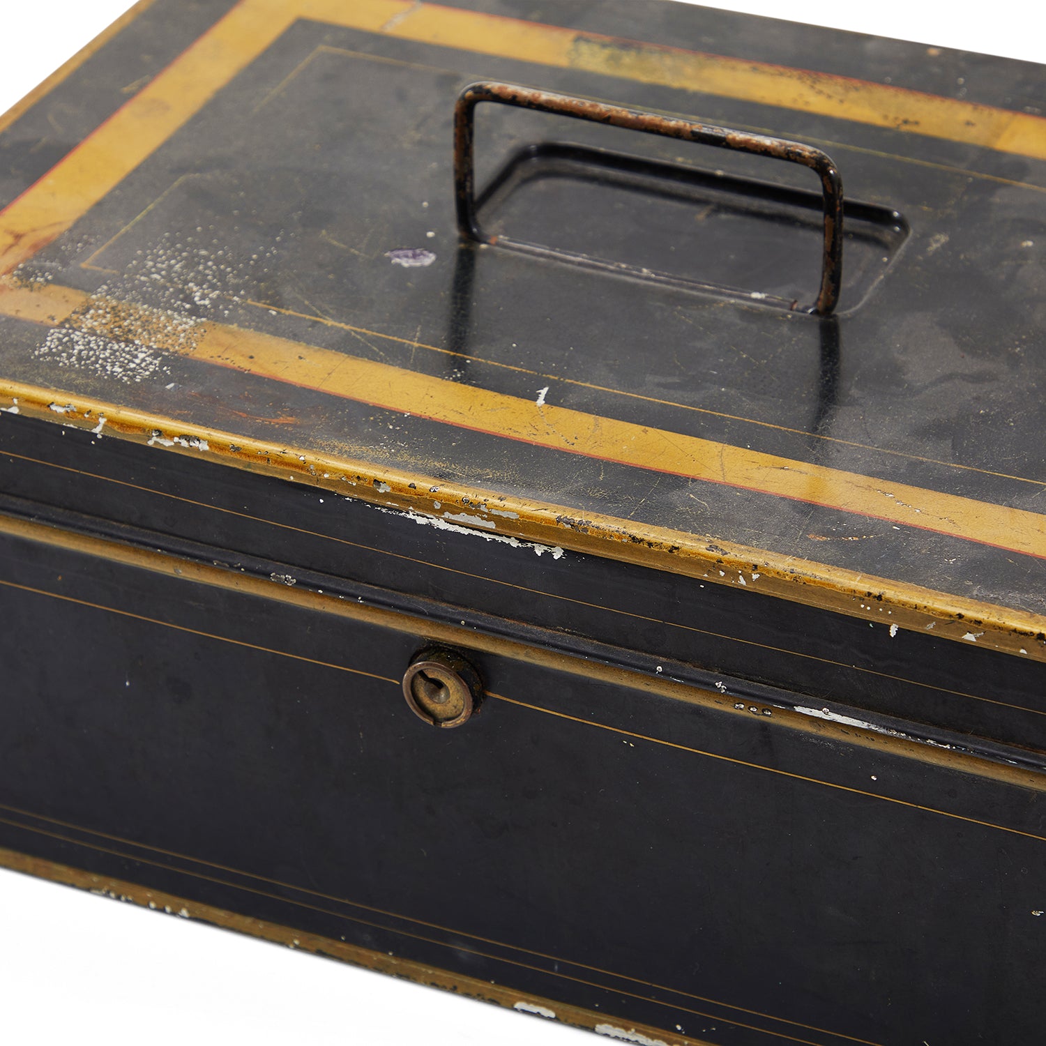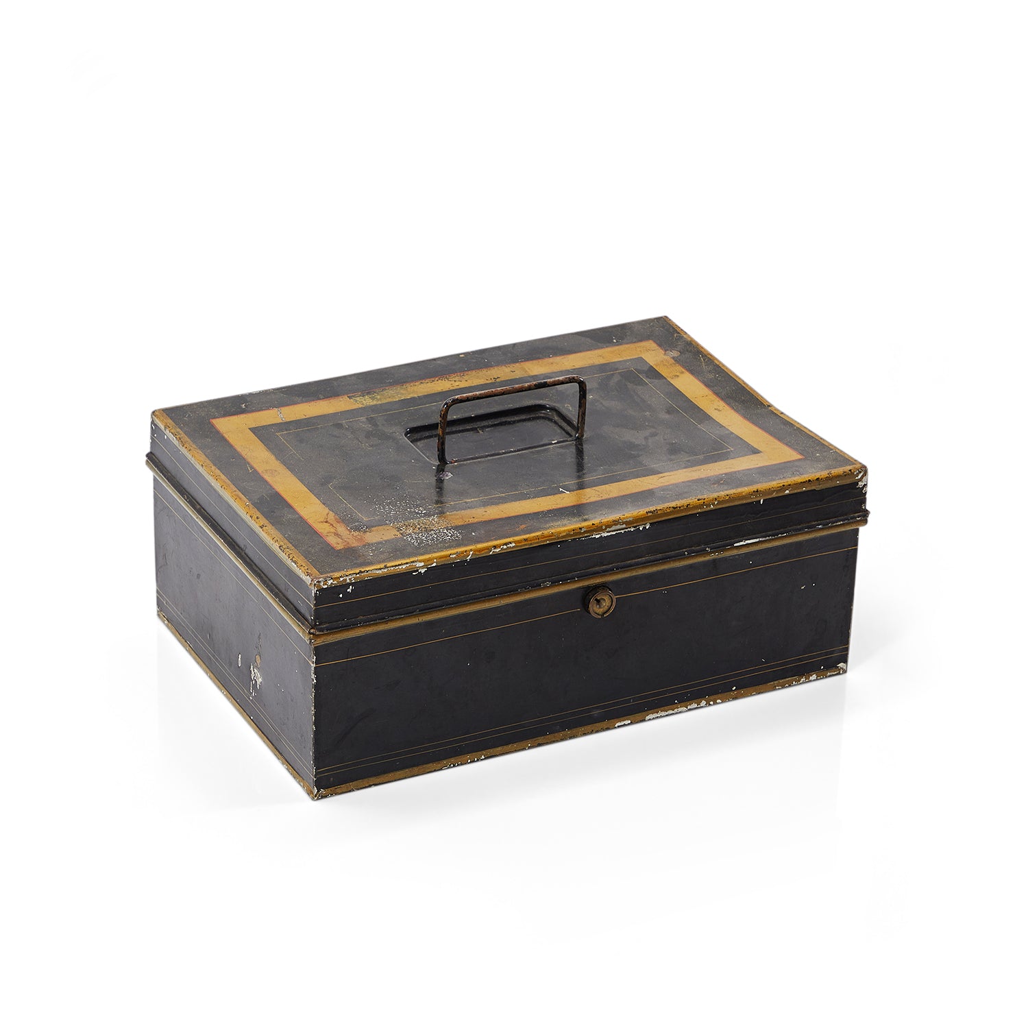 Details: Black and gold rustic tin box with swivel handle and lock Dimensions: 5" H x 12" W x 8" D
