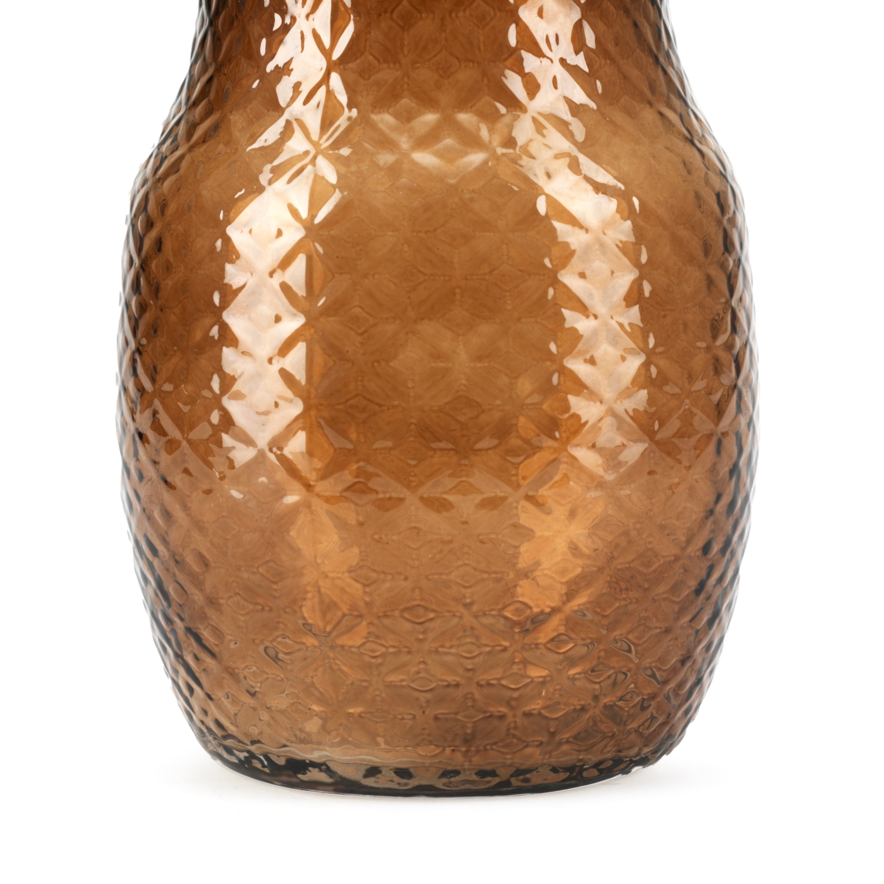Details: Small, transparent, brown glass vase with a short, bumpy body and a wide neck Dimensions: 4.5" H x 3" W x 3" D