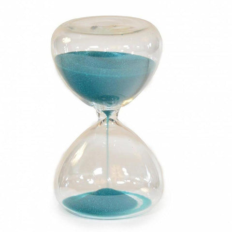 Details: Thin glass hourglass with light blue sand Dimensions: 4.25" H X 2.5" Diameter