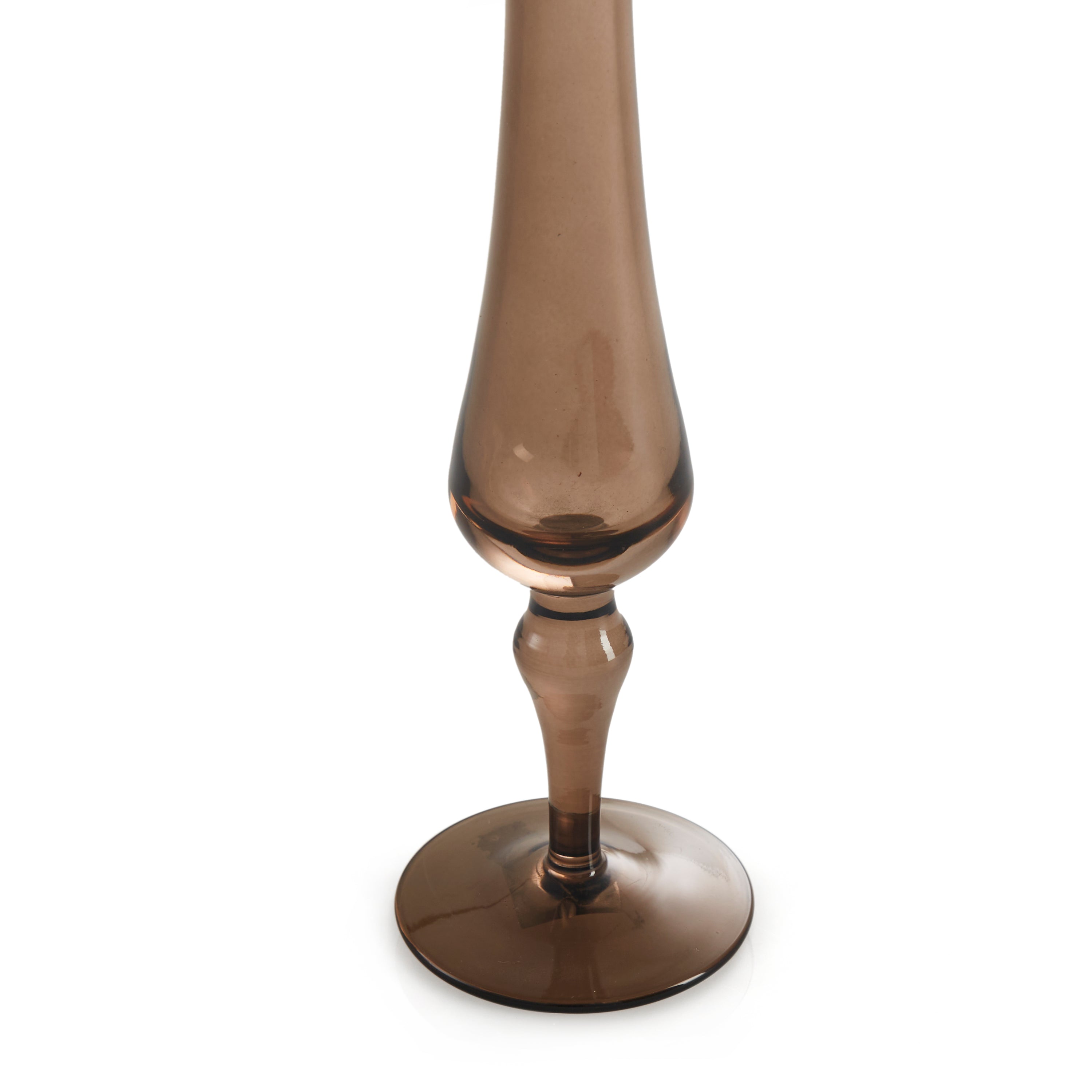 Details: Brown glass vase with a slim hourglass shape Dimensions: 11" H x 3" D