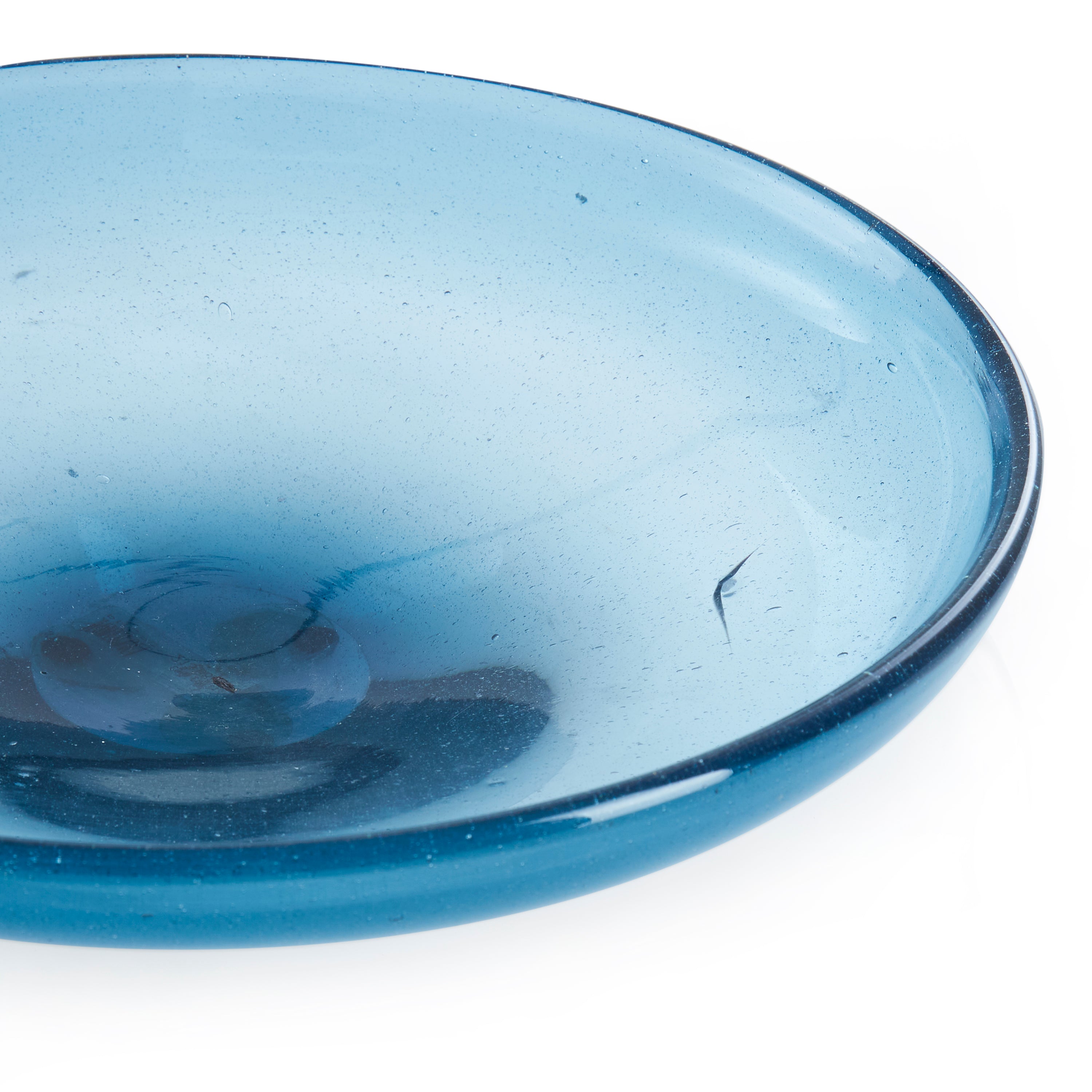 Details: Shallow blue tinted glass serving bowl Dimensions: 3" H x 12" D
