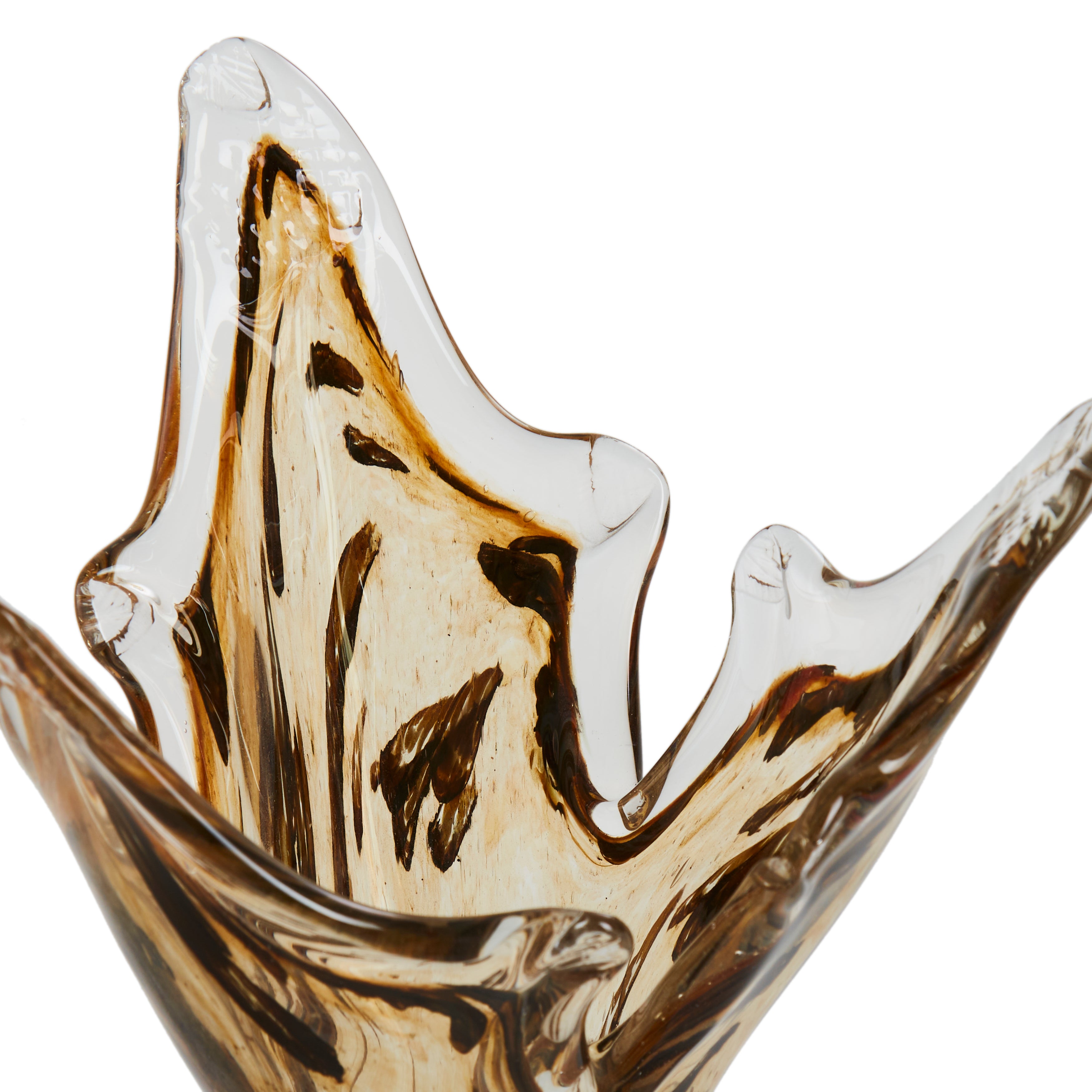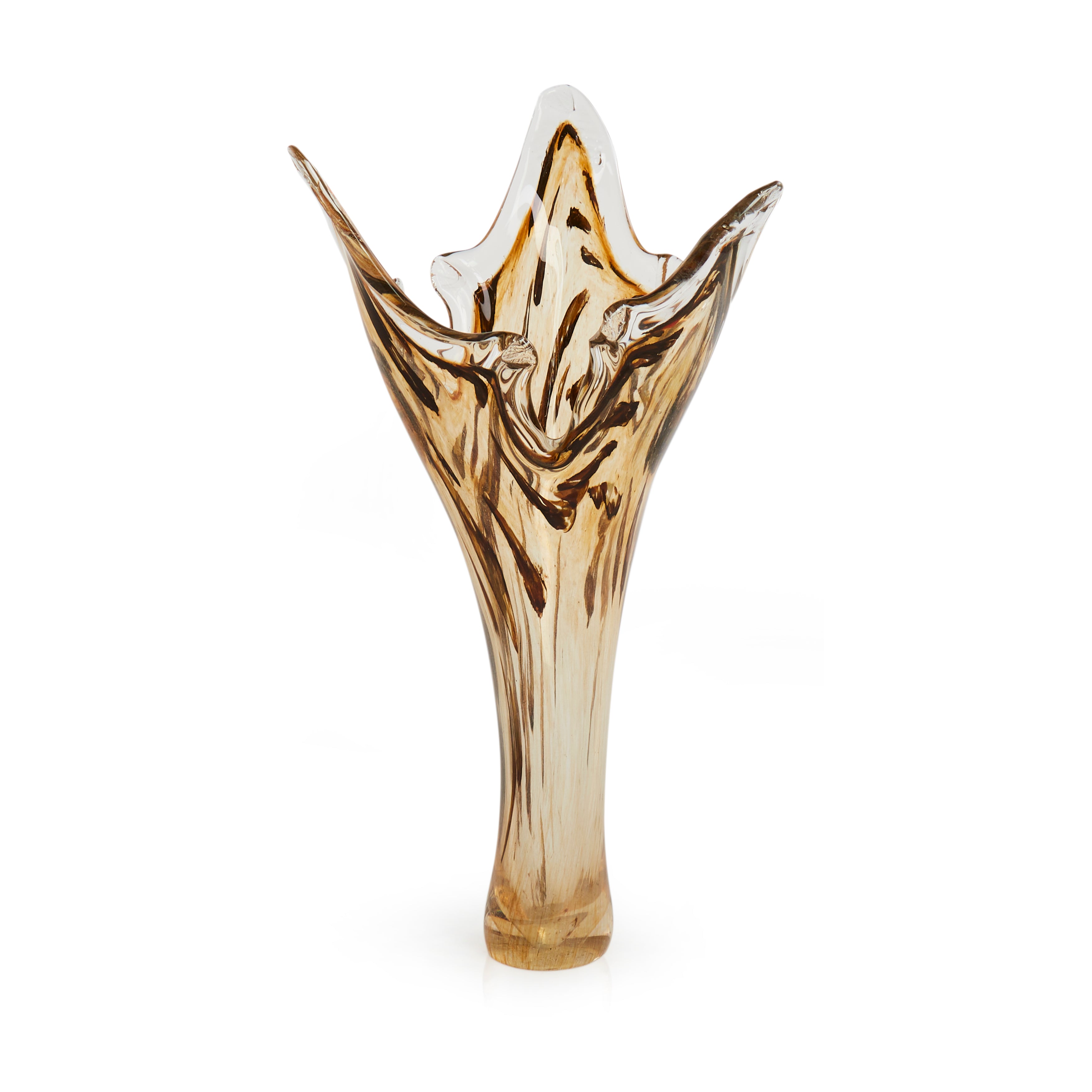 Details: Blown glass vase with an amber tone *One of the tips has been chipped due to damage from a previous job. Price is, as...