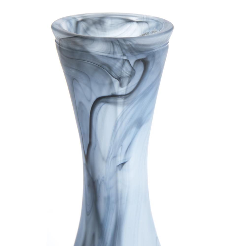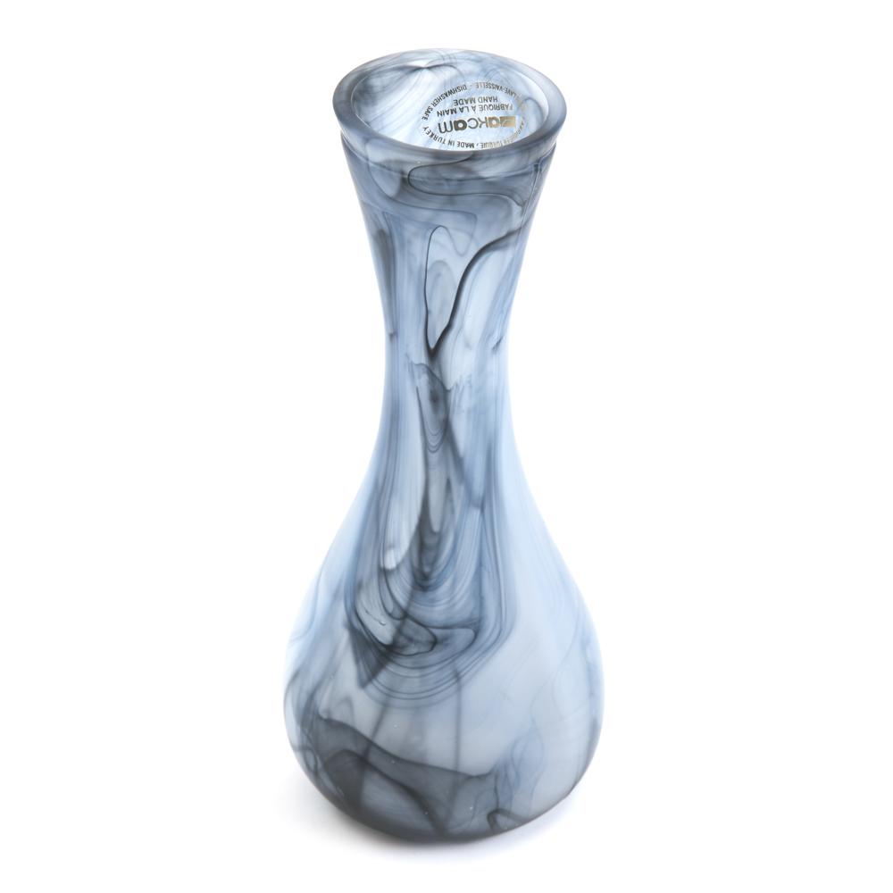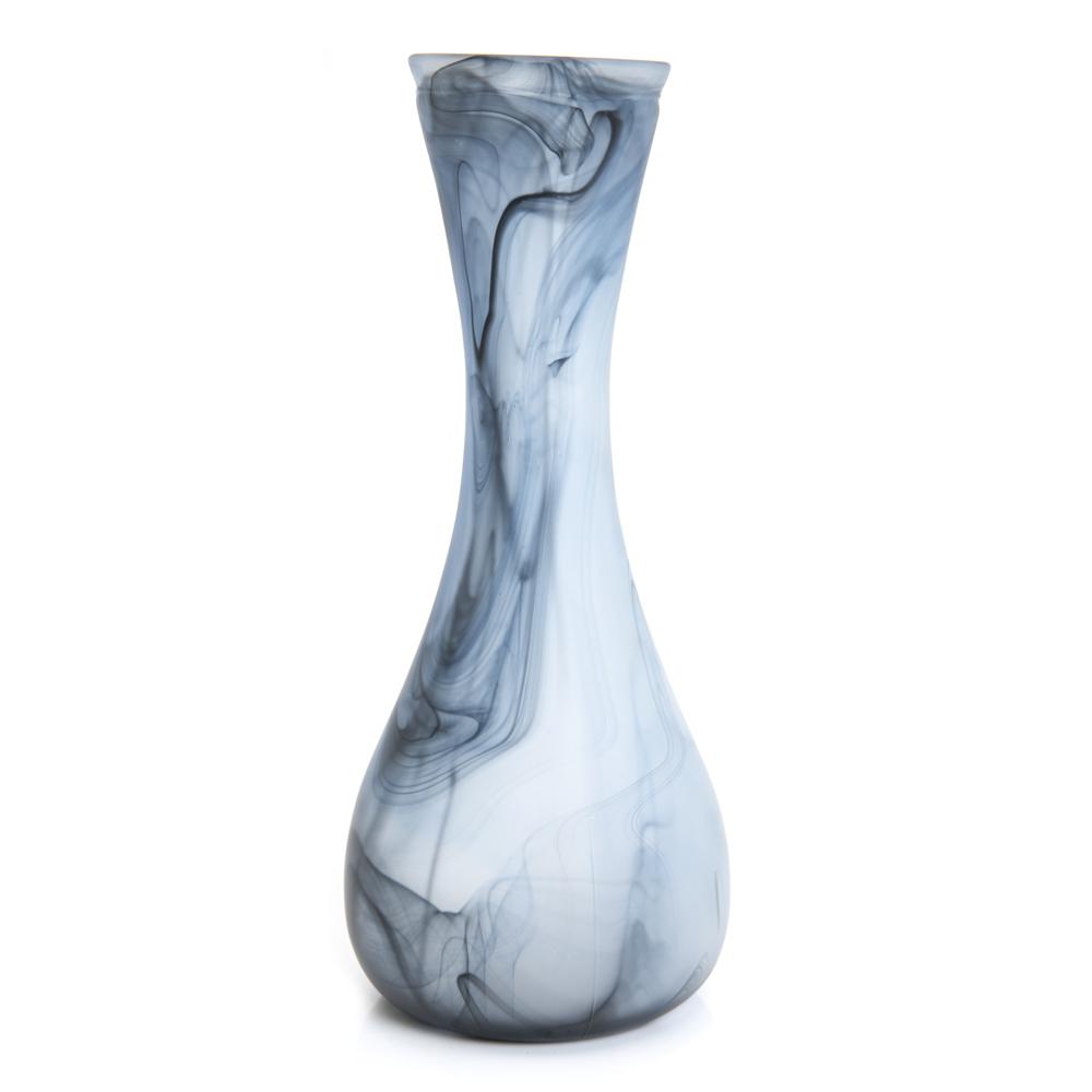 Details: Glass vase with black smoke-like detail. Dimensions: 9" H x 4" W 4" D