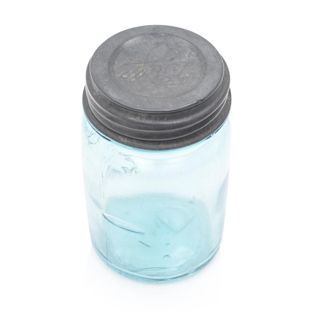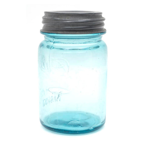 Details: Blue glass mason jar. Dimensions: 5.5" H x 3" W x 3" D