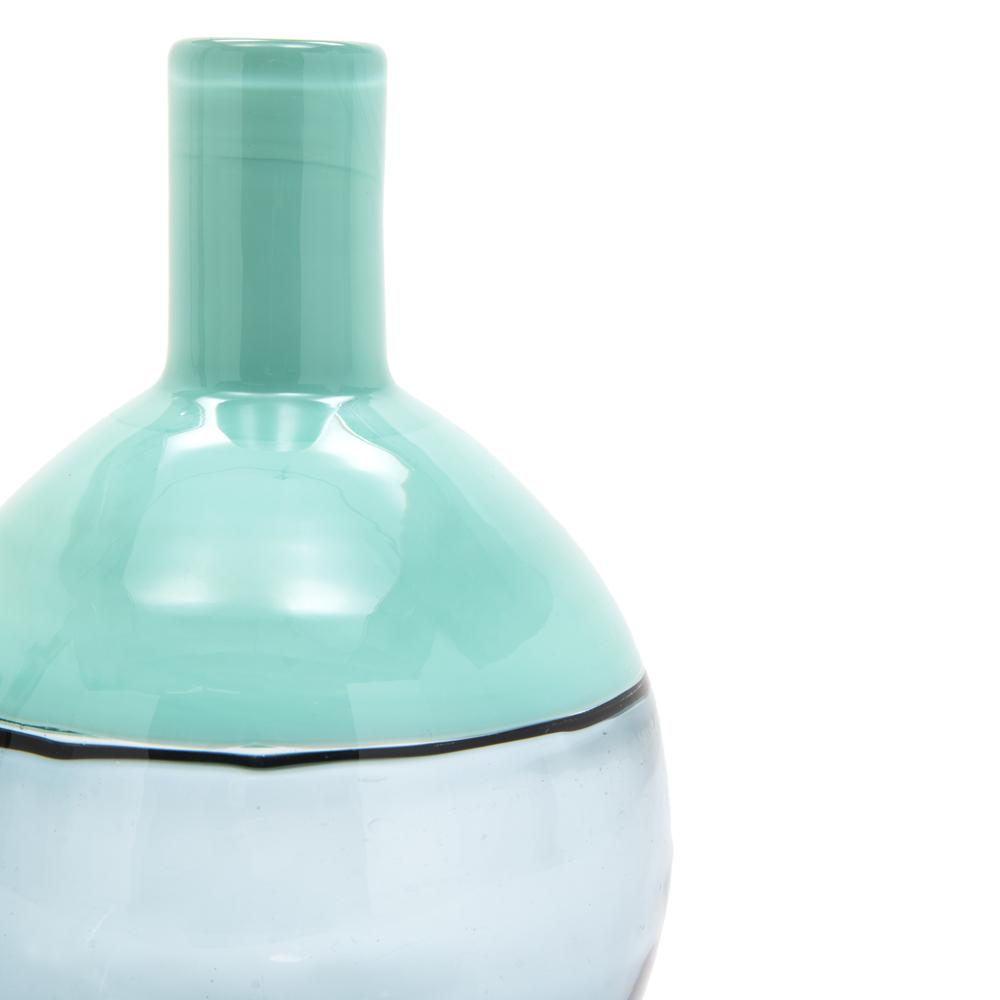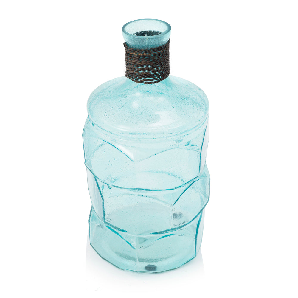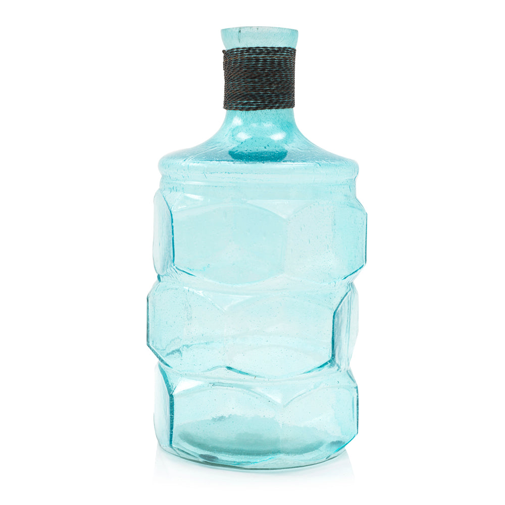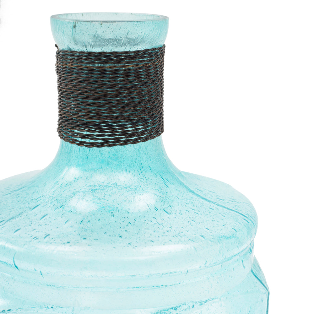 Description : Aqua blue water bottle shaped glass vase with cord decoration at neck. Dimensions: 12" H x 6" W x 6" D
