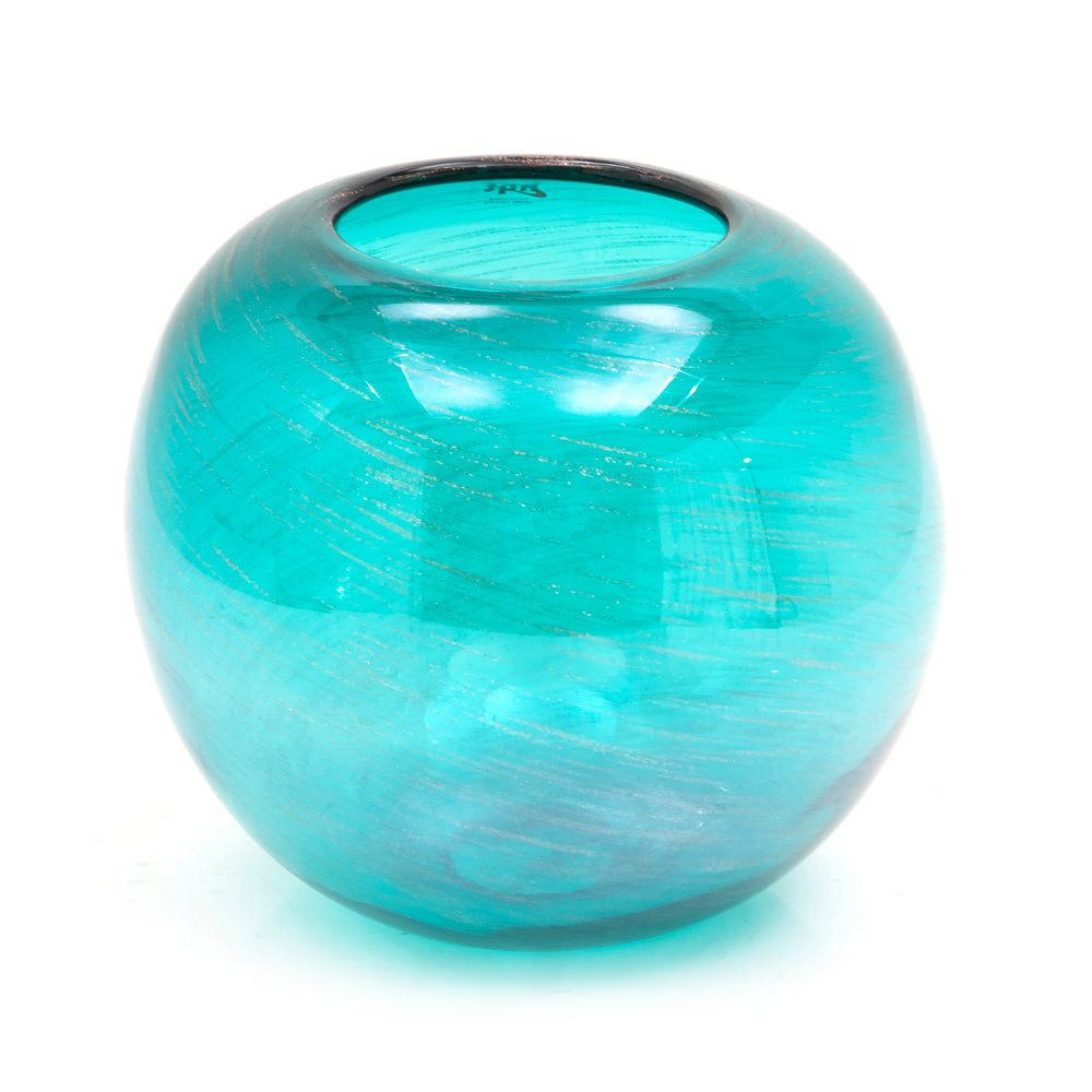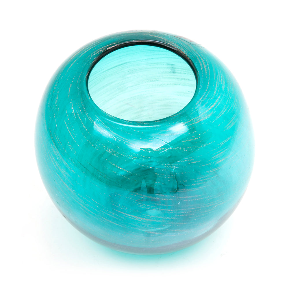 Details: Aqua blue glass vase with spherical shape. Dimensions: 3" H x 3" W x 3" D