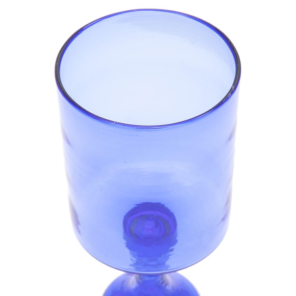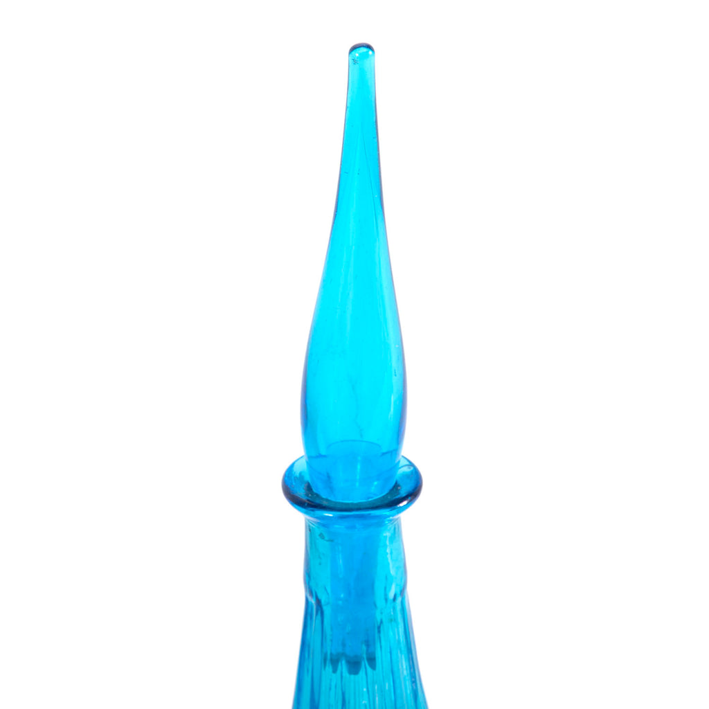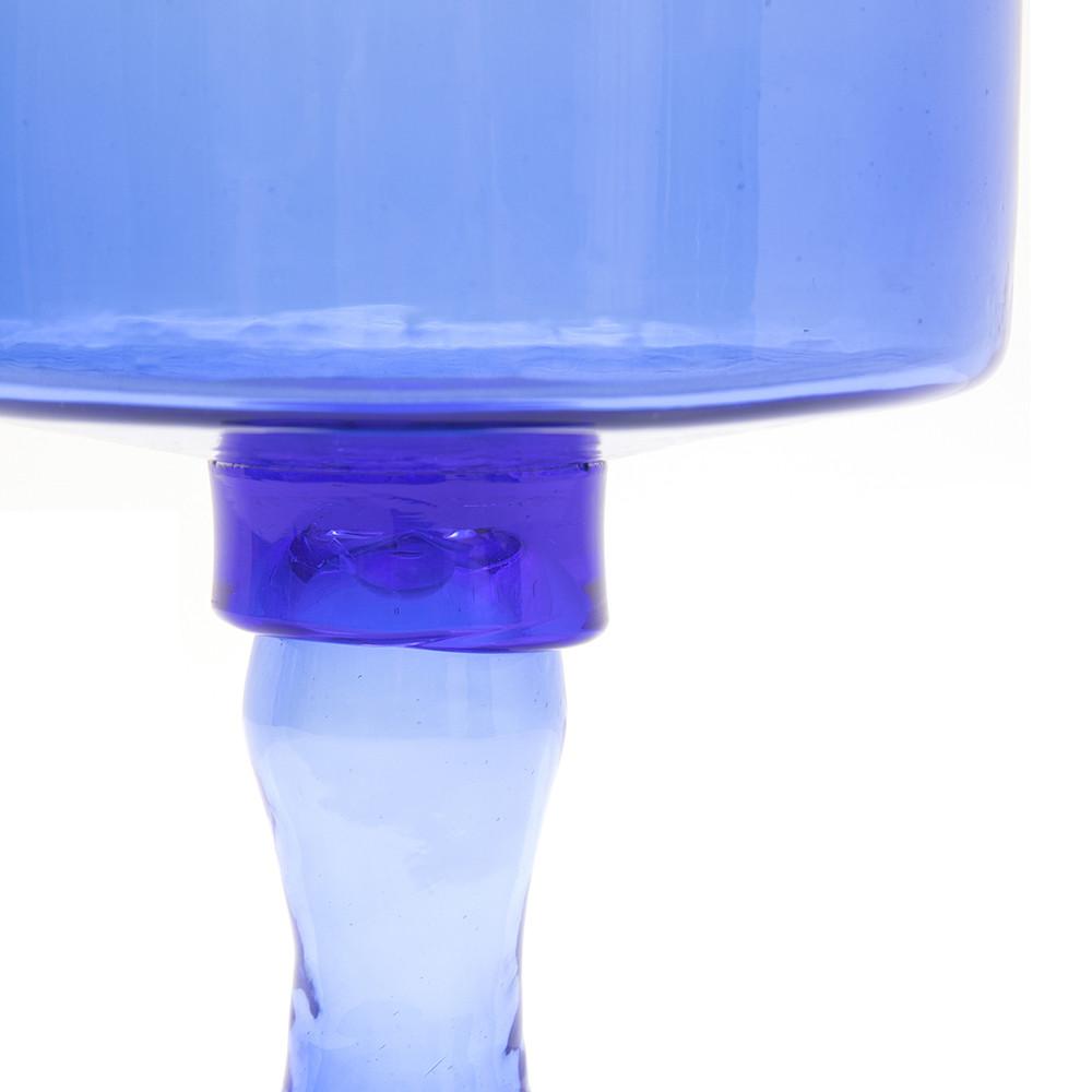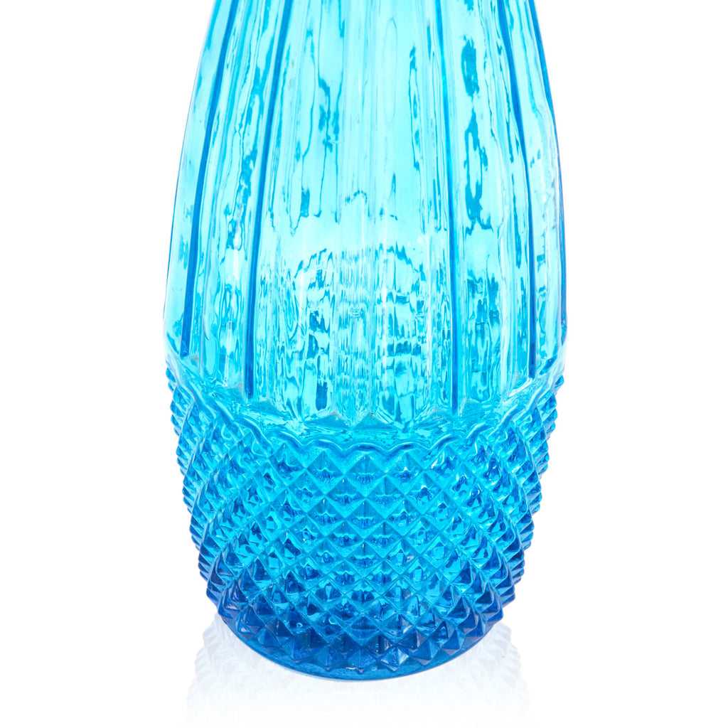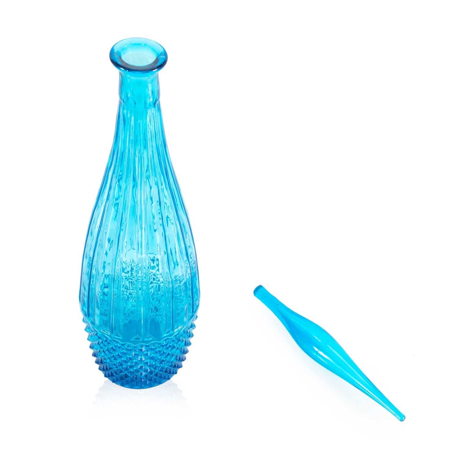 Details: Blue Cut Glass Teardrop Vase/Decanter with Pointy Stopper Dimensions: 20" H x 4.5" W x 4.5" D Quantity: 1