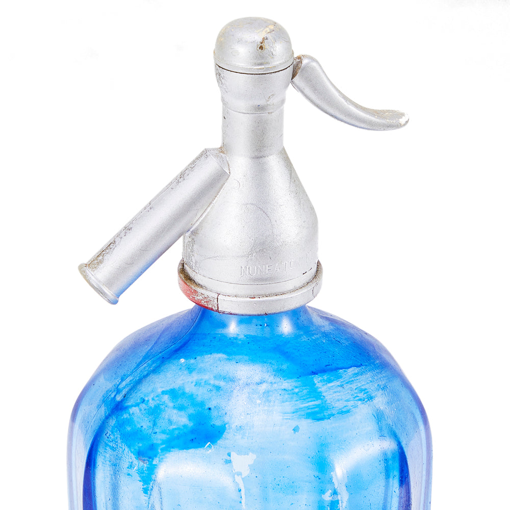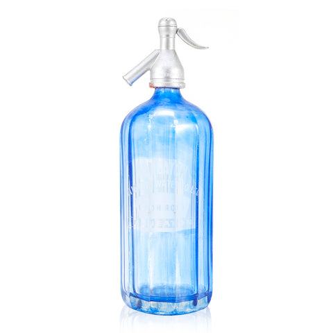 Details: Vintage blue glass seltzer bottle with faded label Dimensions: 13" H x 4" W x 4" D Quantity: 1