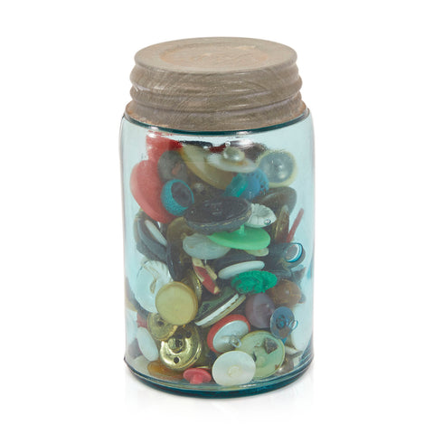 Details: A blue glass jar of buttons Dimensions: 5.5" H x 3" W x 3" D Quantity: 1
