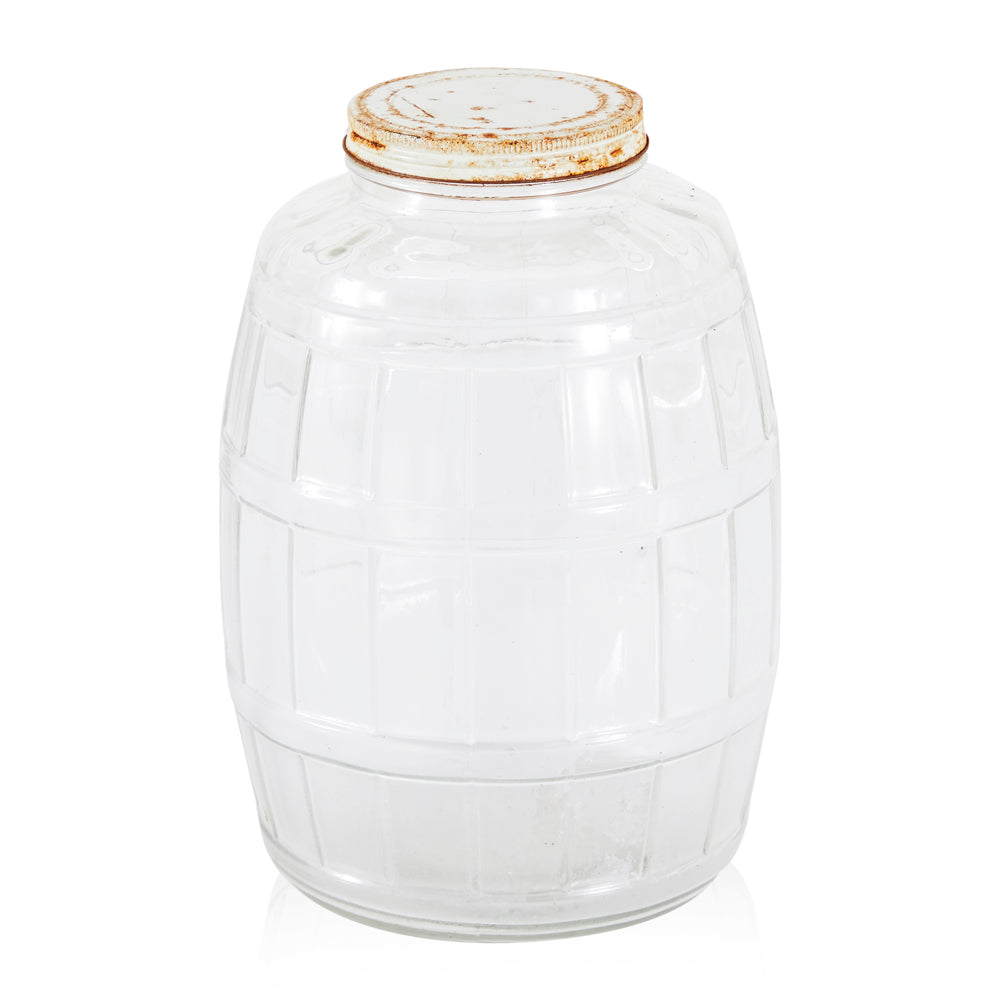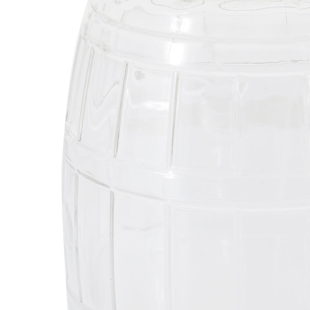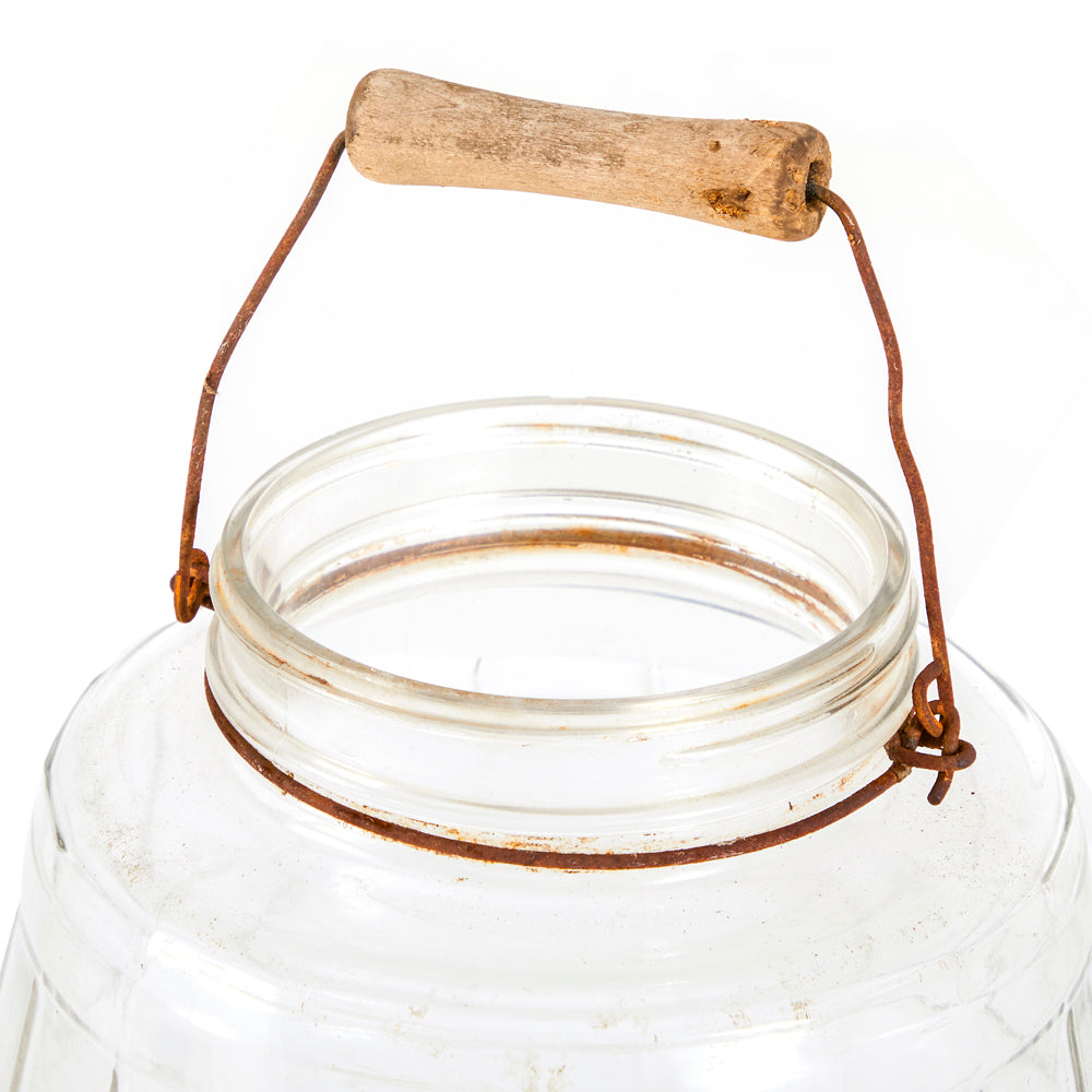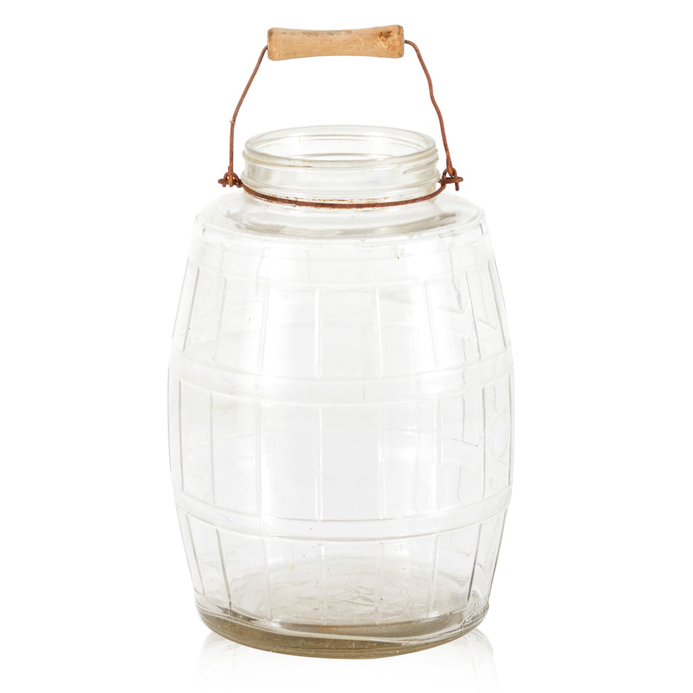 Details: Large mason jar in the shape of a barrel with wire and wood handle Dimensions: 14" H x 9" W x 9" D Quantity:...