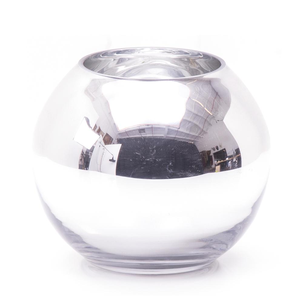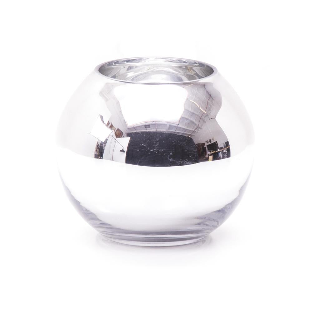 Details: Chrome and glass ball vase. Dimensions: 8" H x 6" W x 6" D