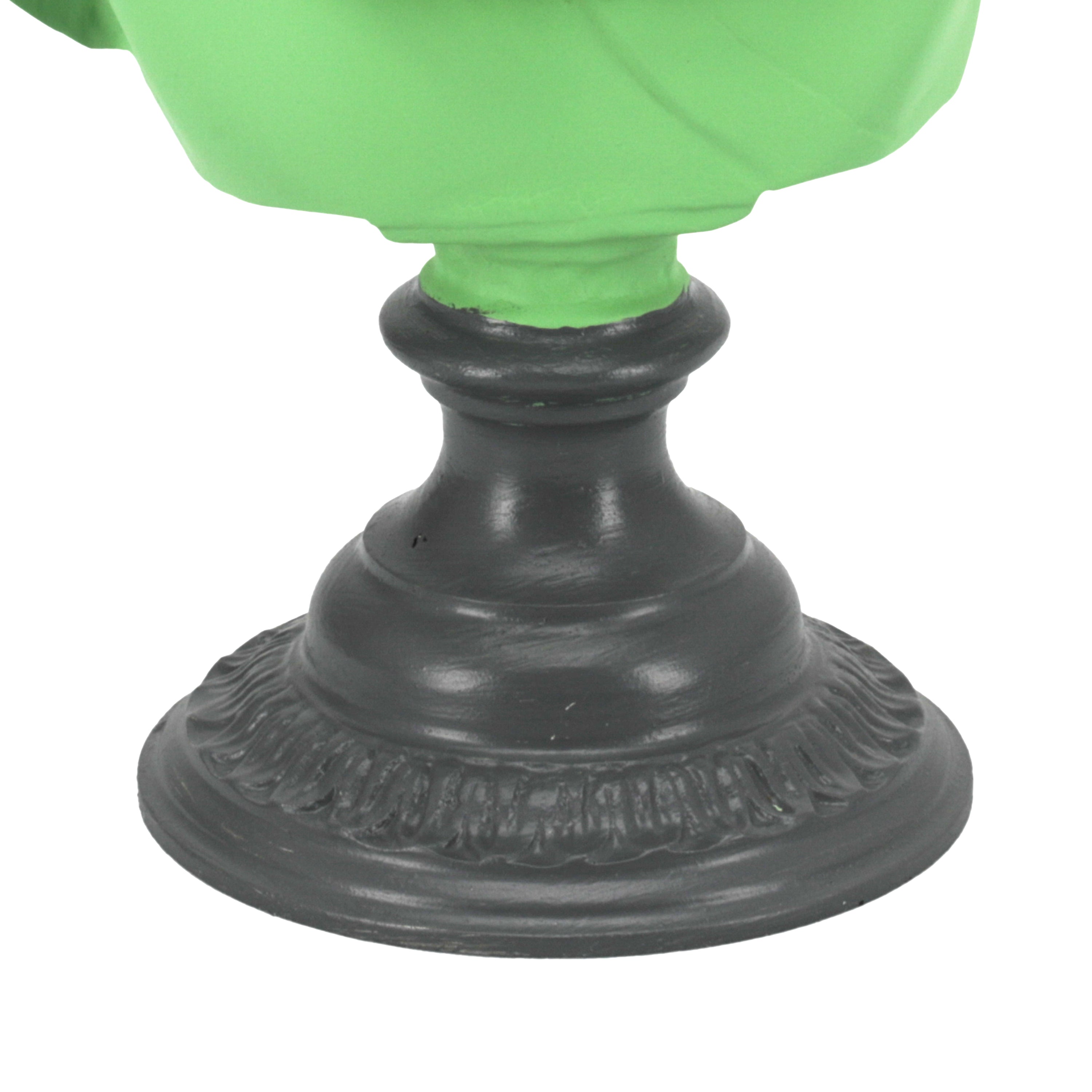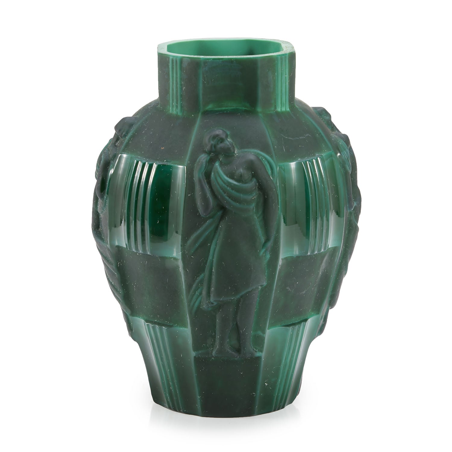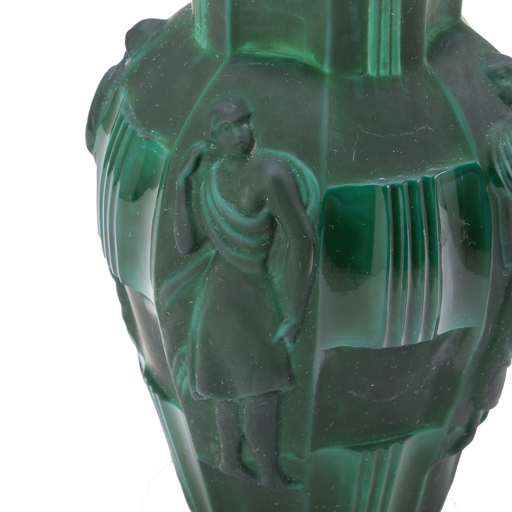 Details: A jade green vase with Greek figure Dimensions: 10" H x 6" W x 6" D Quantity: 1