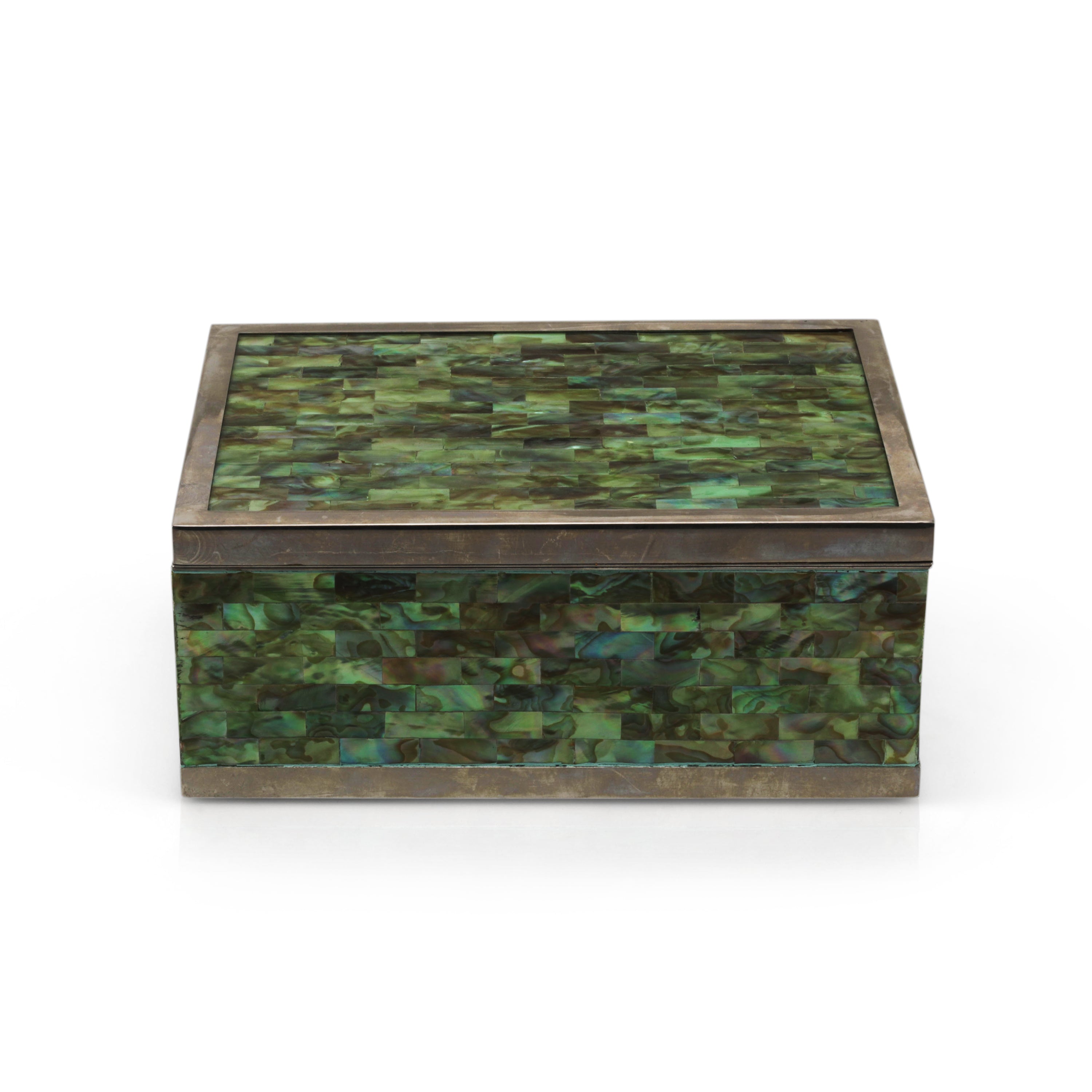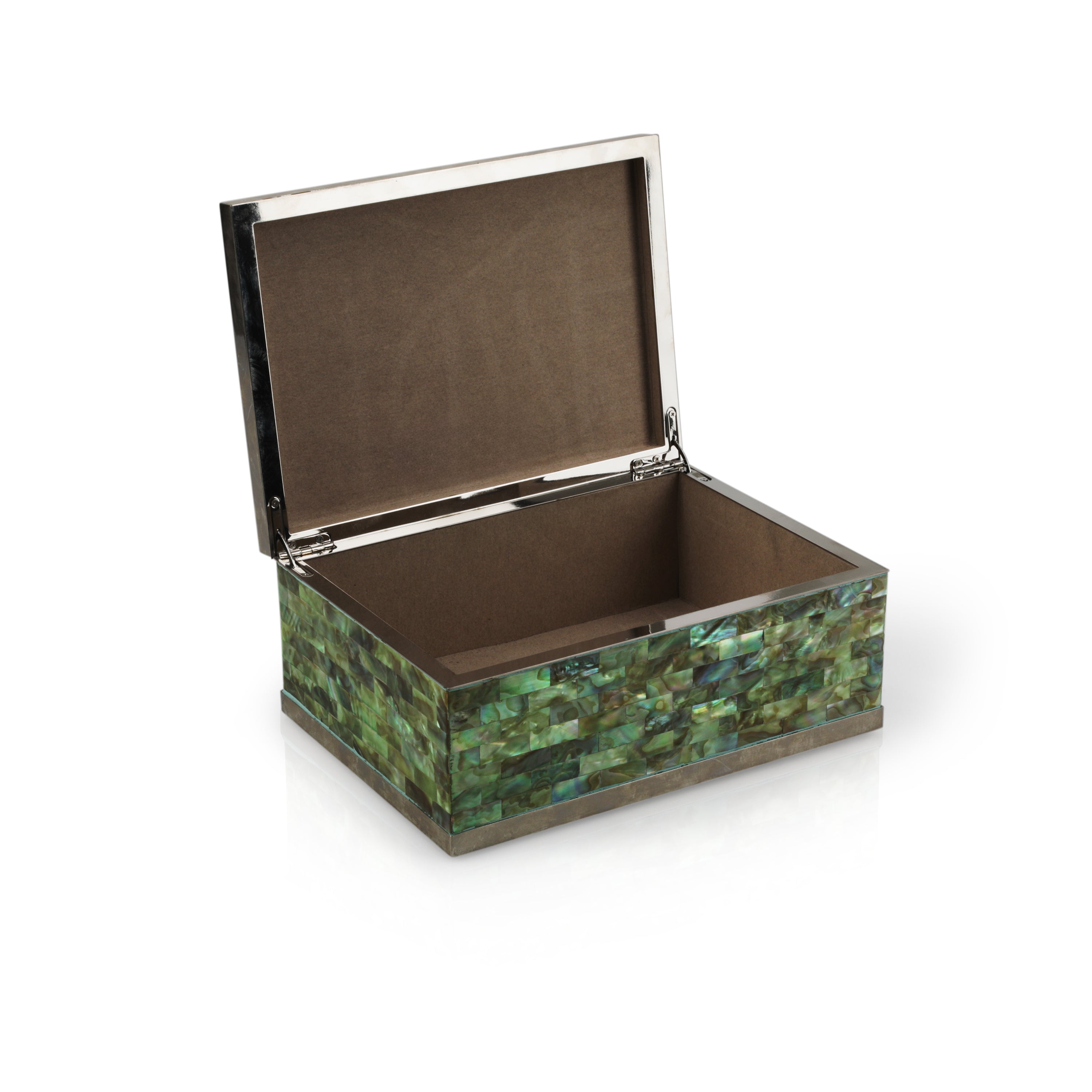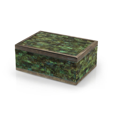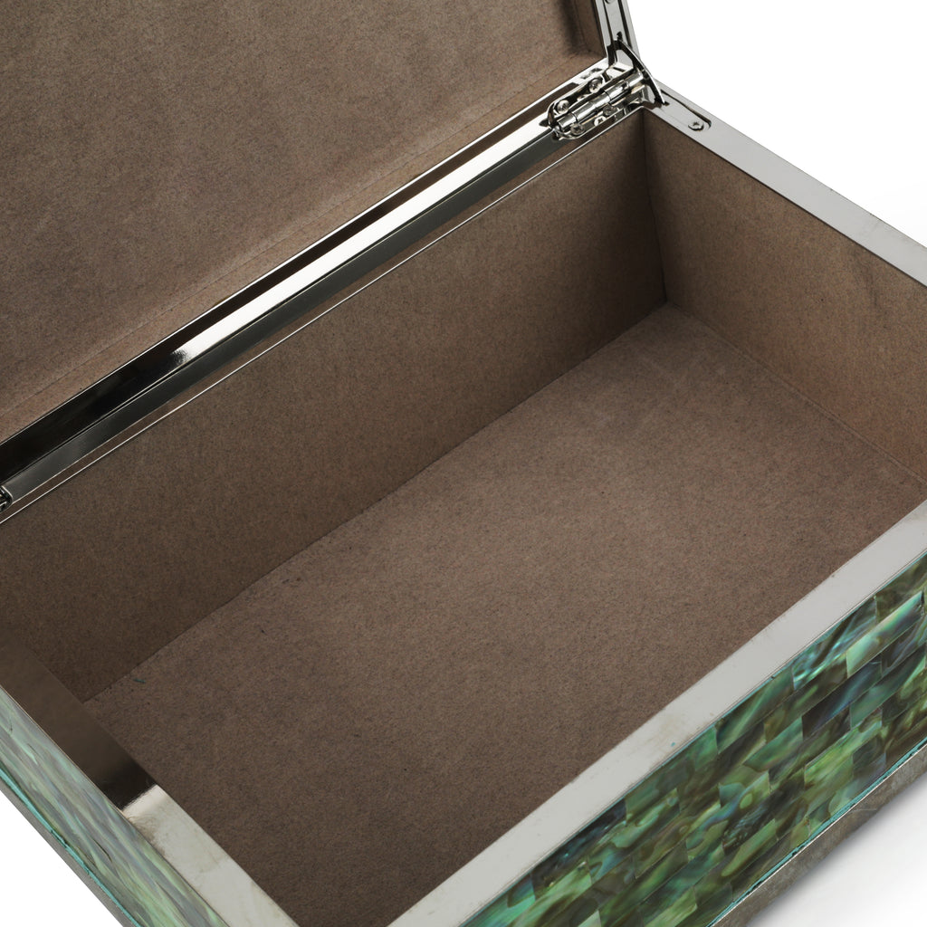 Details: Metal framed trinket box with iridescent green tile exterior. Suede lining. Dimensions: 4" H x 10" W x 7" D