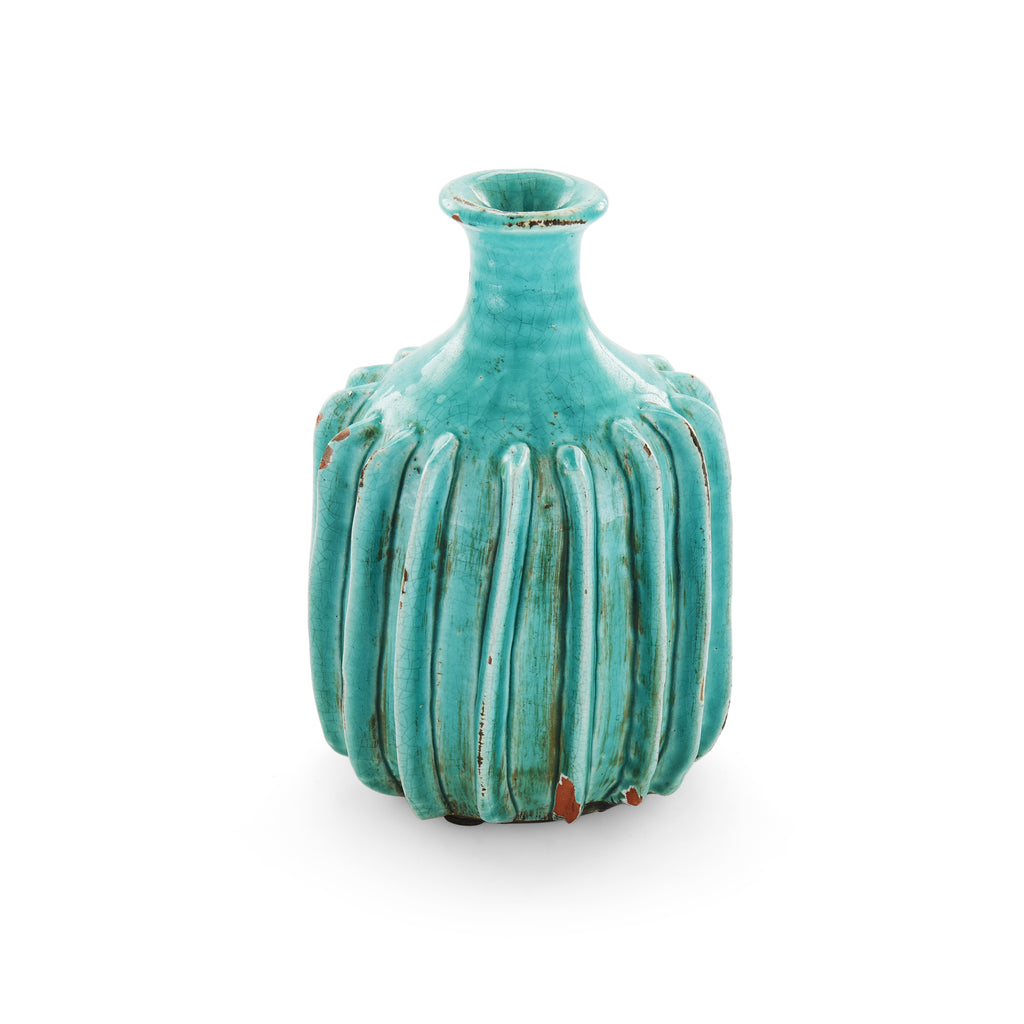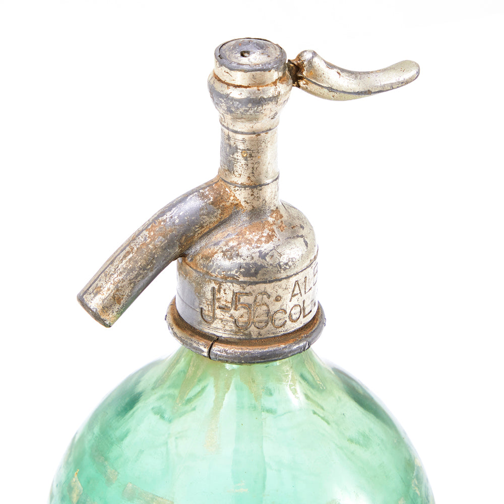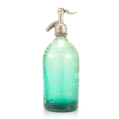 Details: Vintage turquoise glass seltzer bottle Dimensions: 12" H x 4" W x 4" D Quantity: 1
