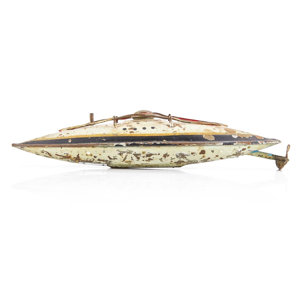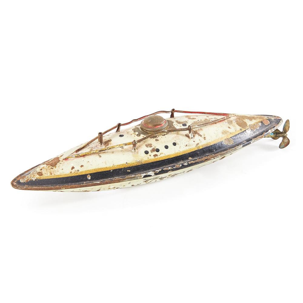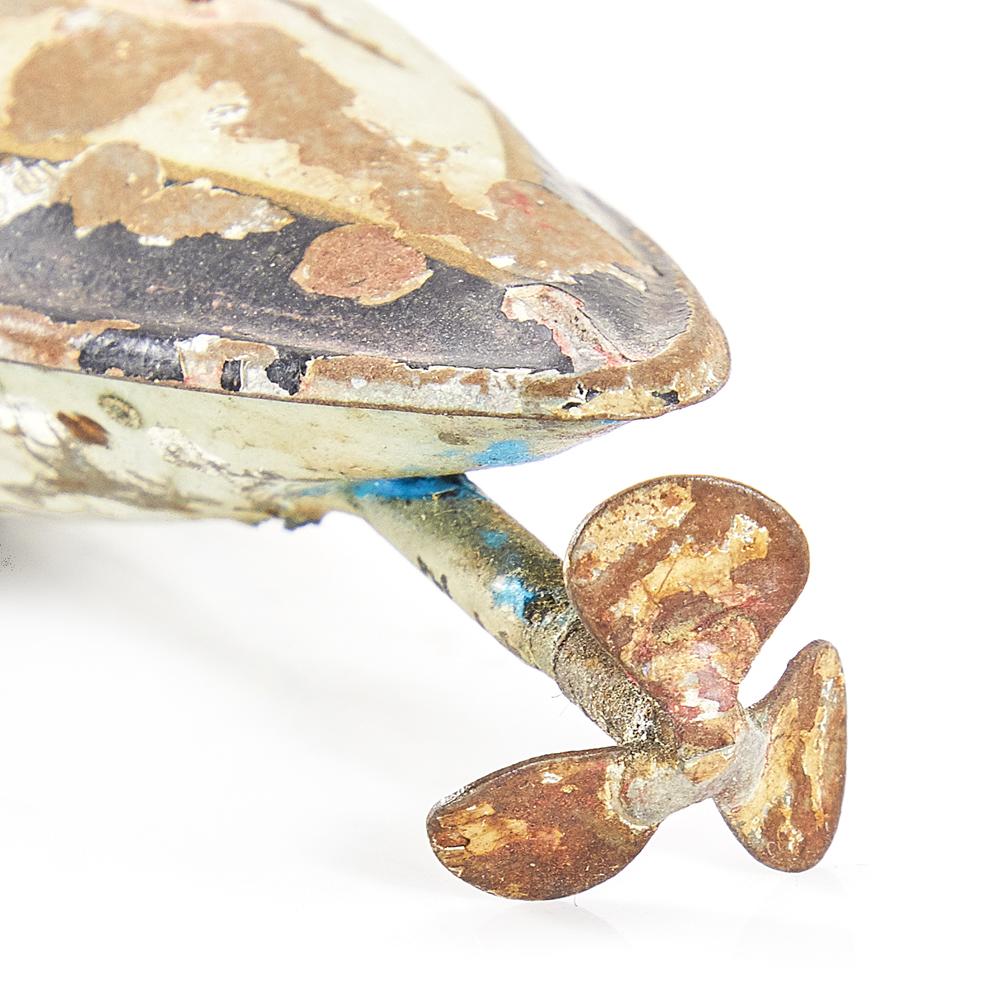 Details: Rusted tin submarine toy with propeller Dimensions: 2" H x 1.75" W x 7.5" D Quantity: 1