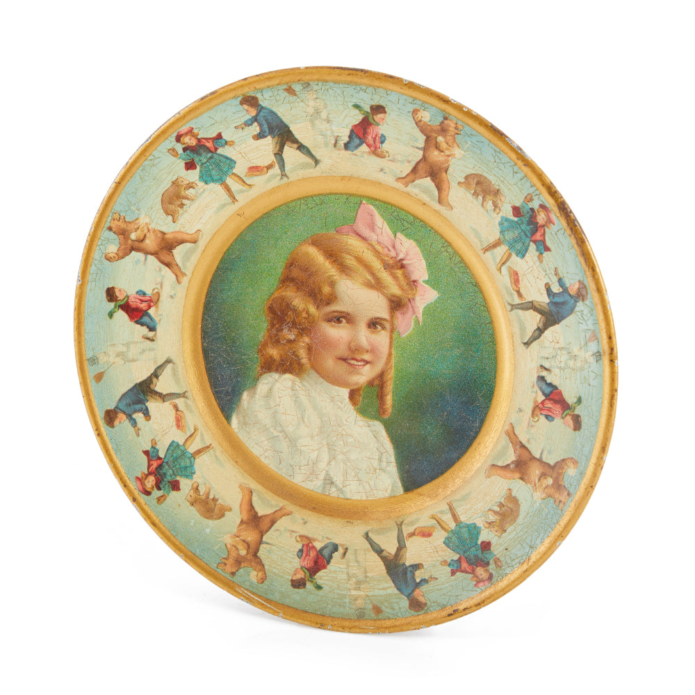 Details: Decorative metal plate with portrait of a young girl and bordered with a playful snowball fight and gold accent Dimensions: 1" H x 8" W x 8" D...