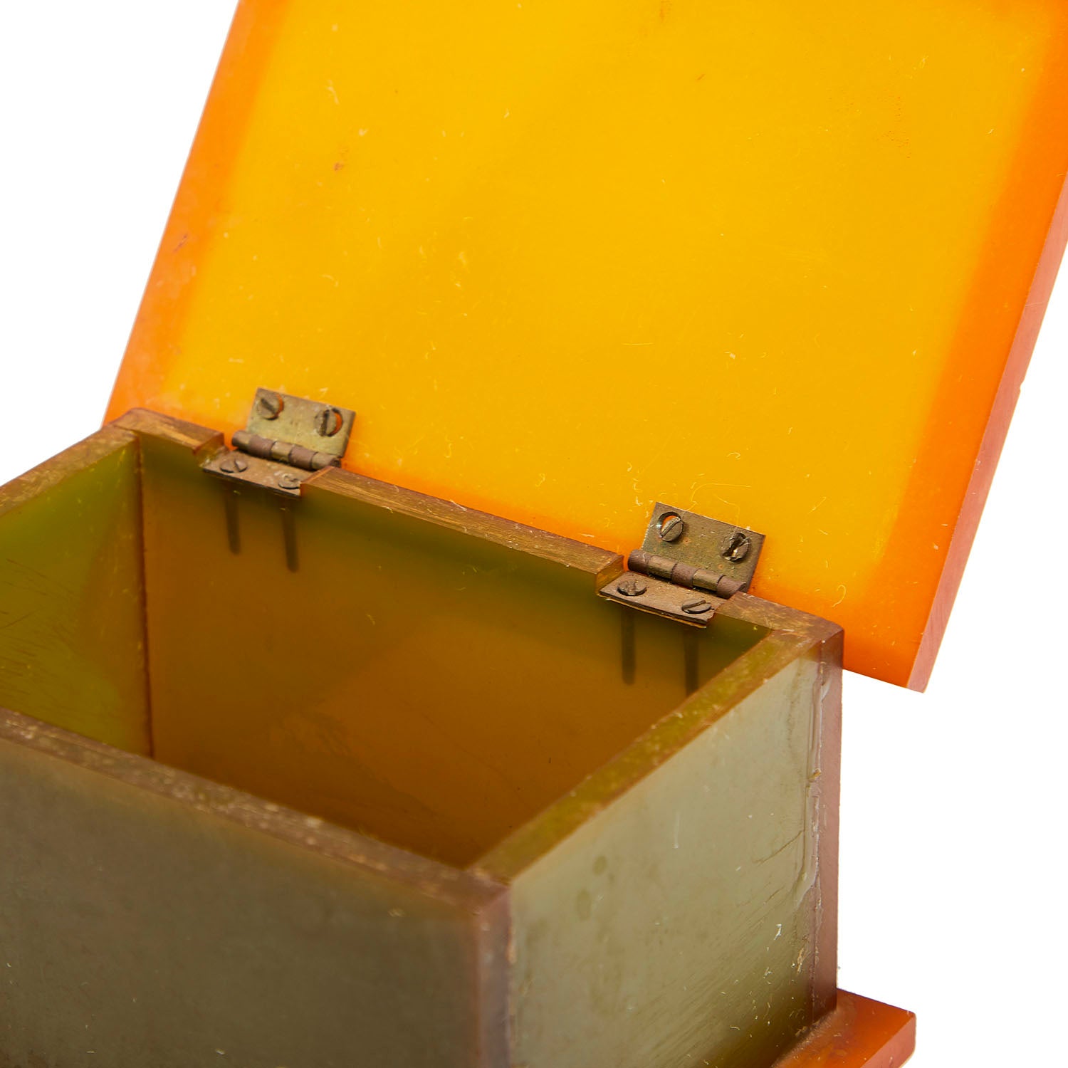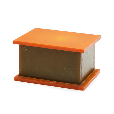 Details: A miniature orange acrylic box with dark green panels Dimensions: 2" H x 4" W x 3" D Quantity: 1