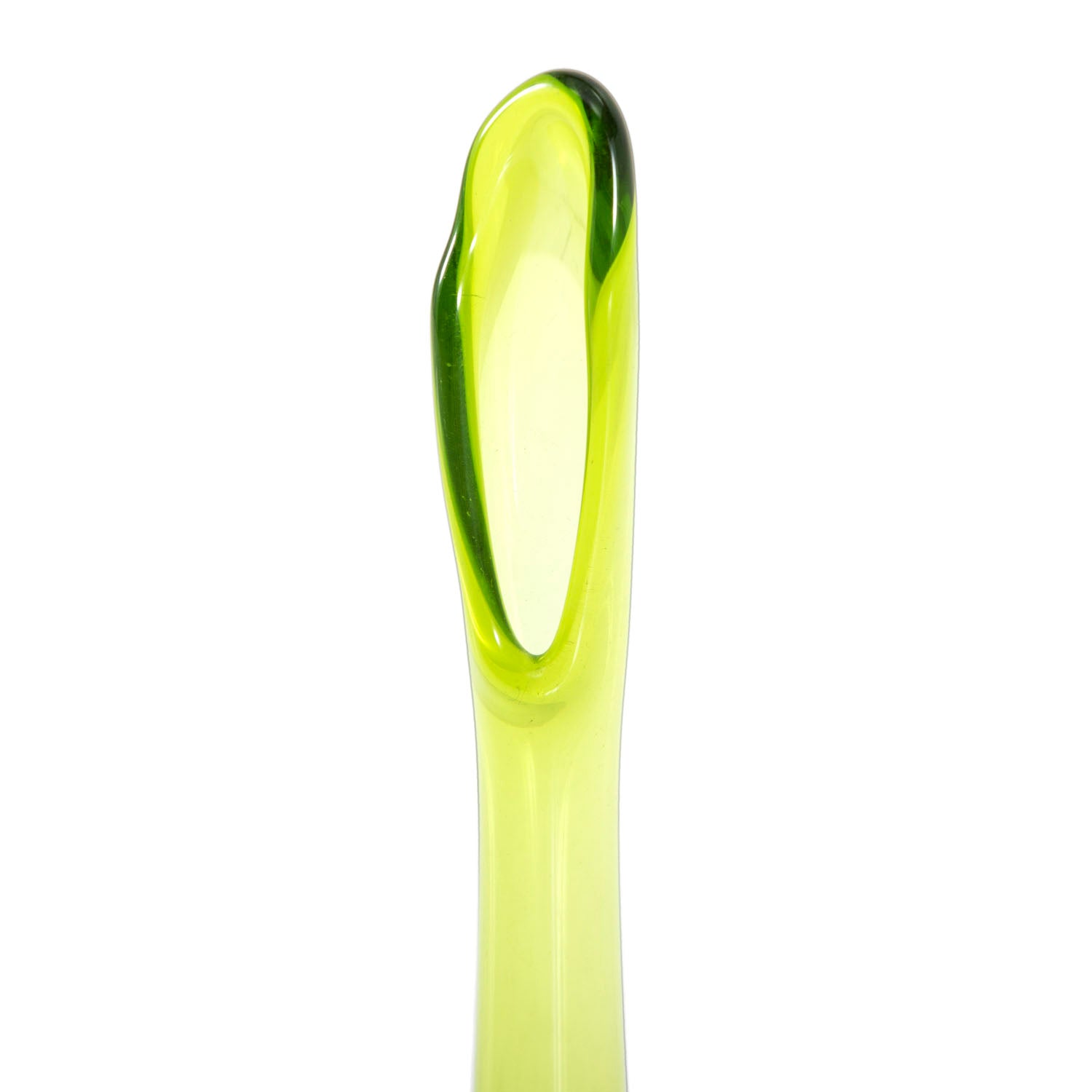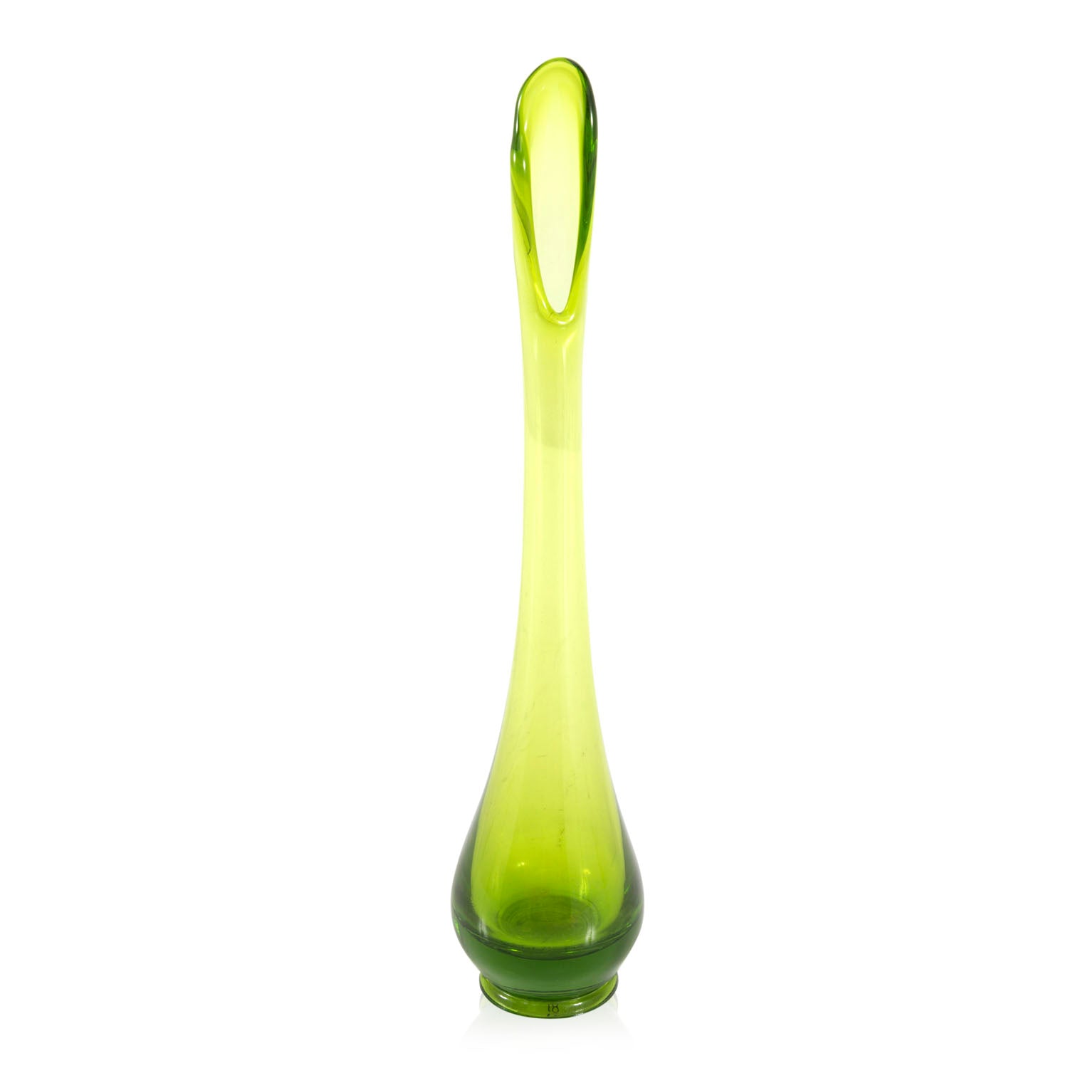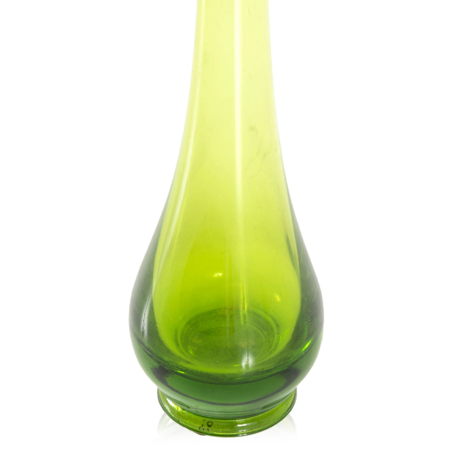 Details: Green glass teardrop vase with melted opening Dimensions: 11.5" H x 2.5" W x 2.5" D Quantity: 1