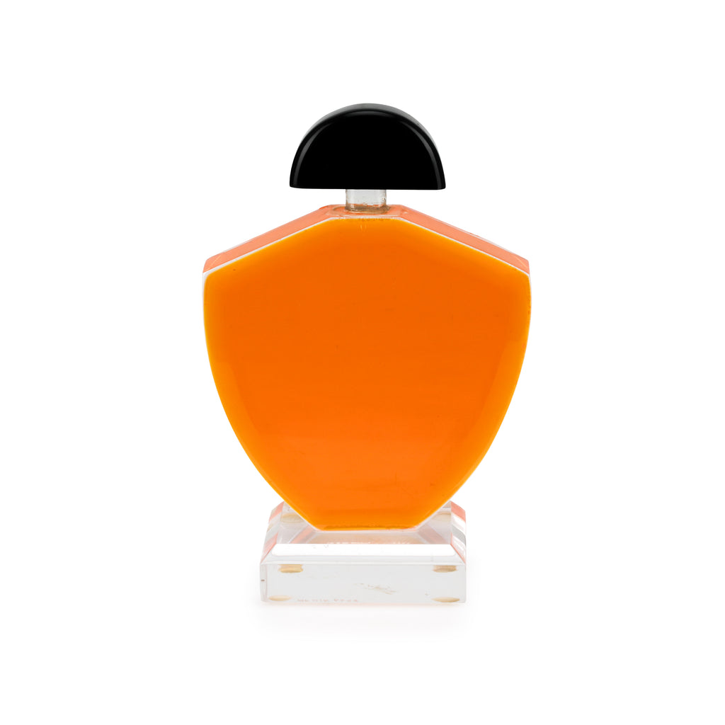 Details: Bottle shaped acrylic sculpture with semi-translucent orange mid-section and black top (top is not removable). Dimensions: 9" H x 5" W x 3" D