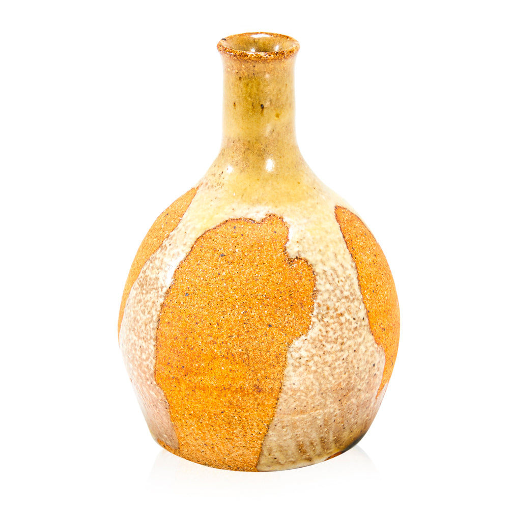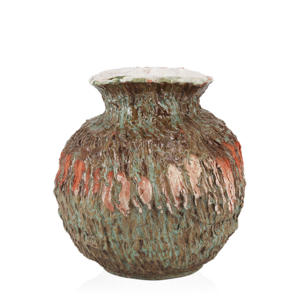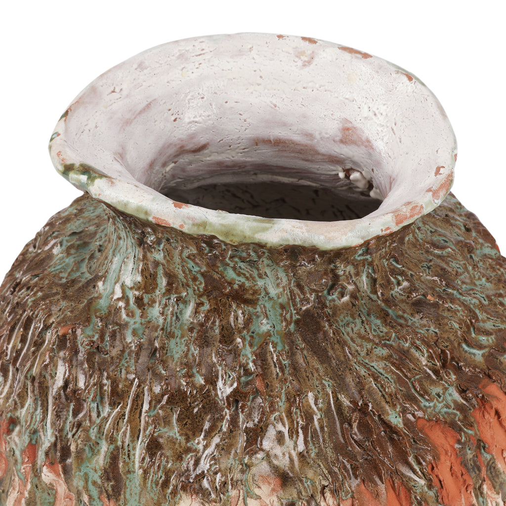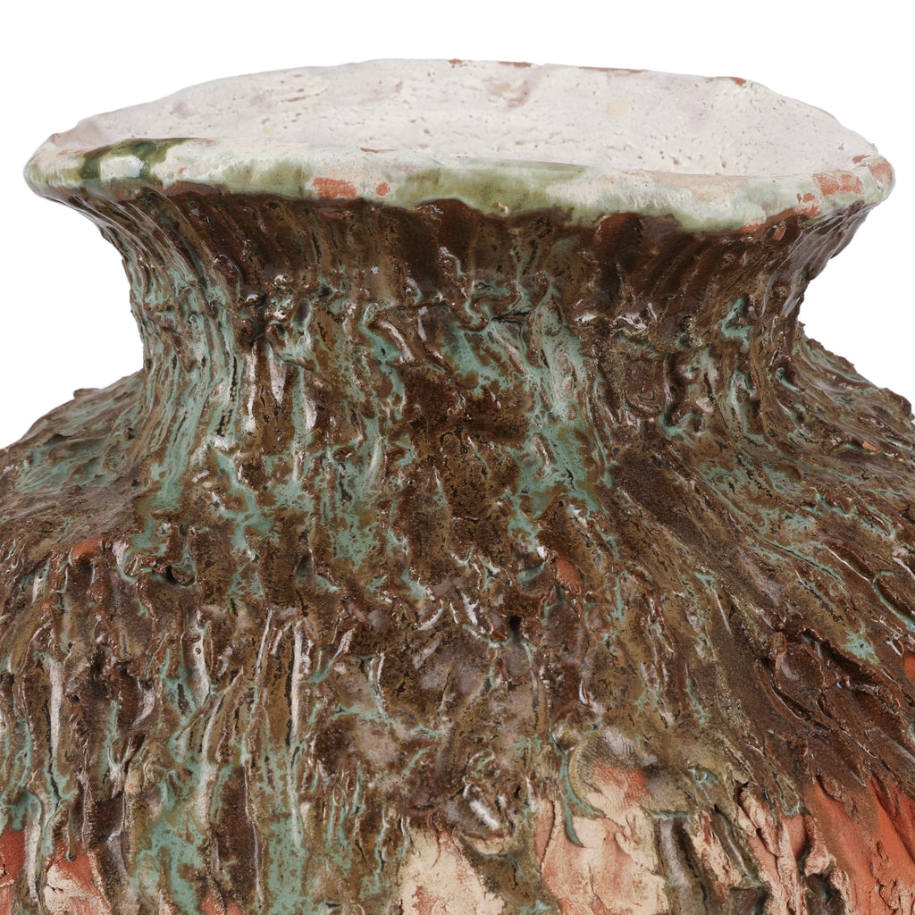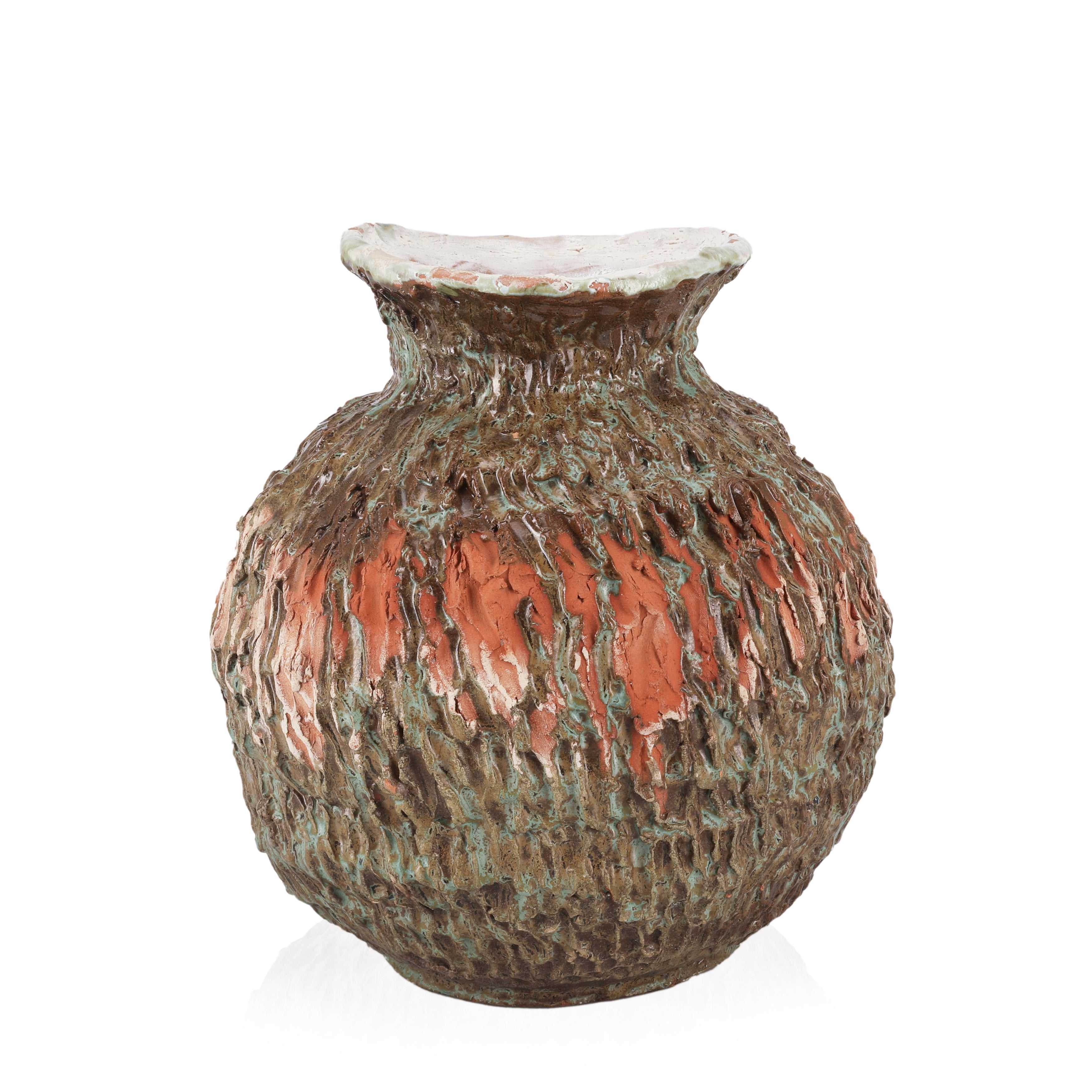 Details: Round ceramic handmade vase with textured earth tones on exterior. Brown, orange, teal, and white. Dimensions: 10" W x 9" D