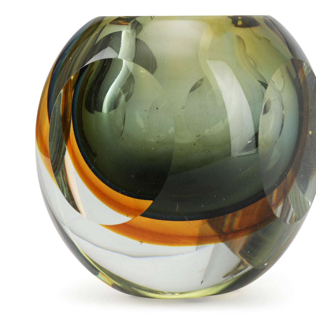 Details: Glass vase with flat sides and orange / green tones. Dimensions: 4" H x 4" W x 4" D
