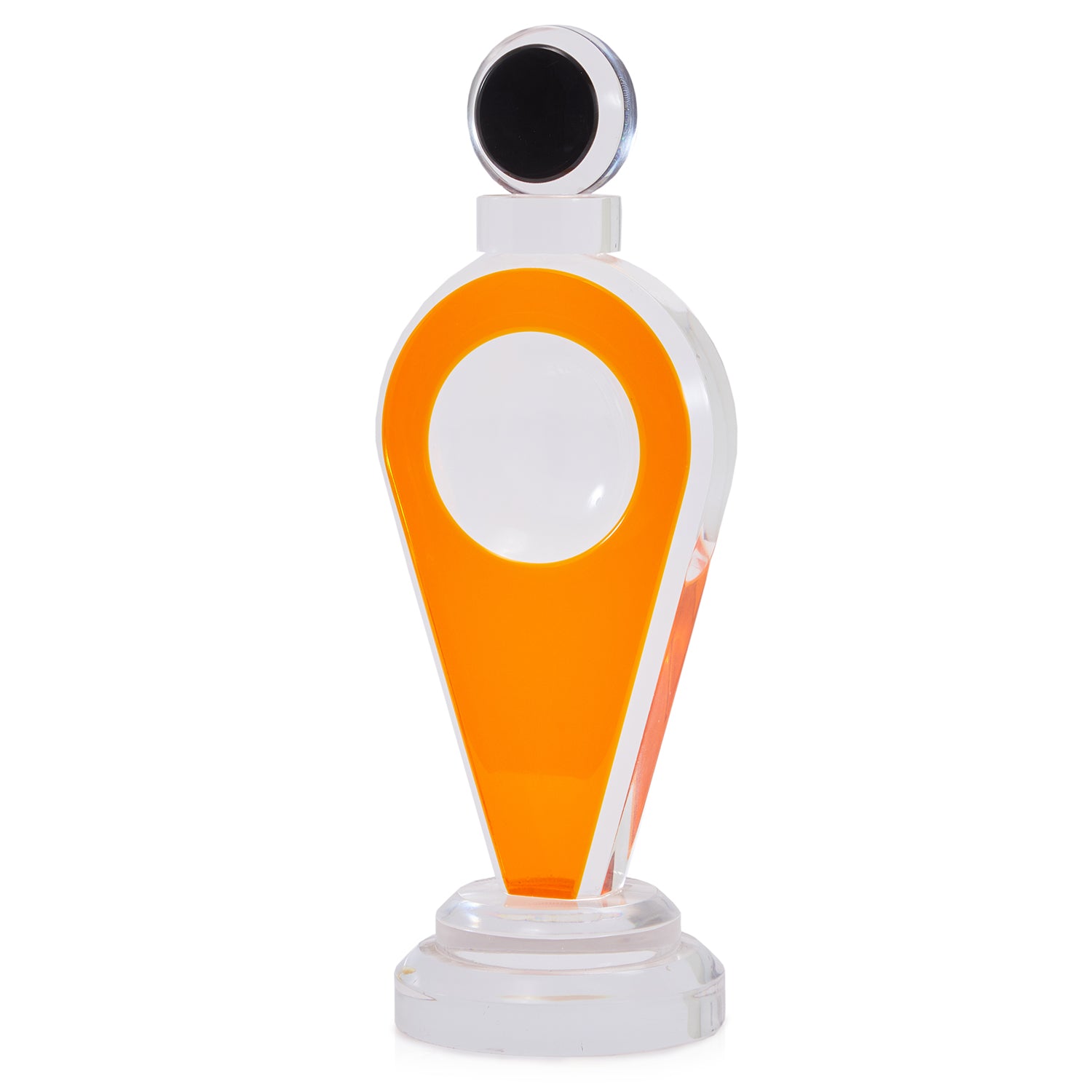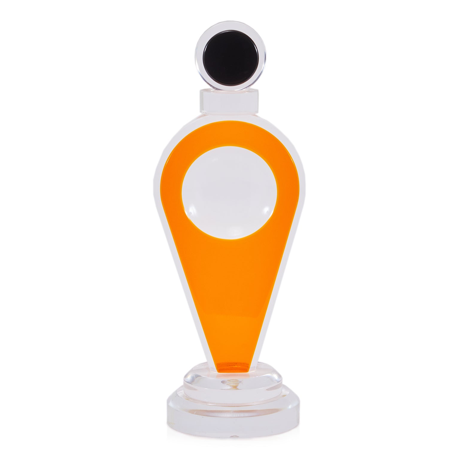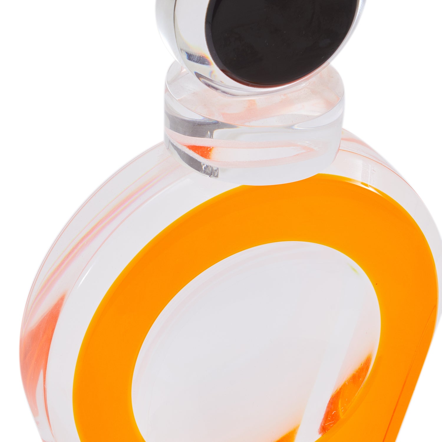 Details: Abstract acrylic sculpture vaguely resembling a decanter with an orange body with a central clear circle and a black circular top or "cap" on a clear base Dimensions:...