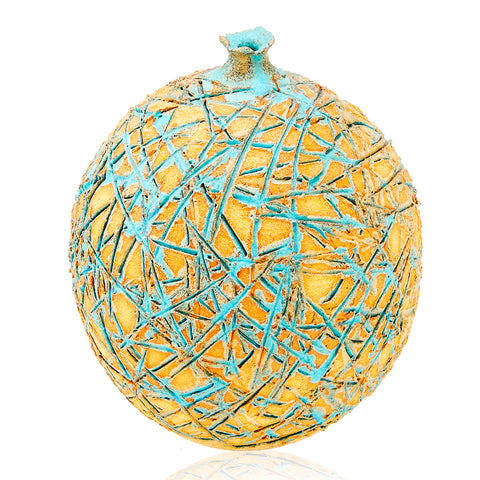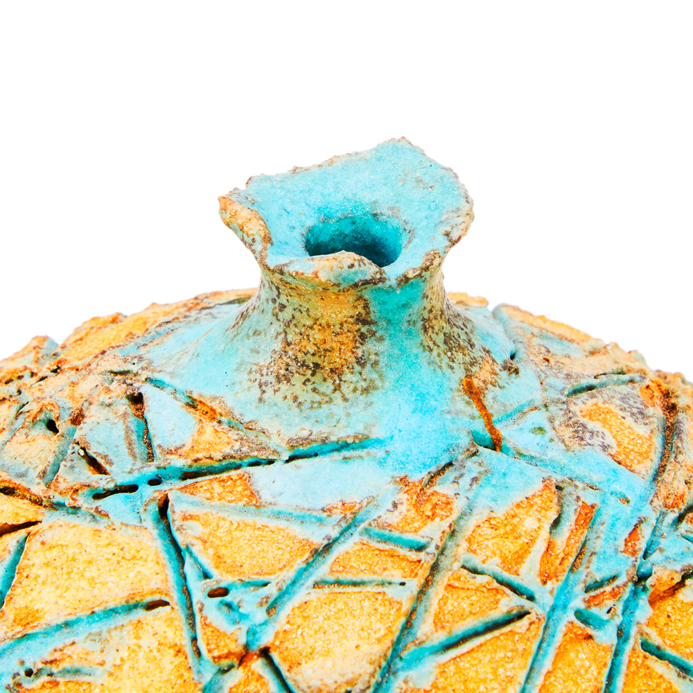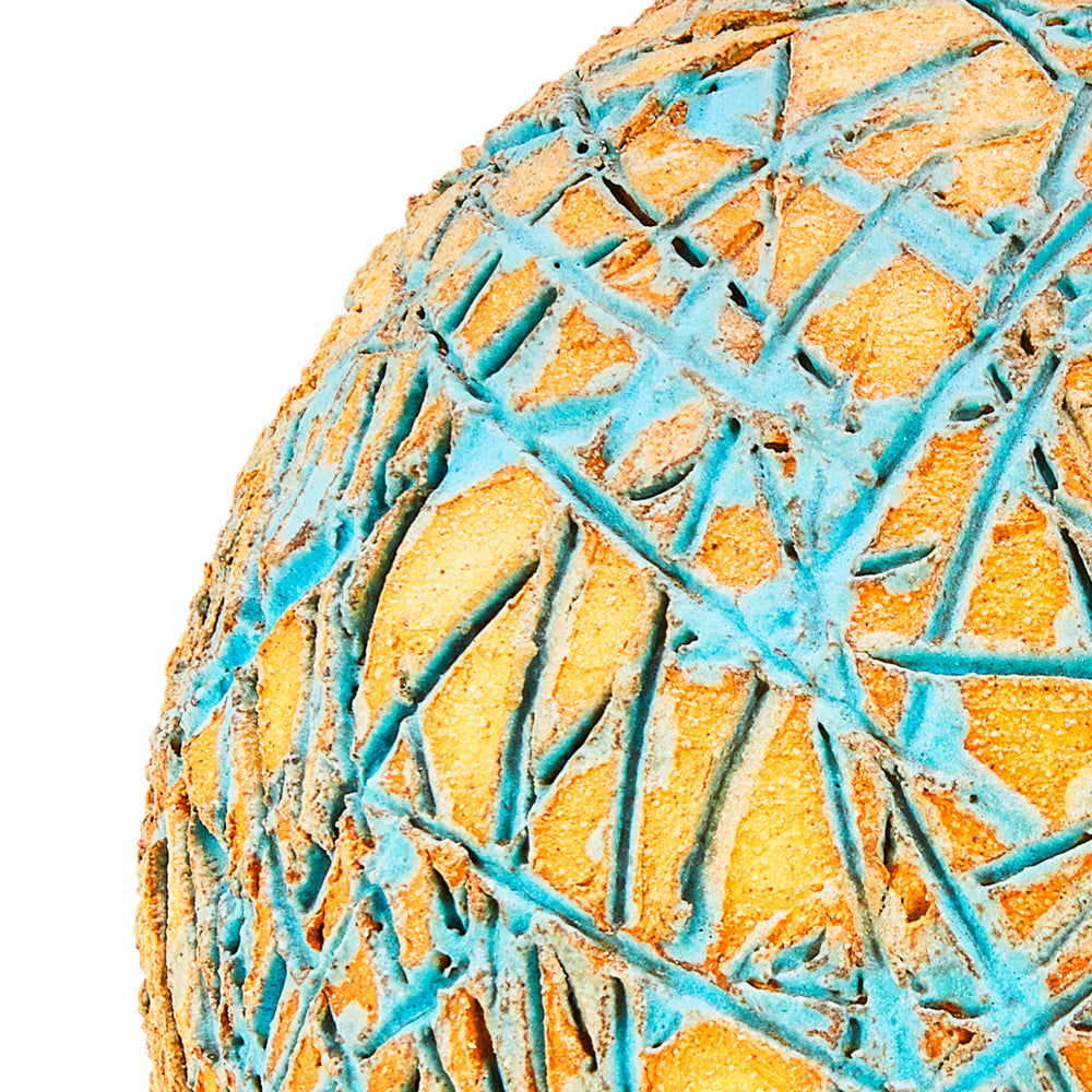 Details: Orange ceramic orb vase with small jagged mouth and teal/cyan scoring design Dimensions: 9" H x 7" W x 7" D Quantity: 1
