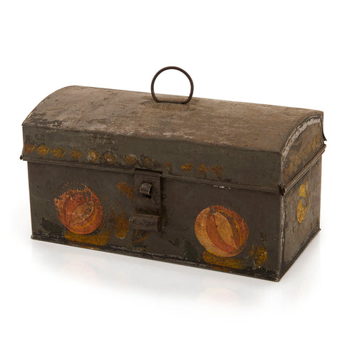 Details: Rustic tin lunchbox with clementine designs painted on the side Dimensions: 4" H x 8" W x 4" D Quantity: 1