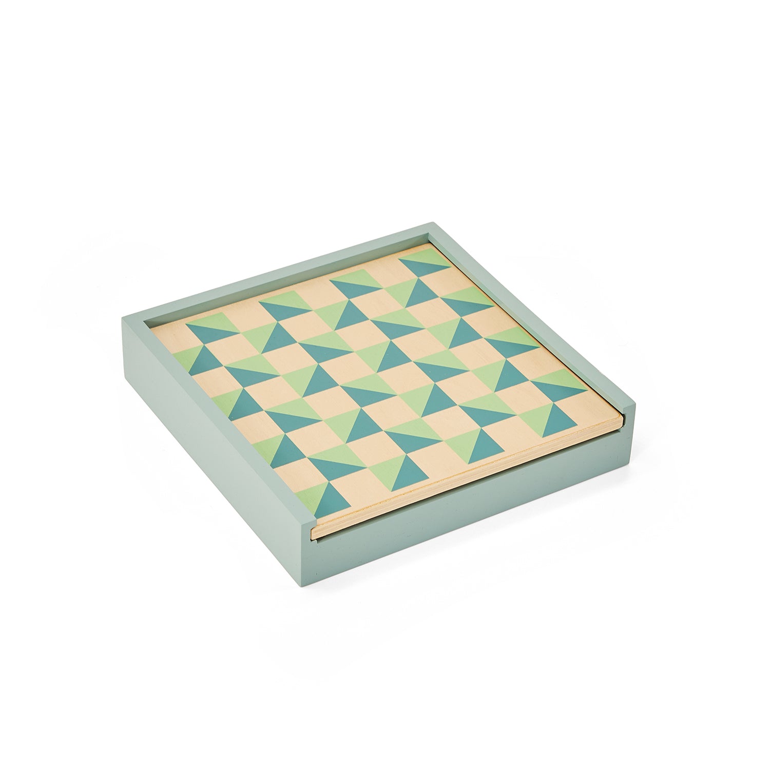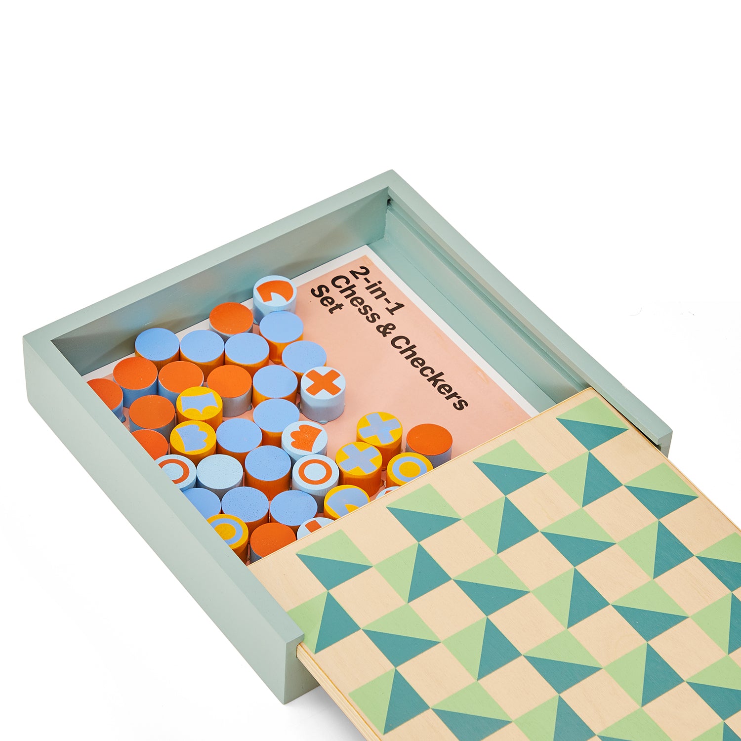Details: Teal and white modern 2-in-1 chess and checkers set with colorful pieces Dimensions: 9" H X 9" W X 2" D