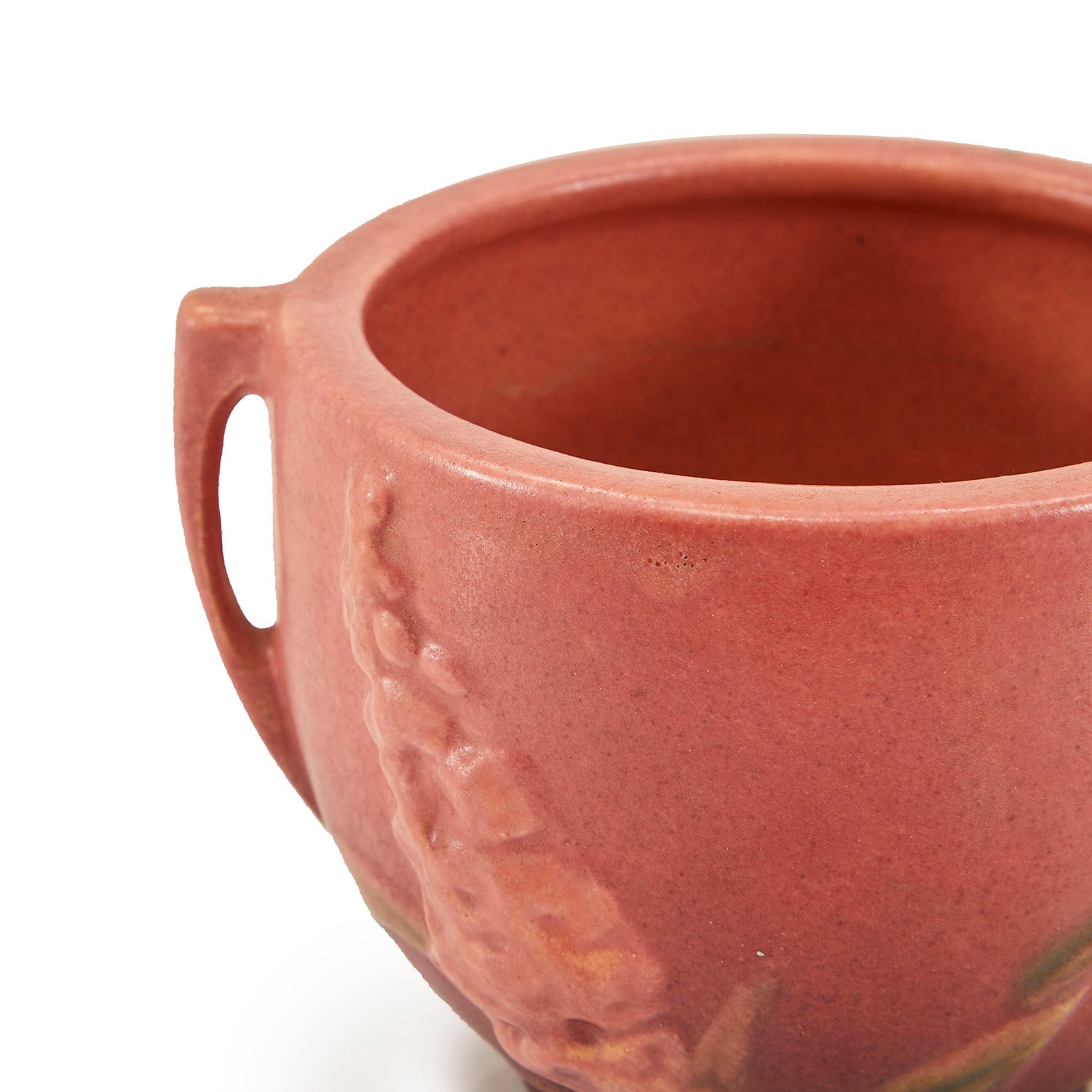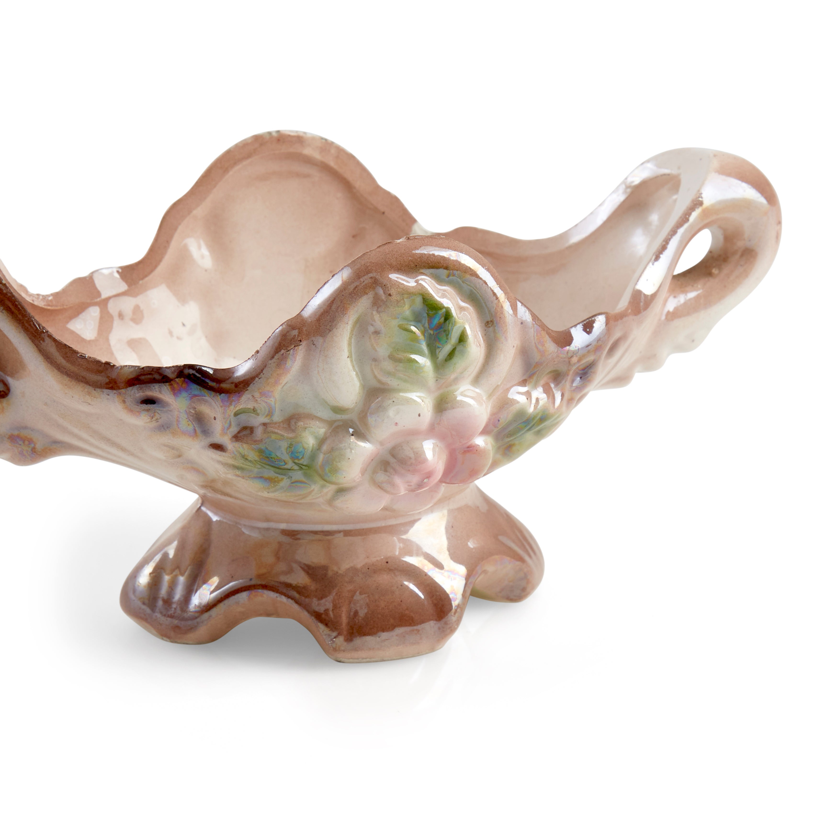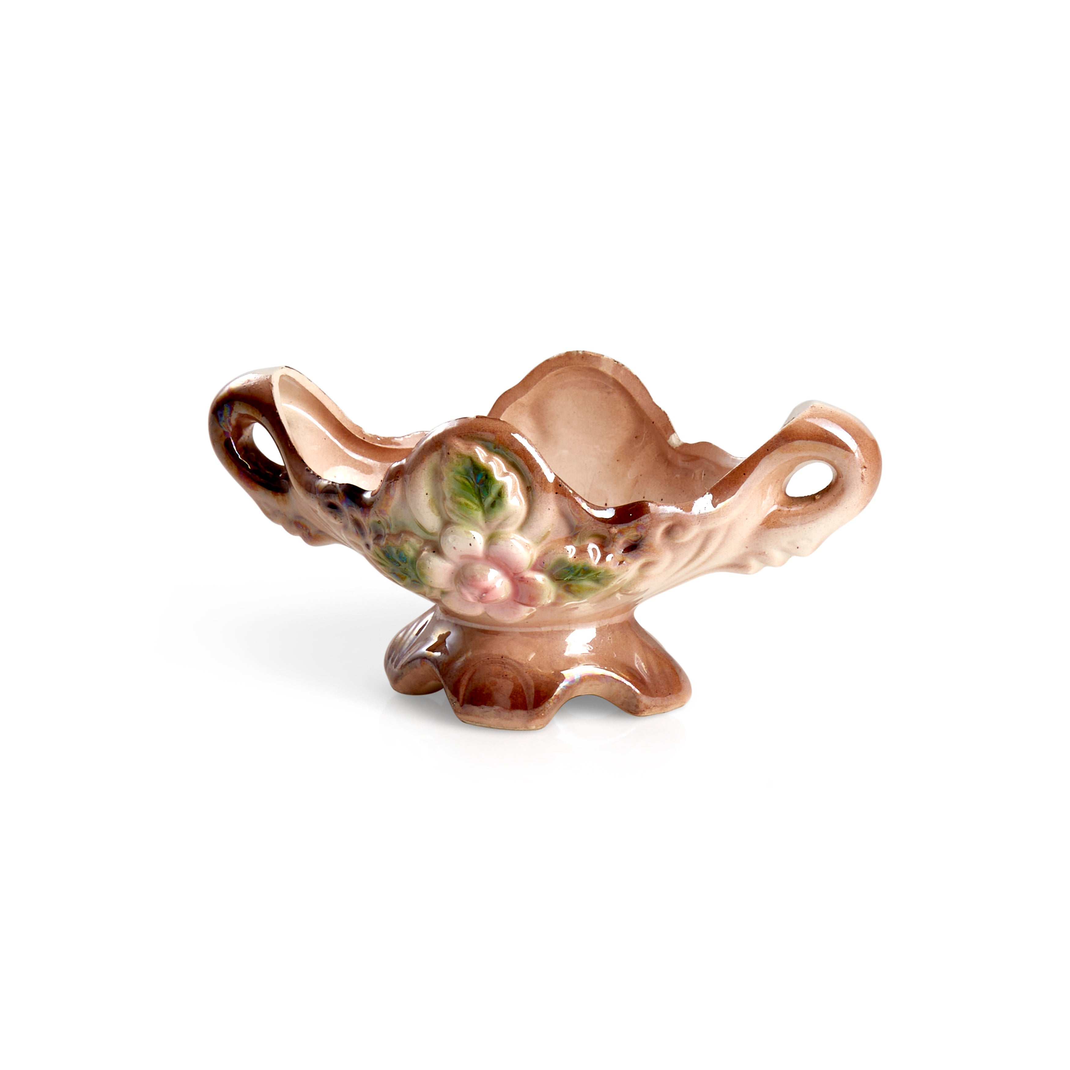 Details: Pink ceramic cup with small handles and floral design Dimensions: 3" H x 5" W x 5" D Quantity: 1