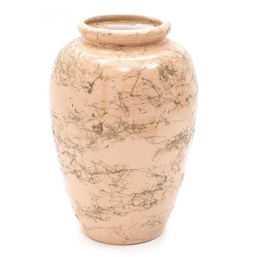 Details: Peach table urn vase with gold splatter texture detailingDimensions: 17" H x 11" W x 11" D