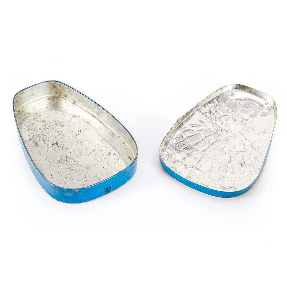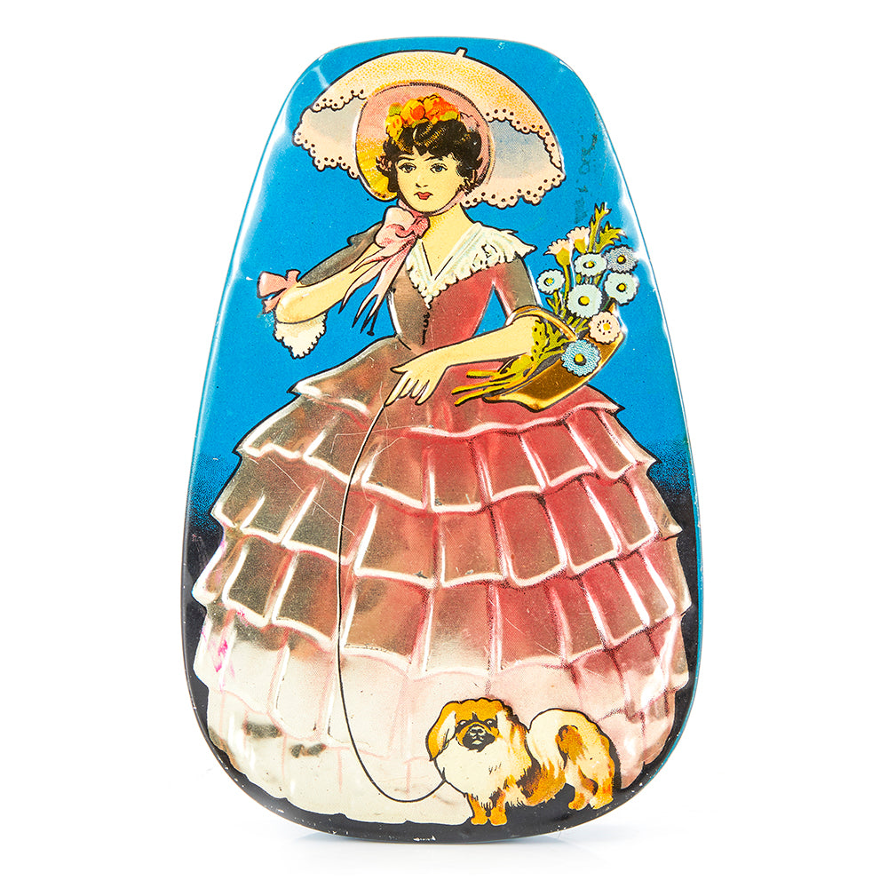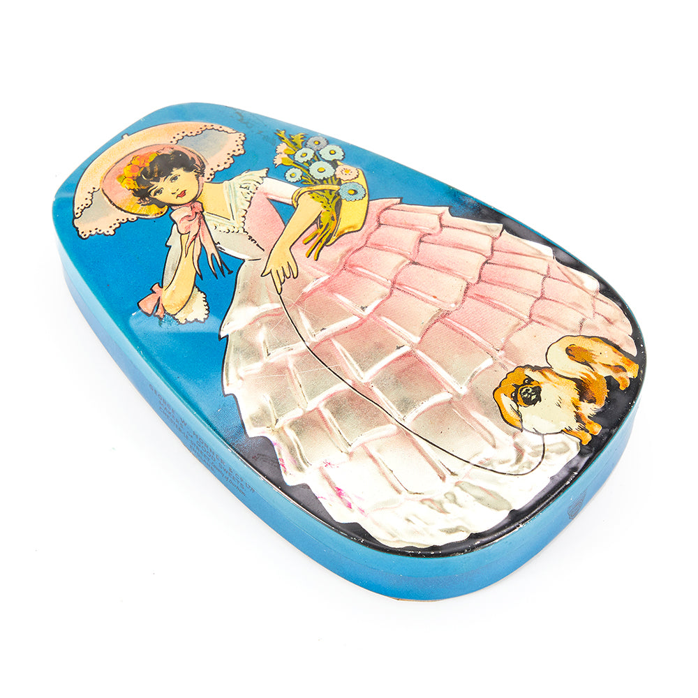 Details: Blue tin container with Southern Belle and a small dog Dimensions: 1" H x 4" W x 7" D Quantity: 1