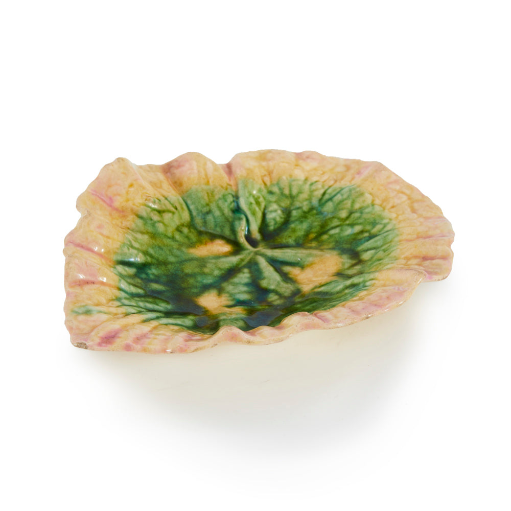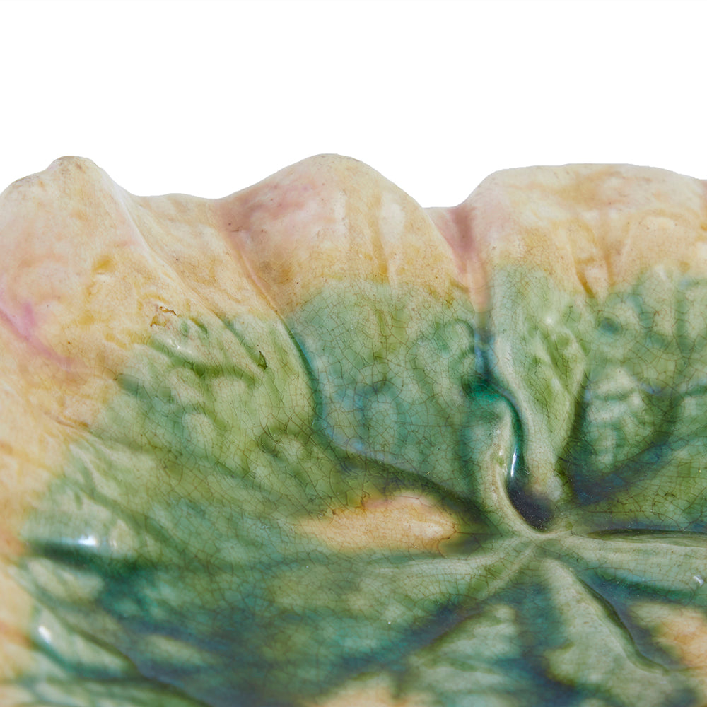 Details: Organic leaf shaped stoneware dish with green and pink glaze Dimensions: 2.5" H x 7" W x 9" D Quantity: 1