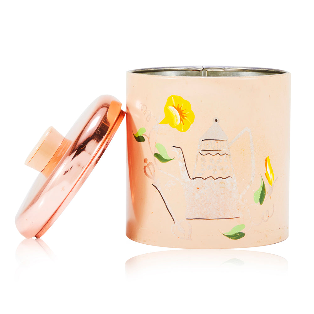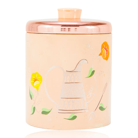Details: Metal kitchen storage container with a shiny pink top and a pitcher and flowers on the side. Available as part of a set of...