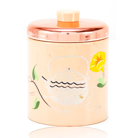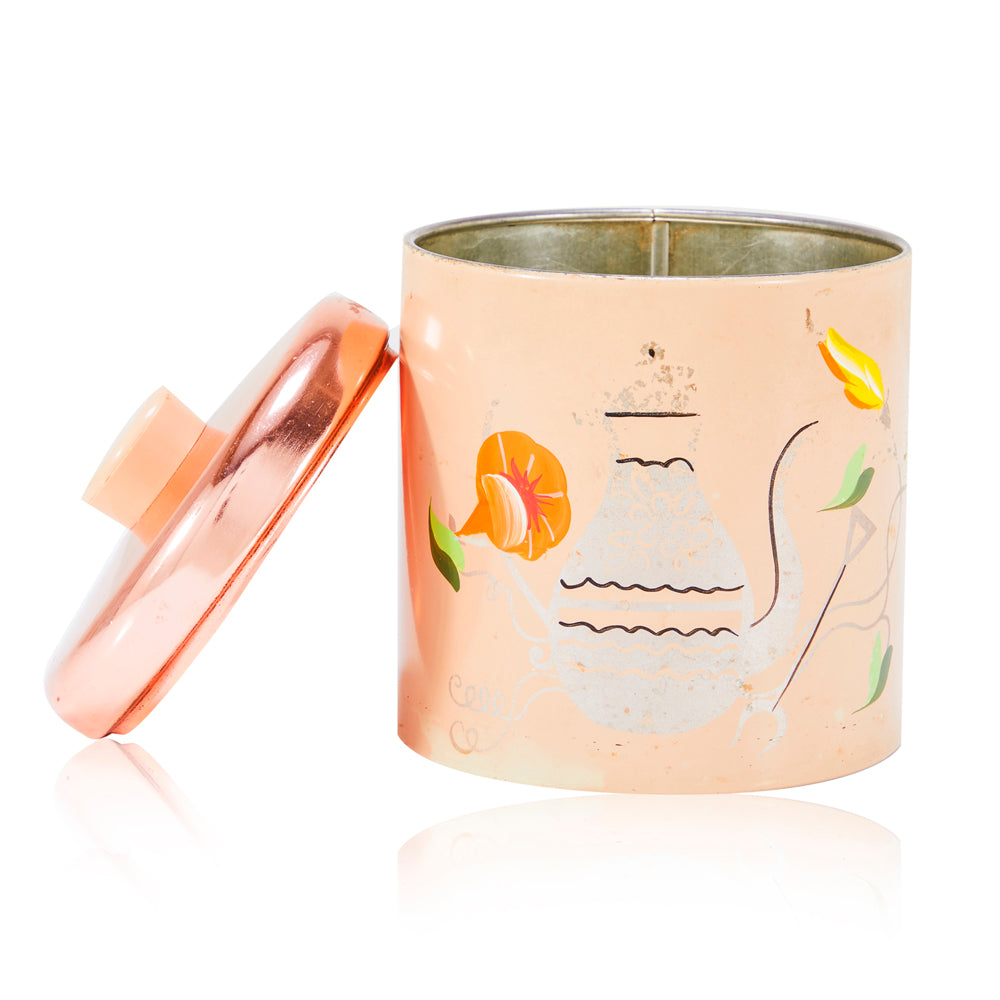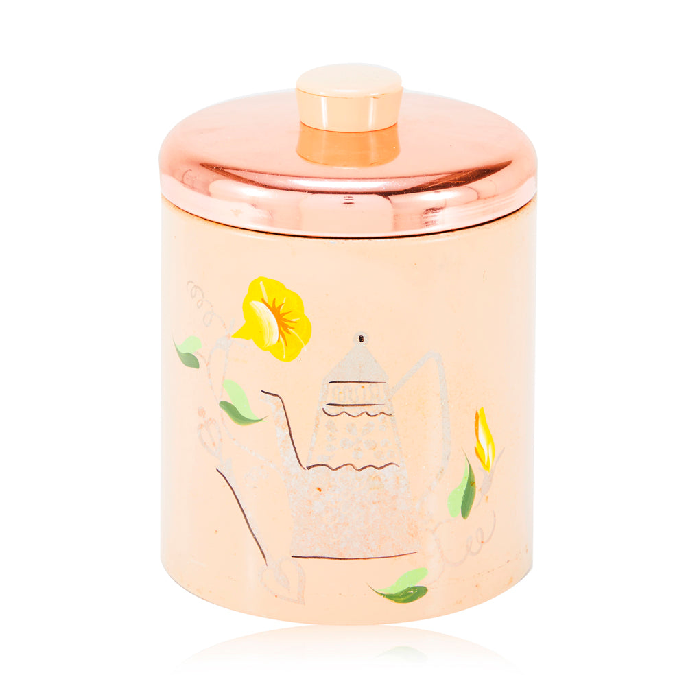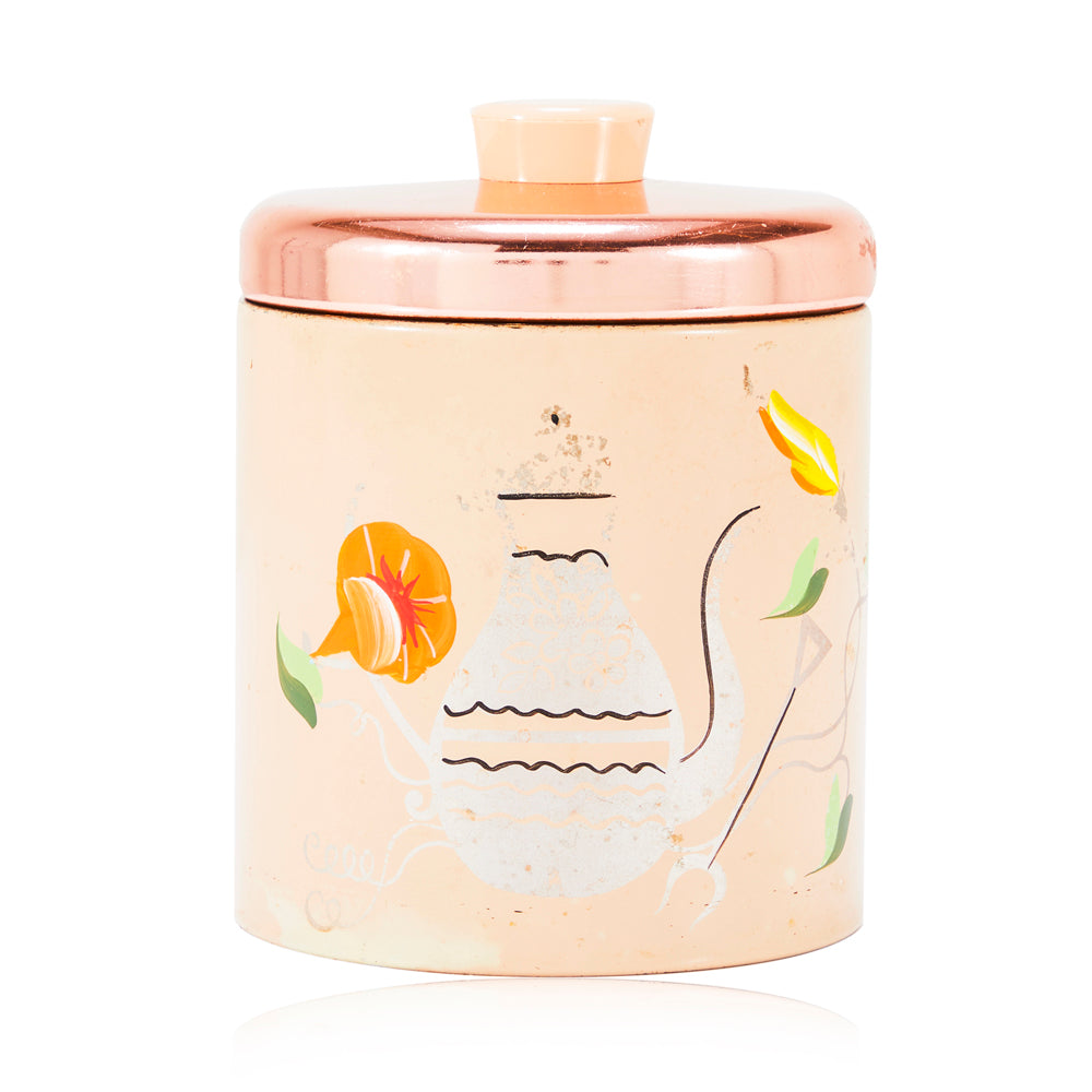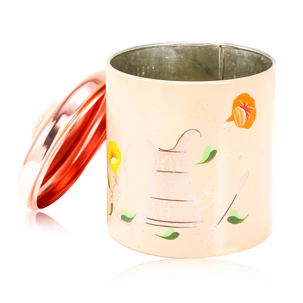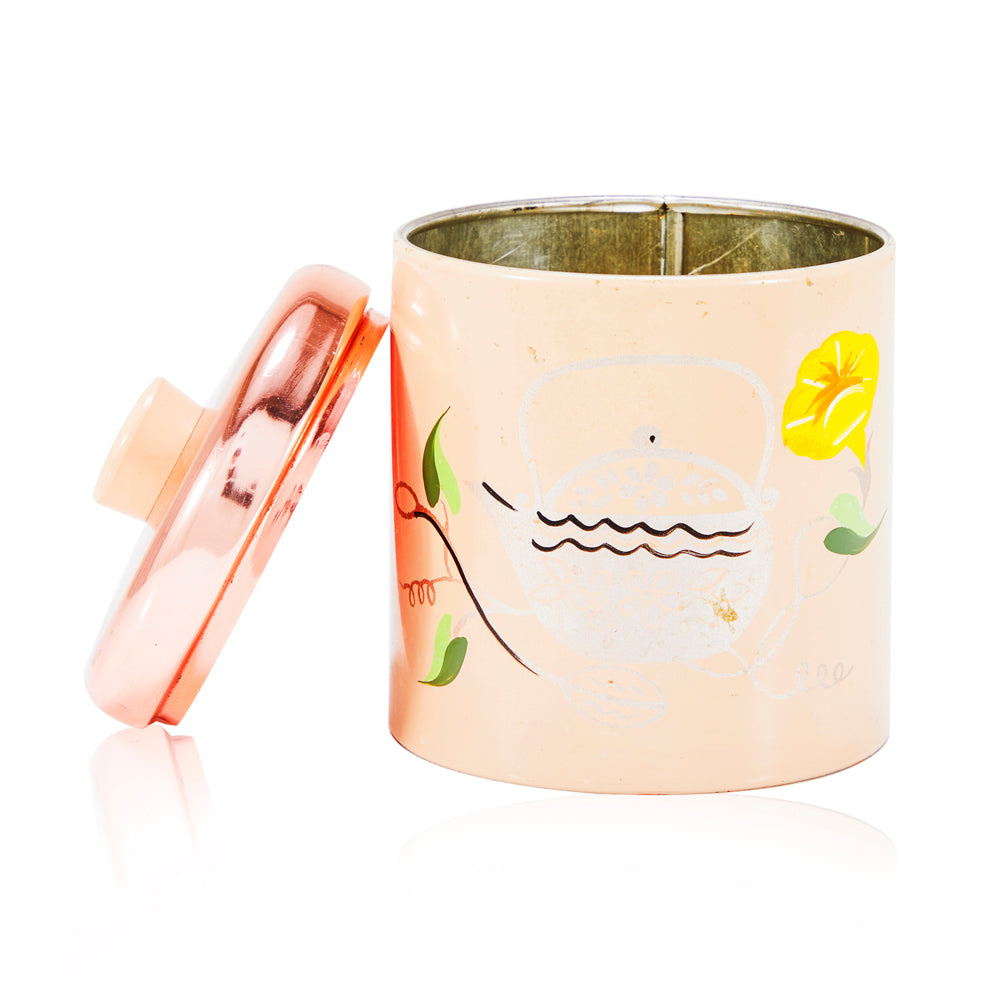 Details: Metal kitchen storage container with a shiny pink top and a tea kettle and flowers on the side. Available as part of a set...