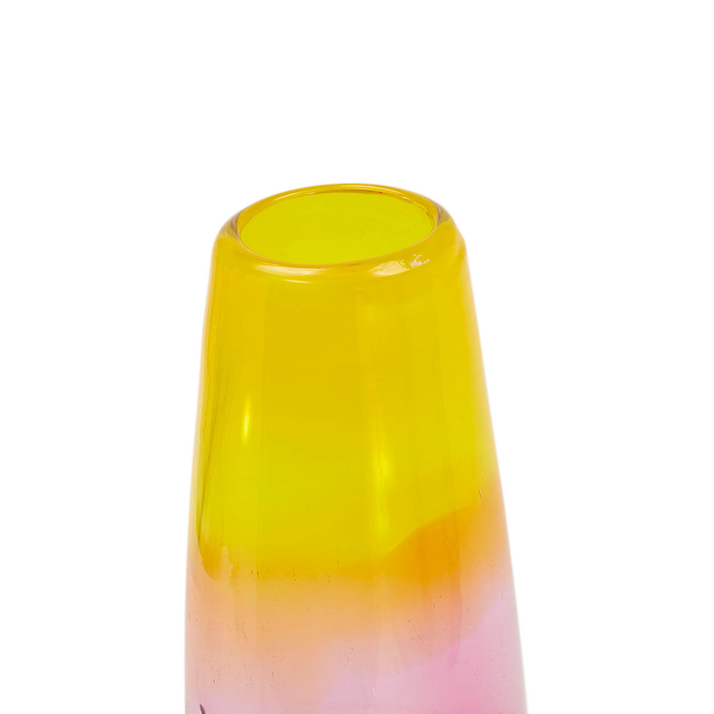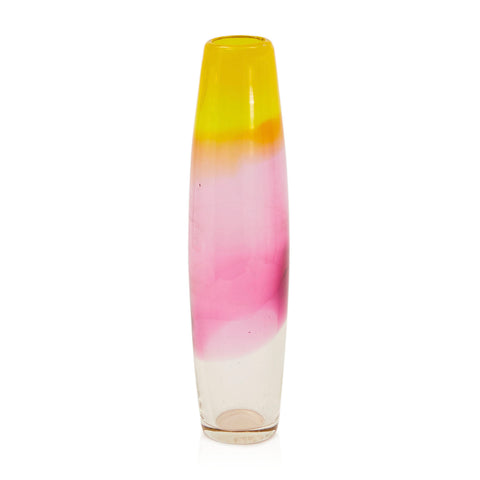 Details: Glass Vase with Pink & Yellow Swirls. Dimensions: 15.5" H x 4" W x 4" D Quantity: 1