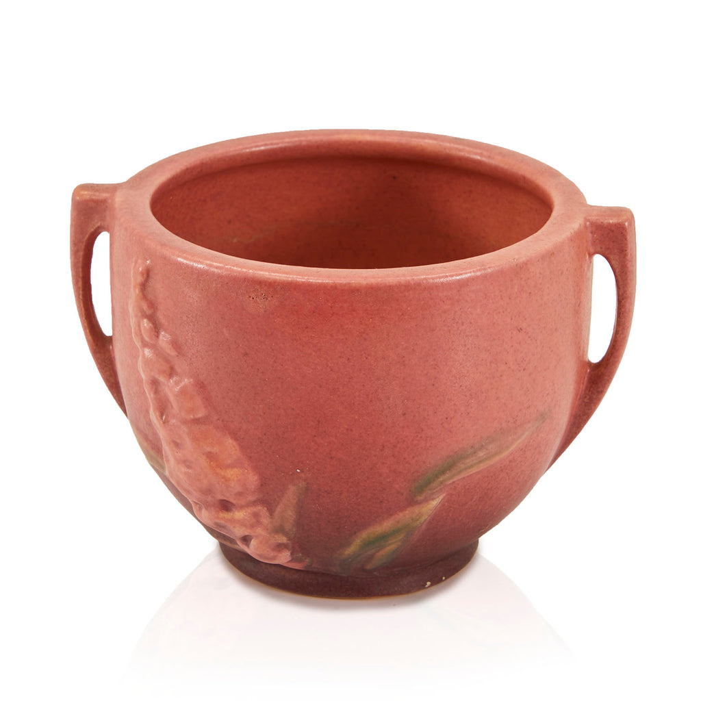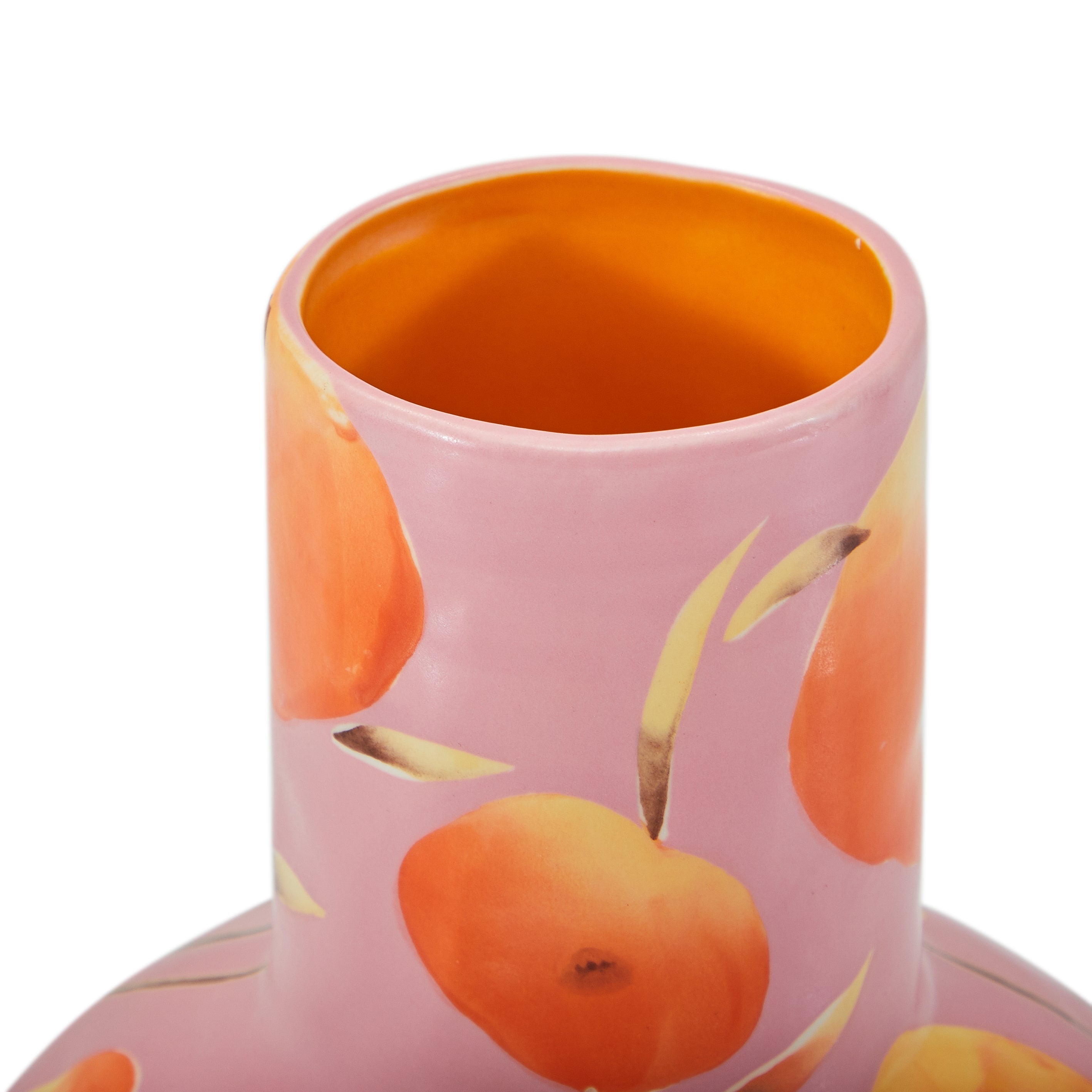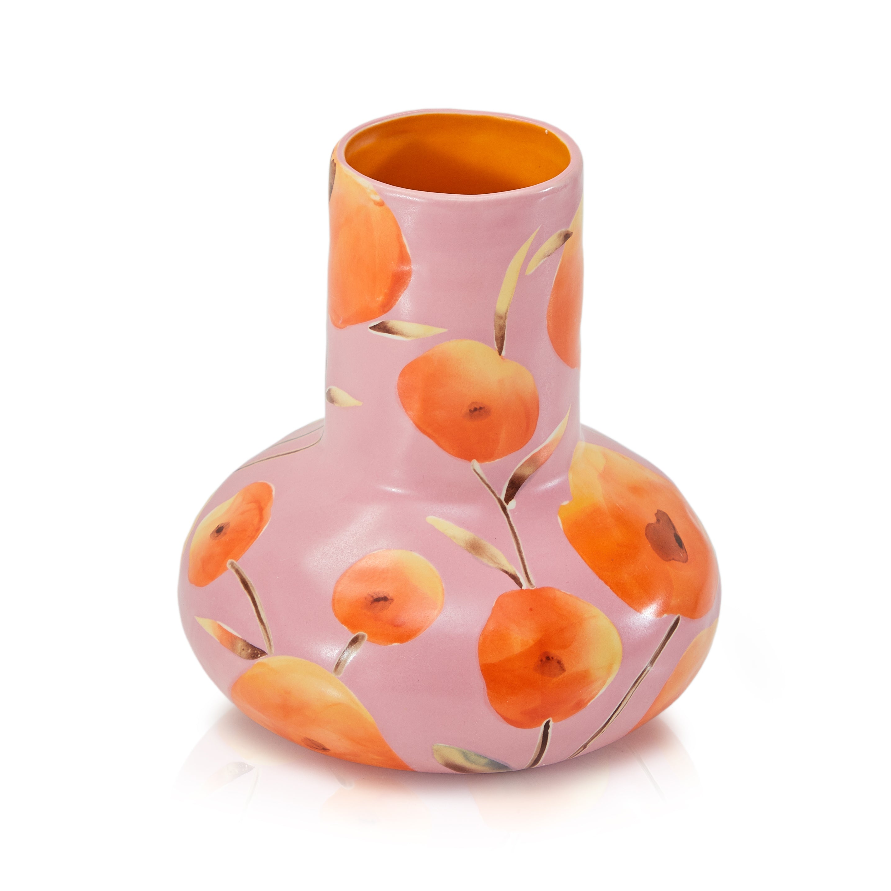 Details: Pink vase with round base, cylindrical neck and painted orange flowers Dimensions: 7" H x 6" W x 6" D