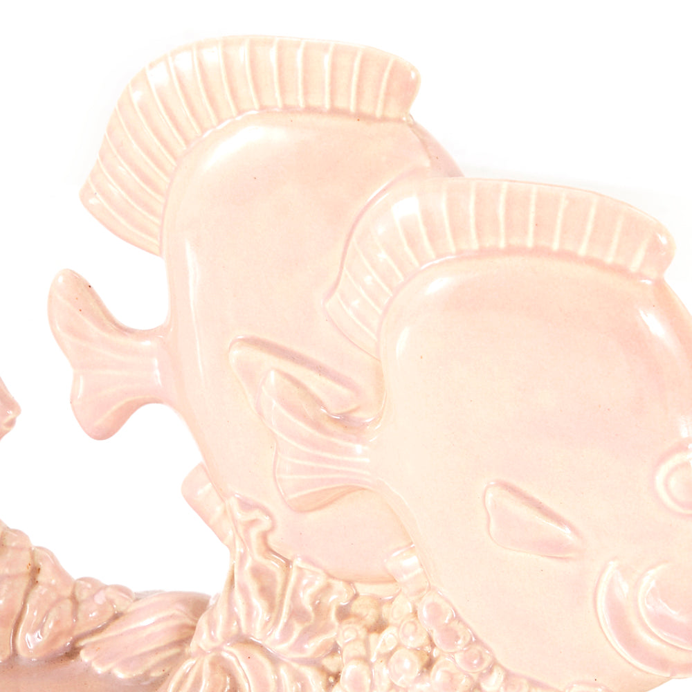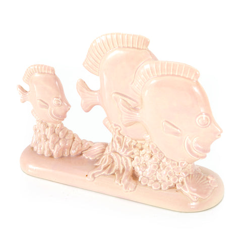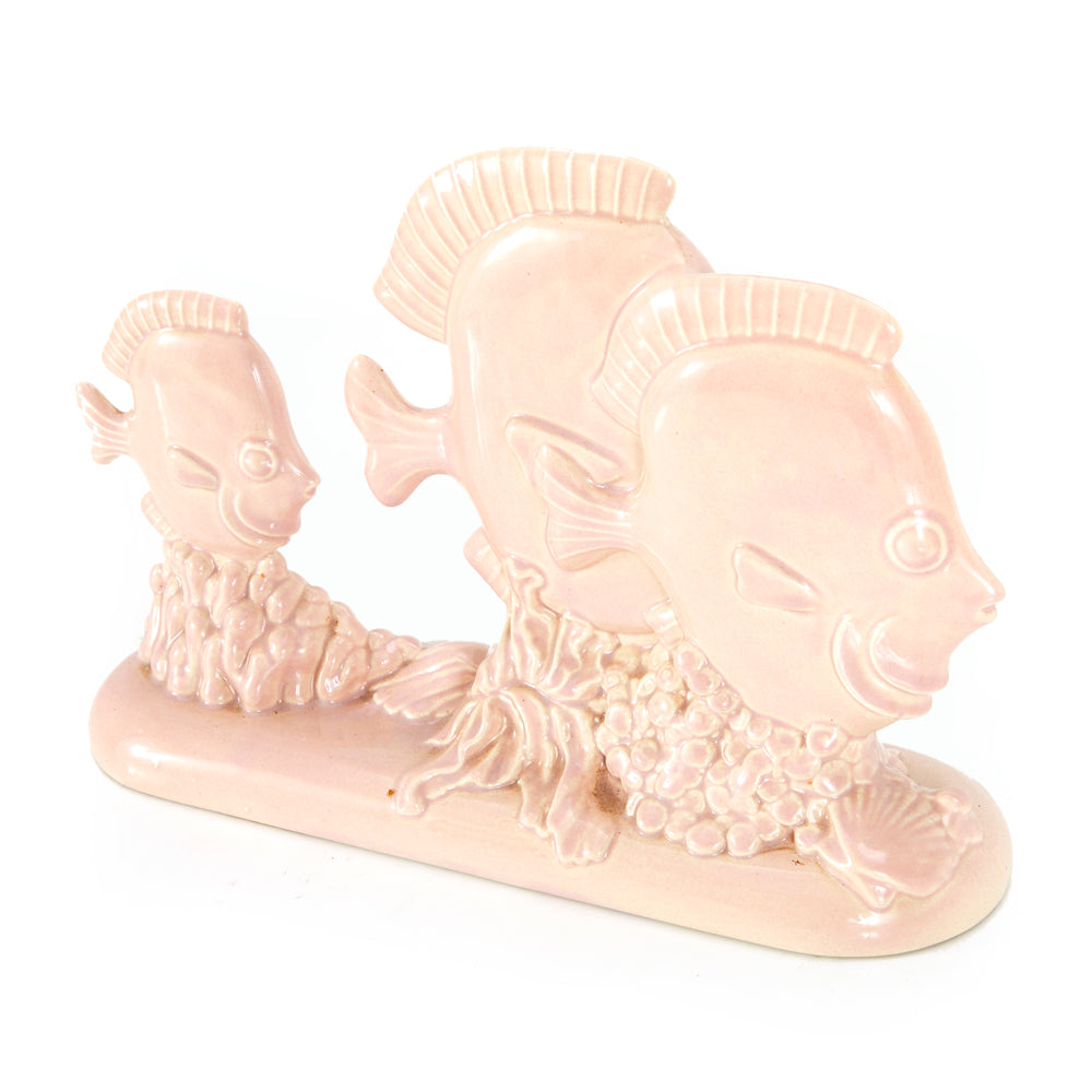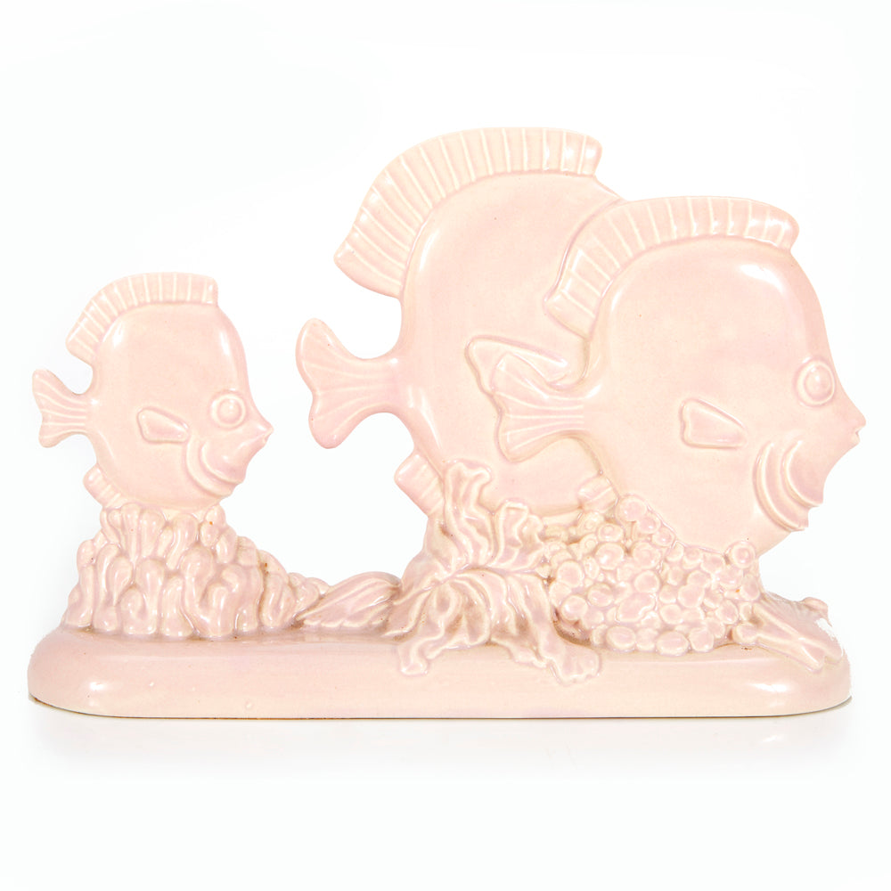 Details: Pink ceramic figures seated, leaning forward and holding hands Dimensions: 7" H x 15" W x 3.5" Quantity: 1