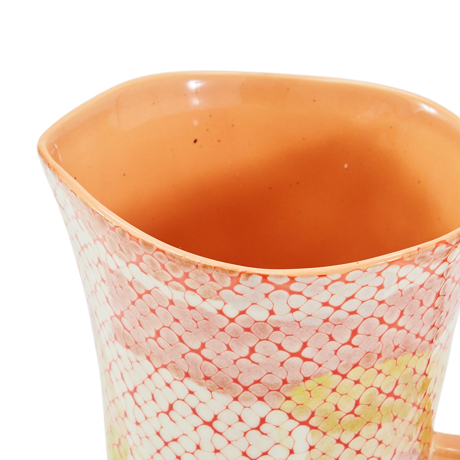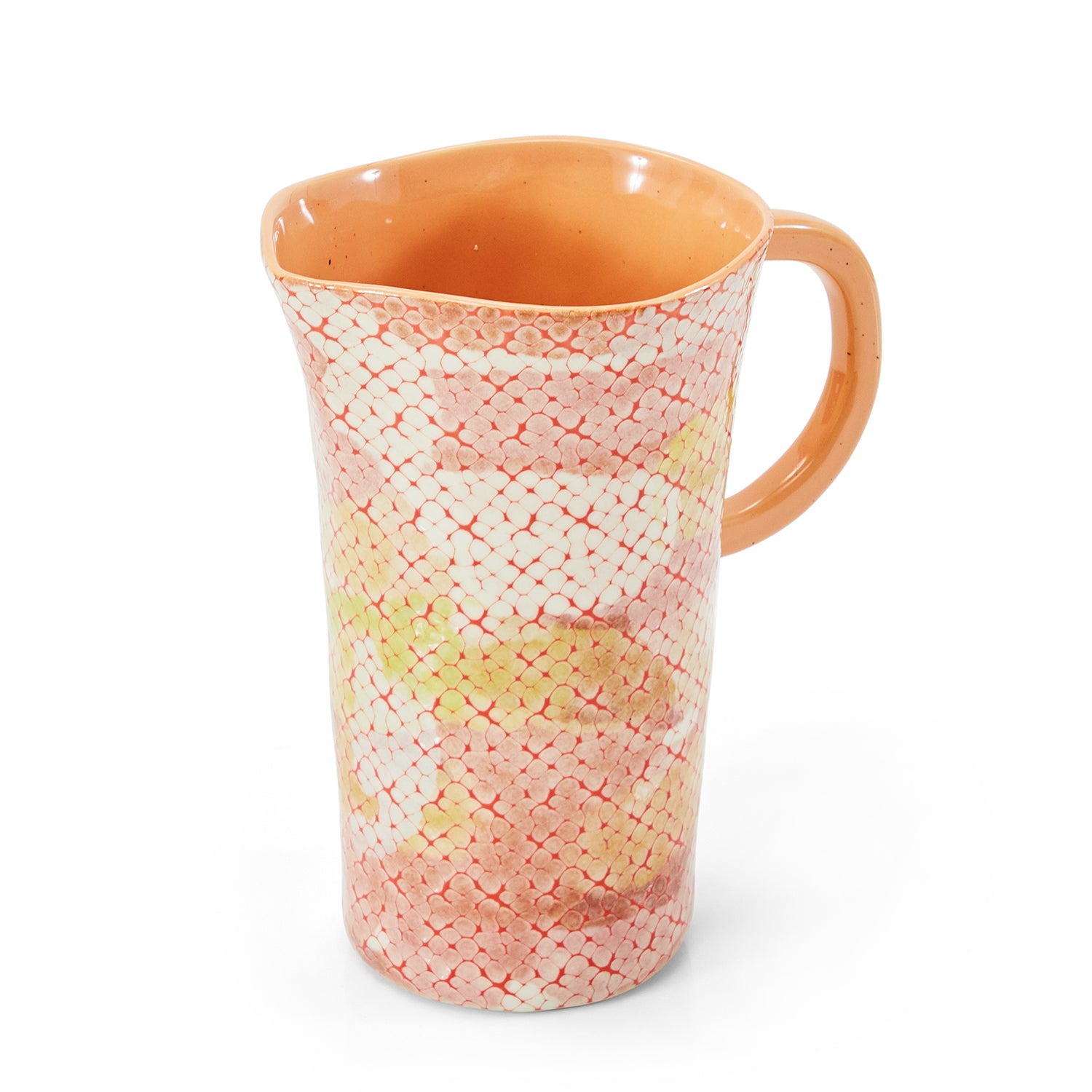 Details: Ceramic pitcher with pink, white, and yellow paint splotches, a red speckle pattern, and orange interior Dimensions: 9" H x 8" W x 5" D...