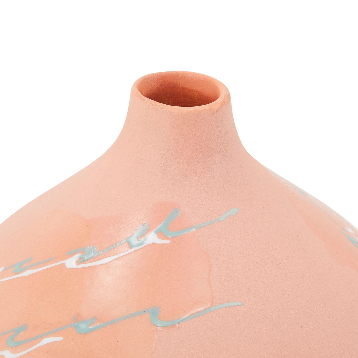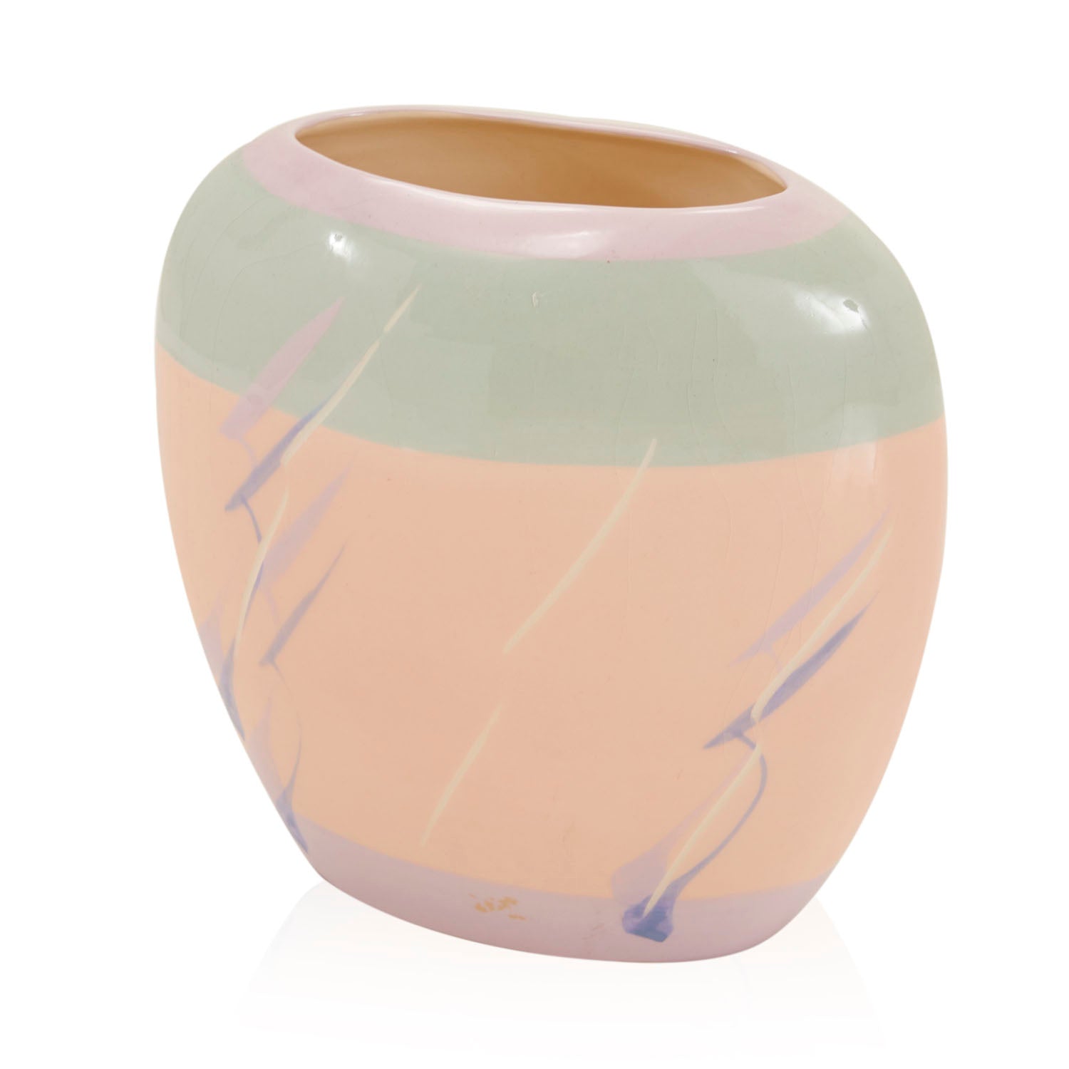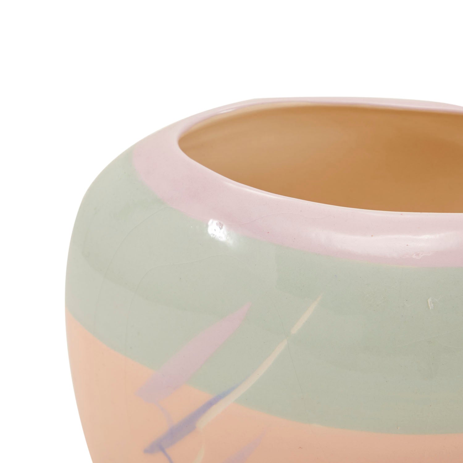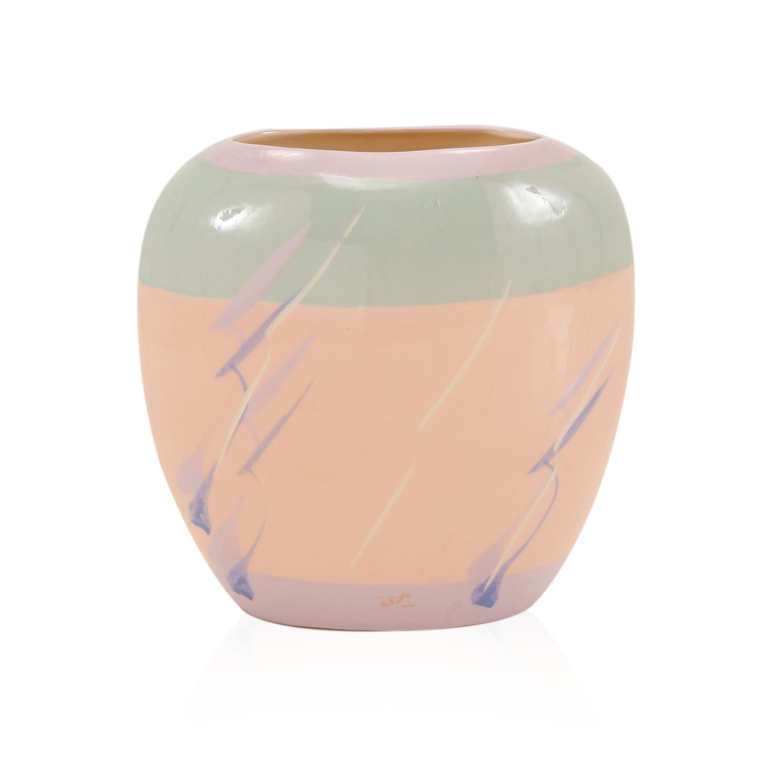 Details: Ceramic vase with pastel pink, green, peach, and purple bands, and abstract flourishes Dimensions: 8" H x 8" W x 4" D
