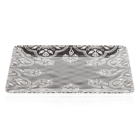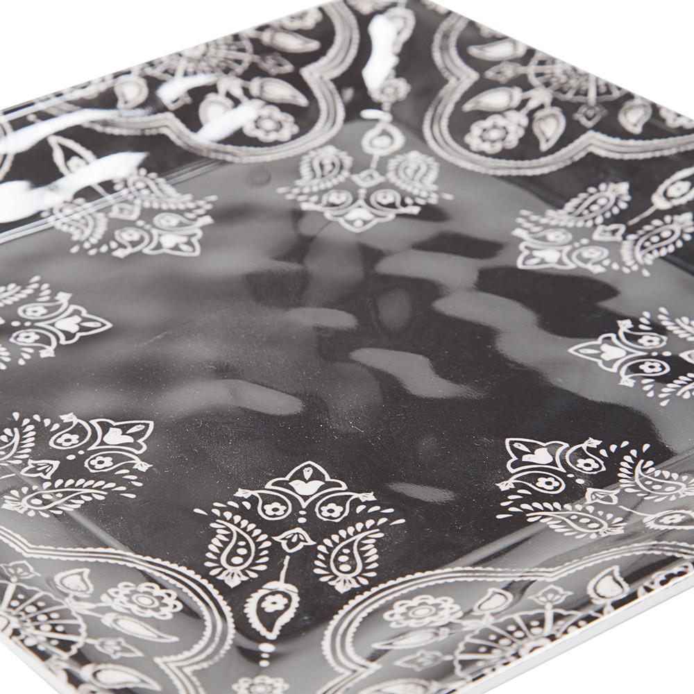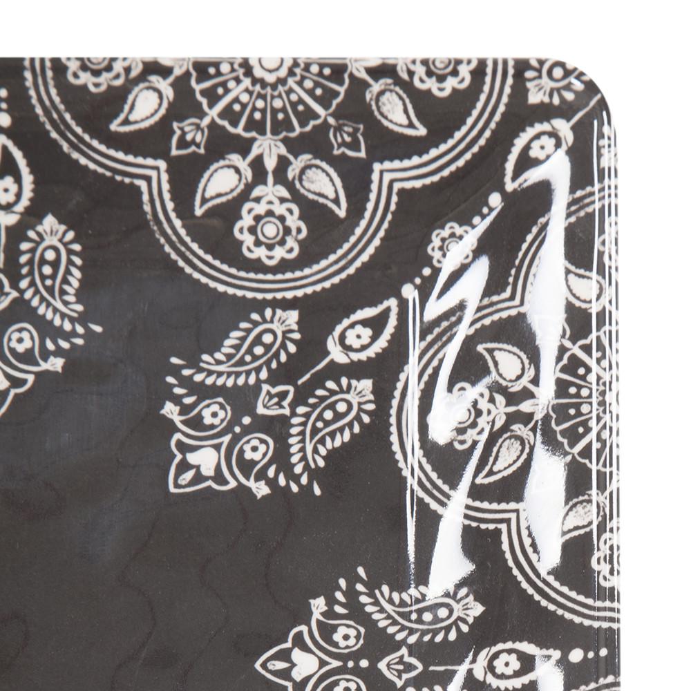 Details: Brown plastic tray with digital printed woven design. Dimensions: 4" W X 6.5" L